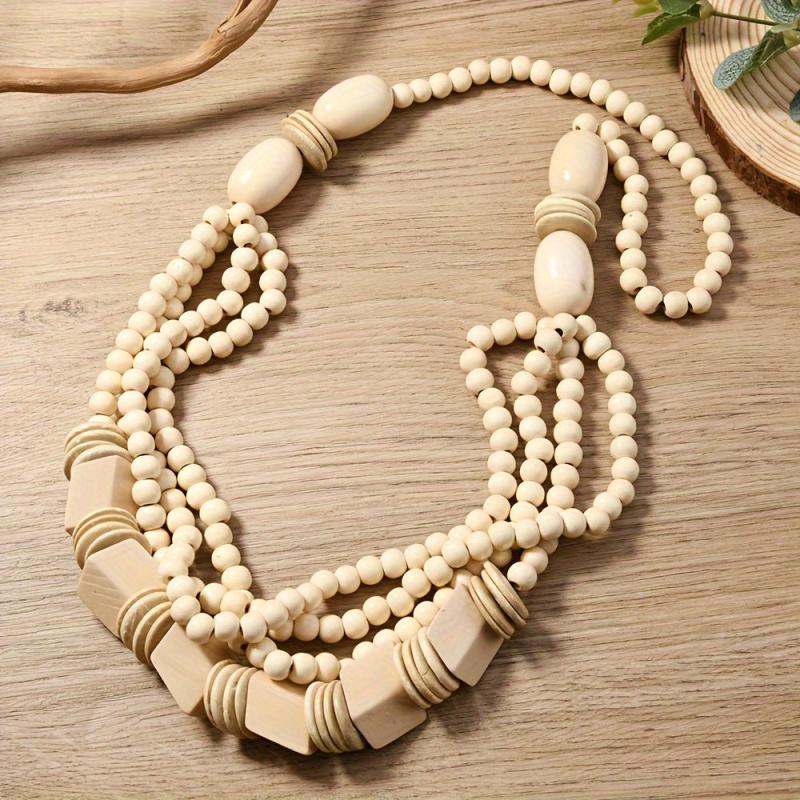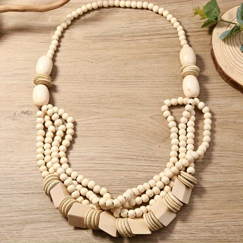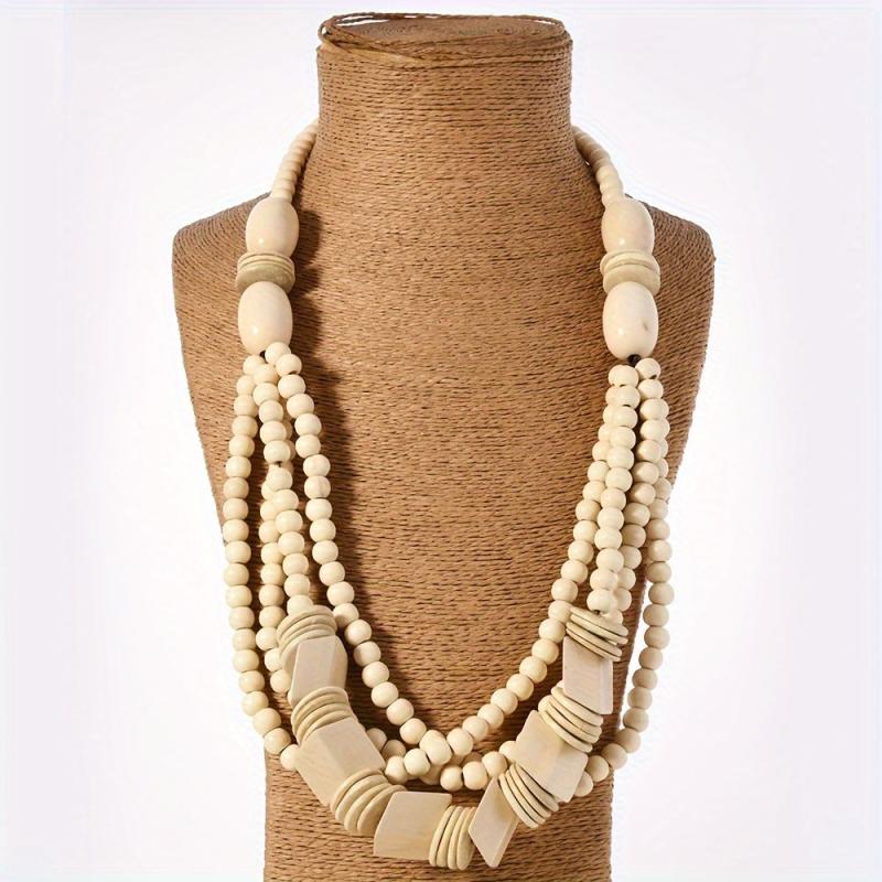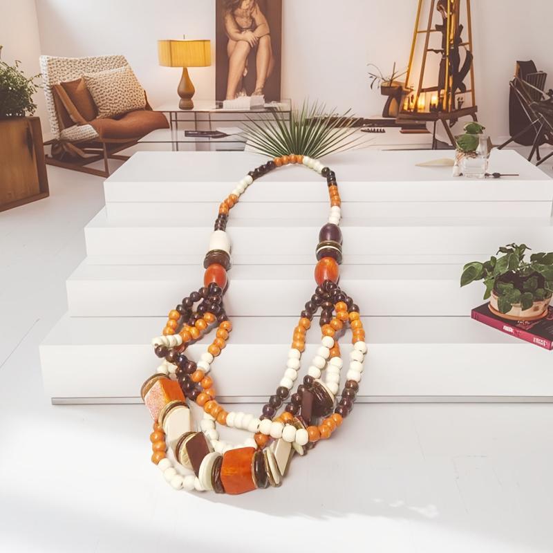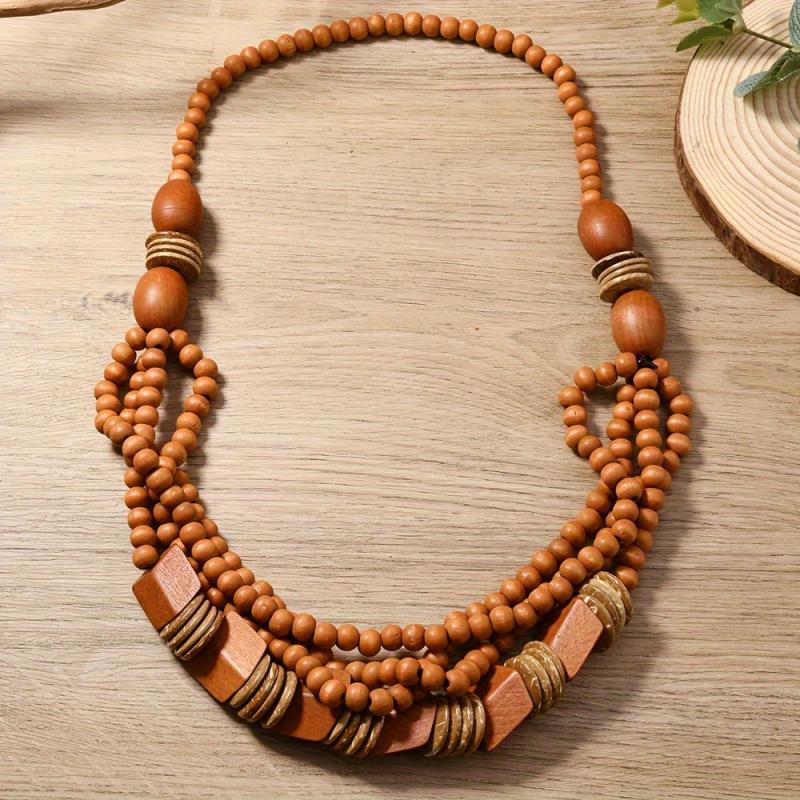 Bohemian Layer Necklace Vintage High Recycled Wood & Coconut Beads Earthy Tones
