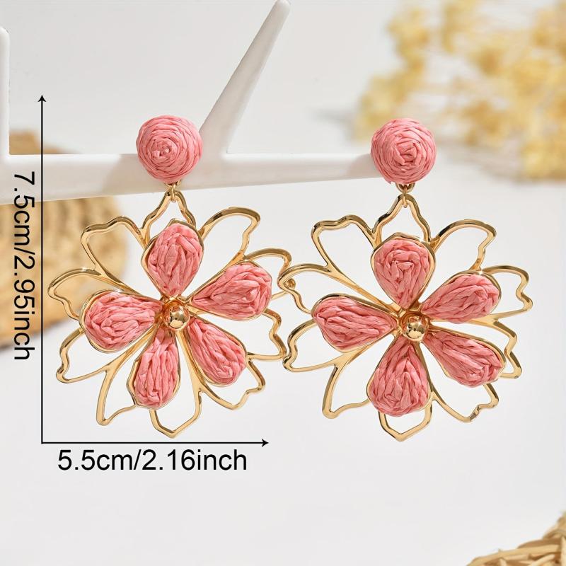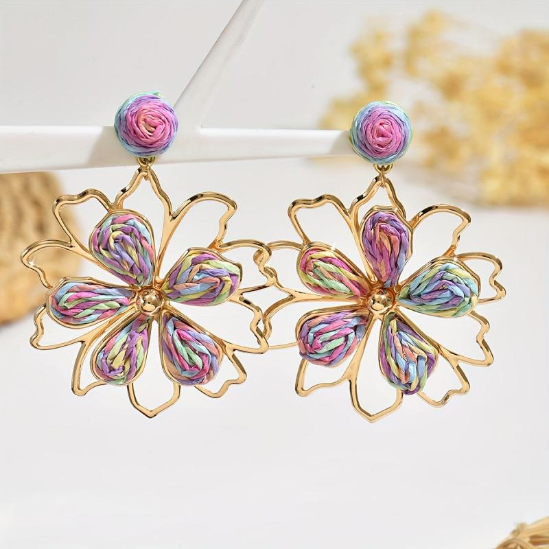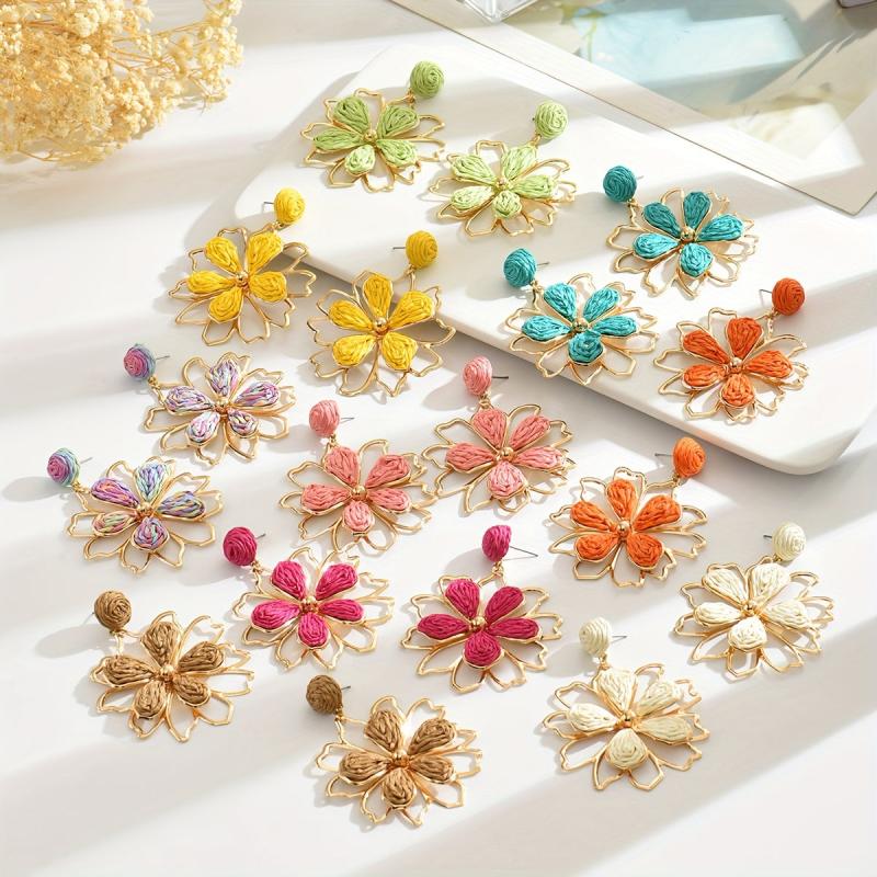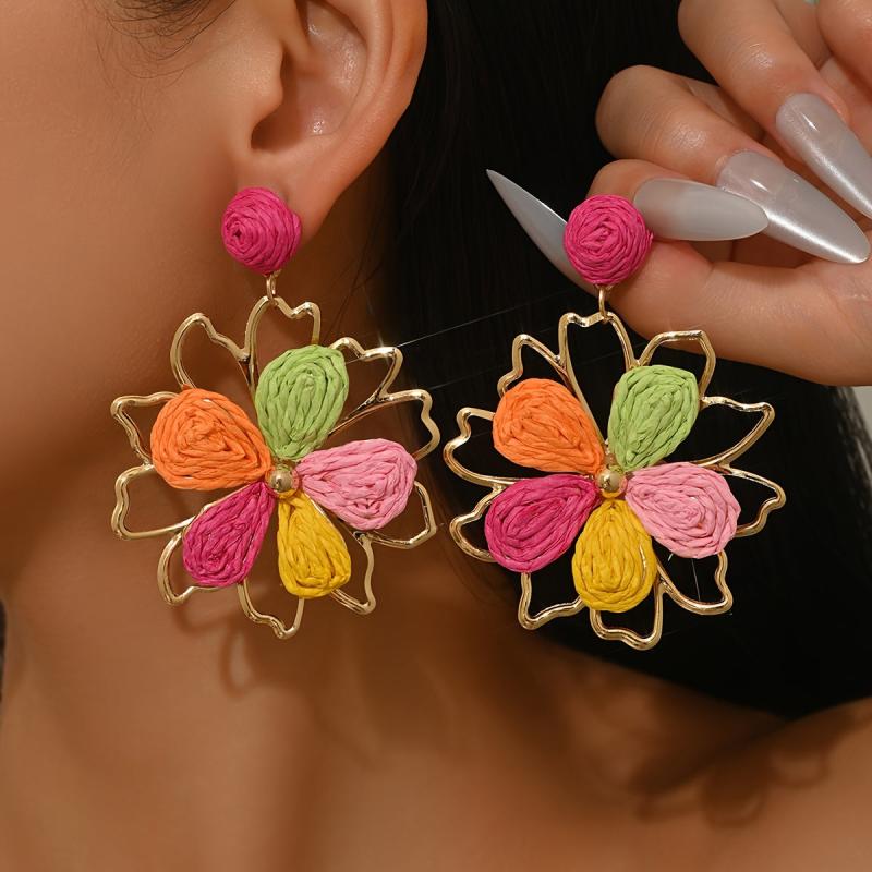 These lightweight and durable Bohemian earrings are perfect for daily wear or vacation. They feature vibrant Raffia grass flowers with golden tone accents.