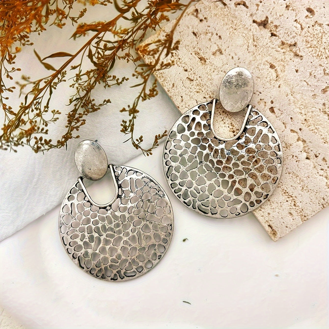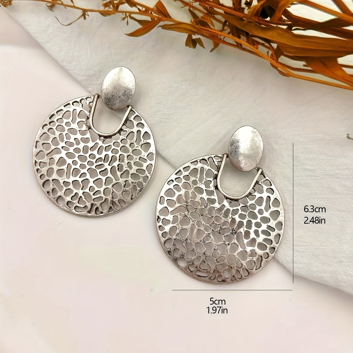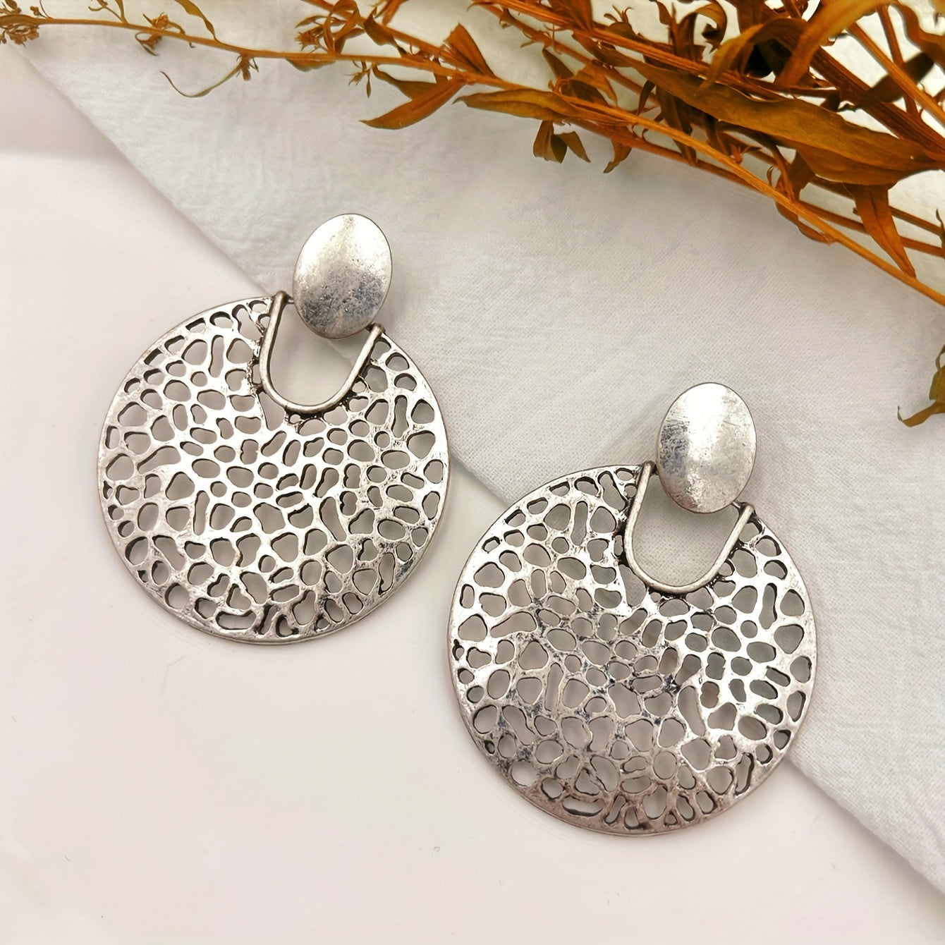 These large earrings feature an exaggerated geometric design in an antique silver finish, perfect for daily wear.