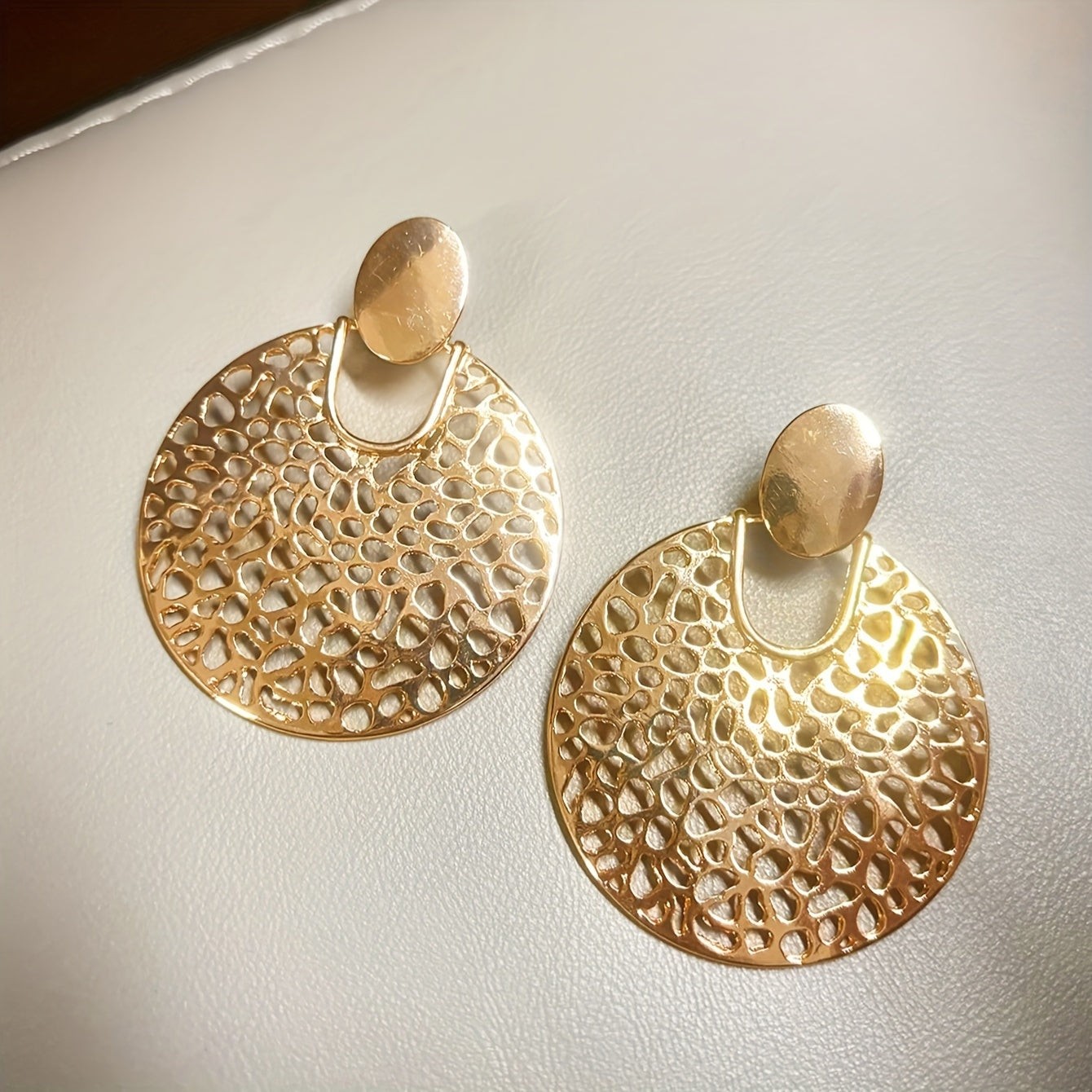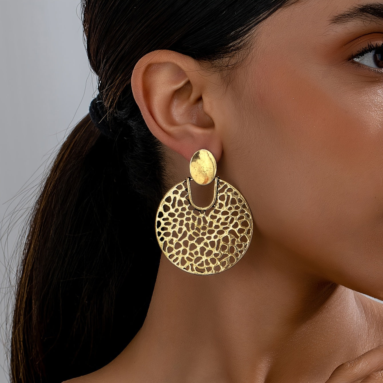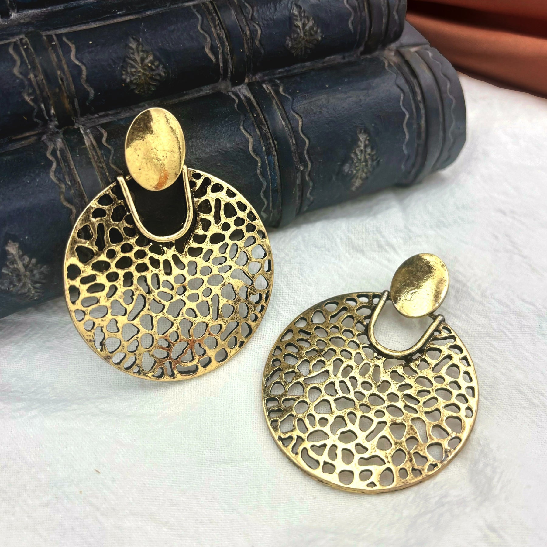 These large earrings feature an exaggerated geometric design in an antique silver finish, perfect for daily wear.