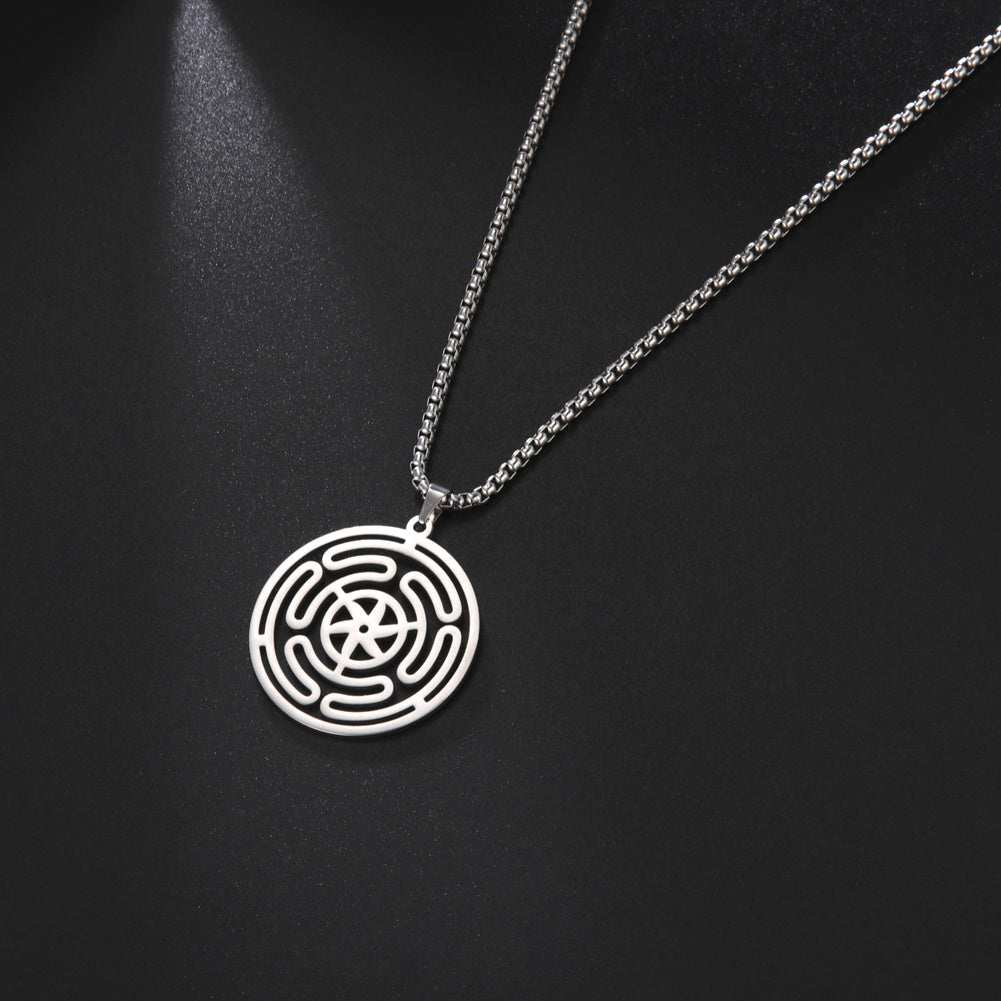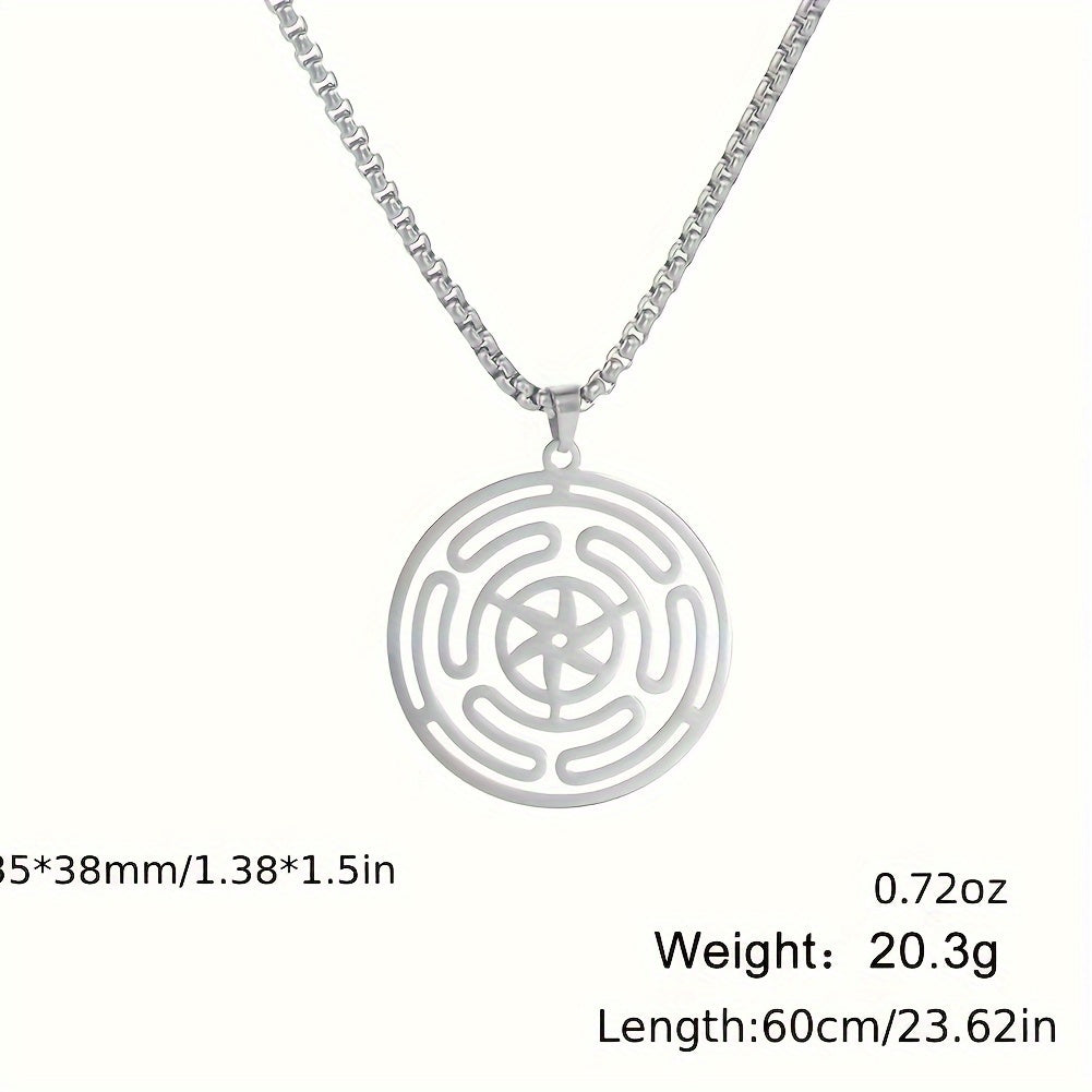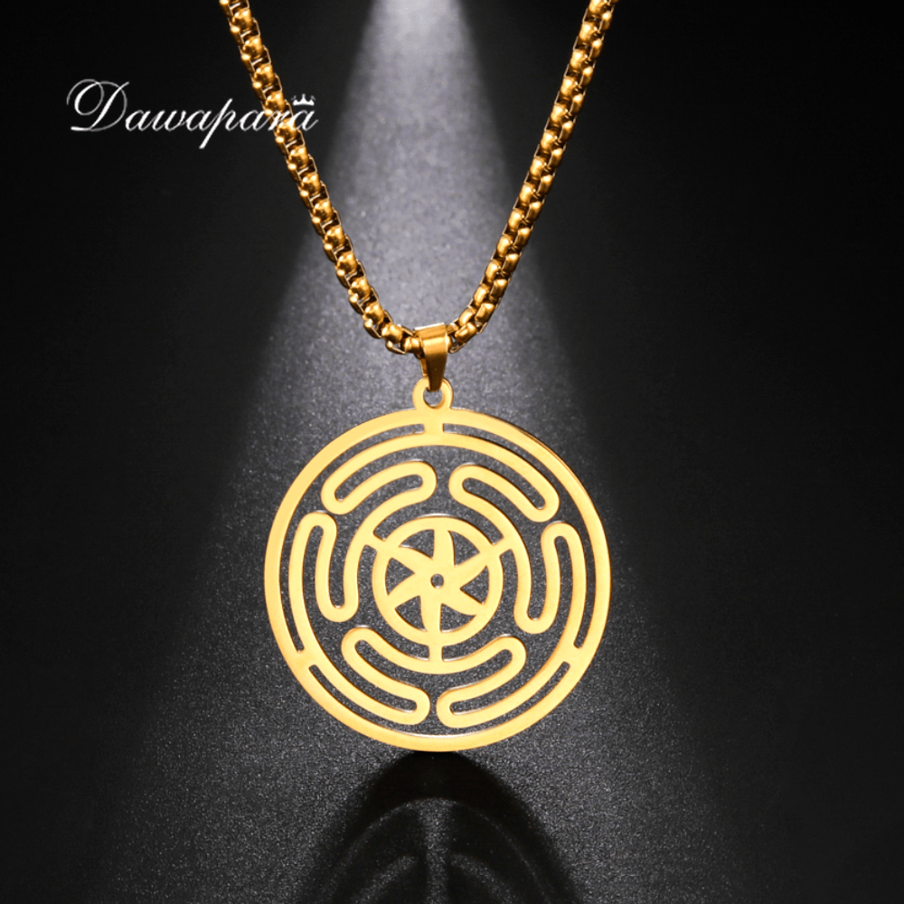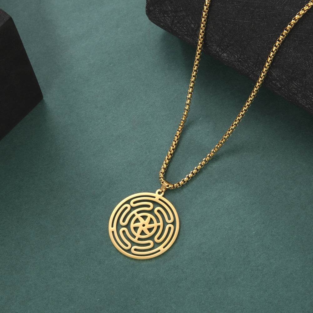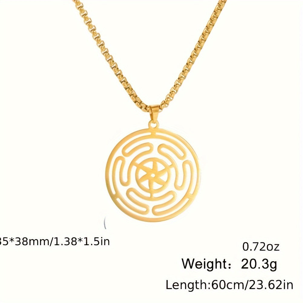 This KKJOY Bohemian Triskelion necklace features a geometric Hecate symbol pendant with a golden tone finish, perfect for men and women who appreciate unique jewelry pieces.