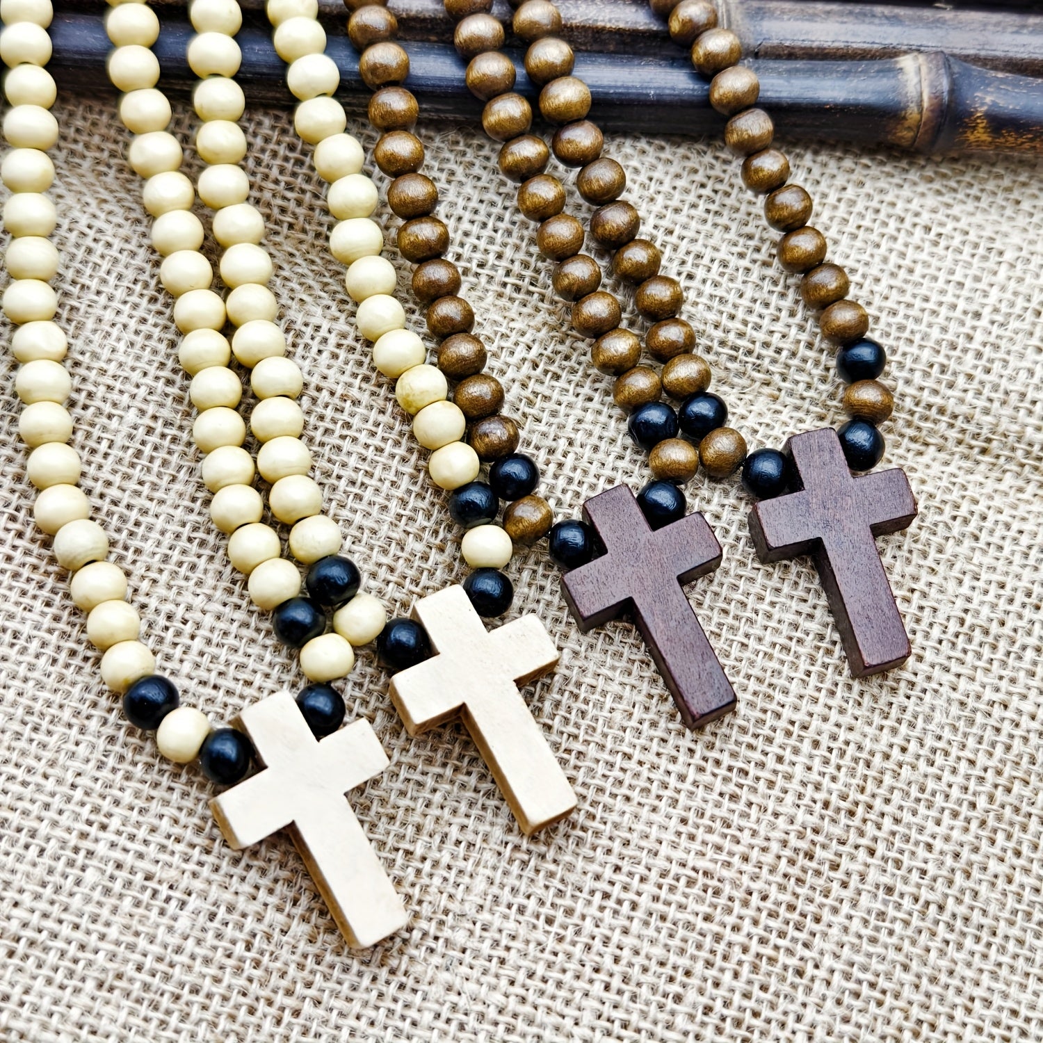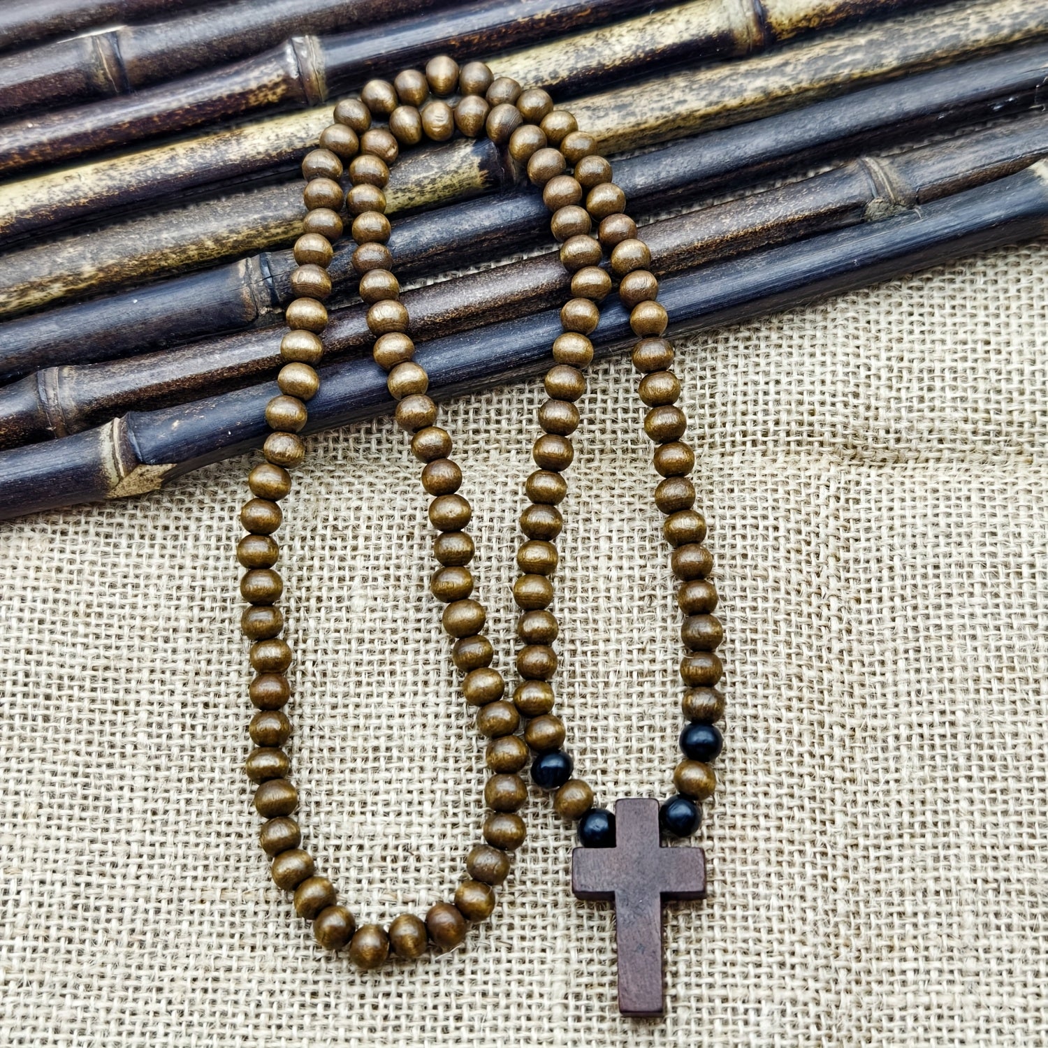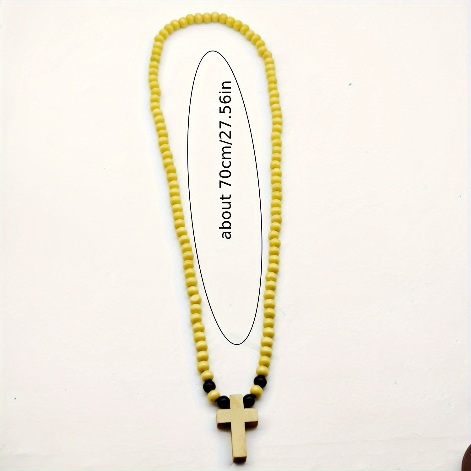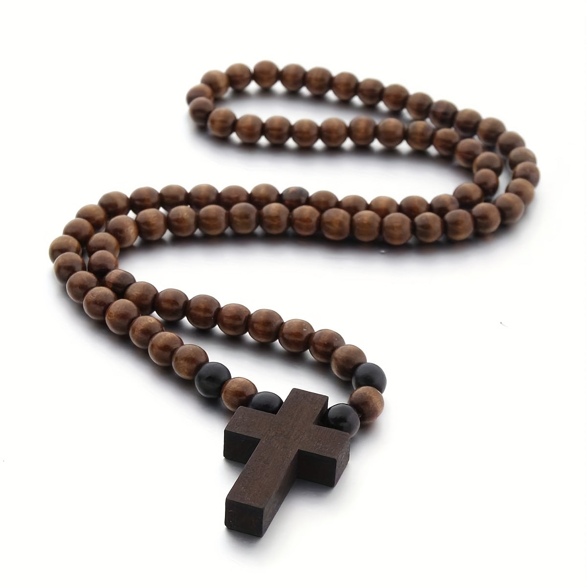 This men's ethnic necklace features a handwoven design with natural wood beads and a rustic uncoated wood cross pendant. Perfect for casual attire and makes a unique gift.