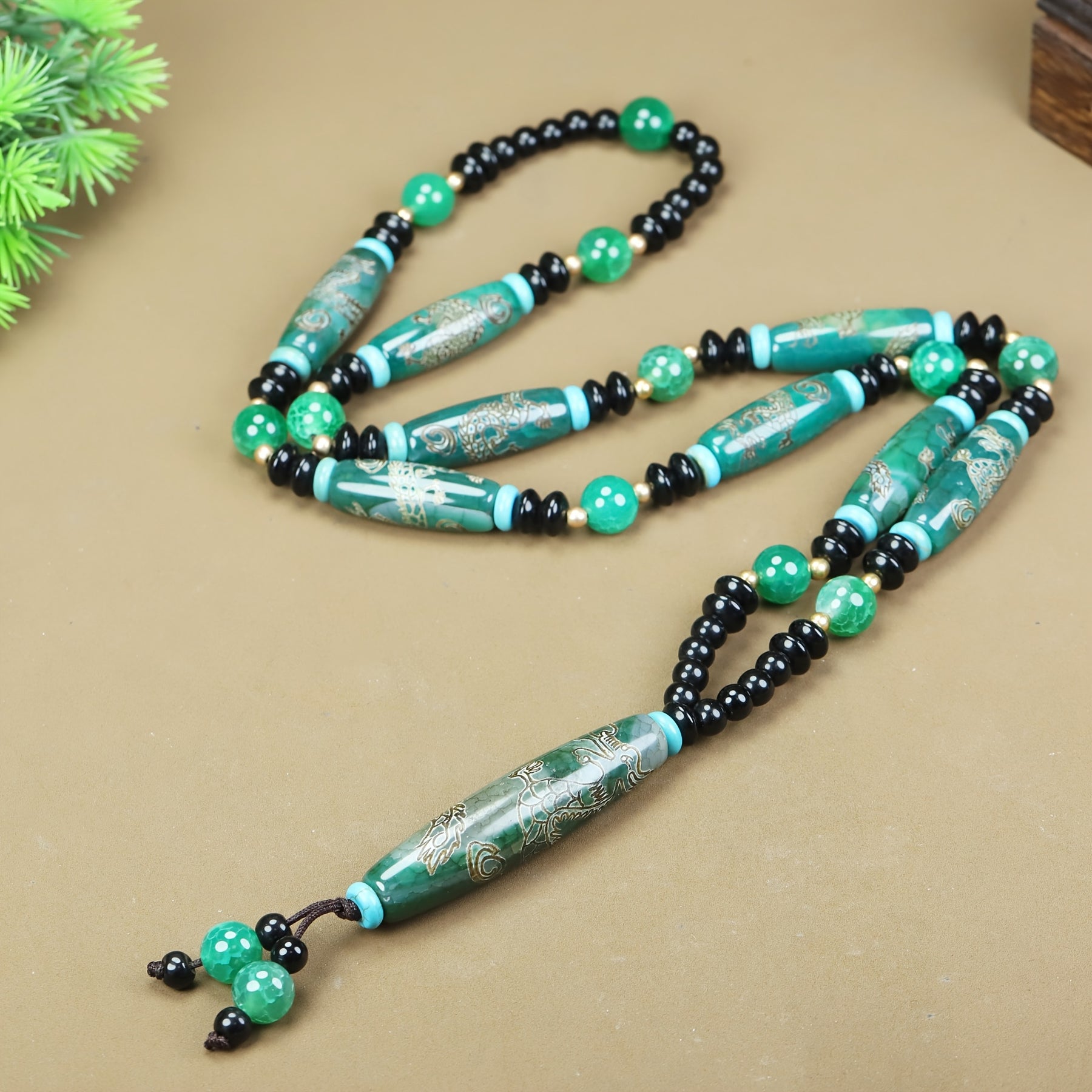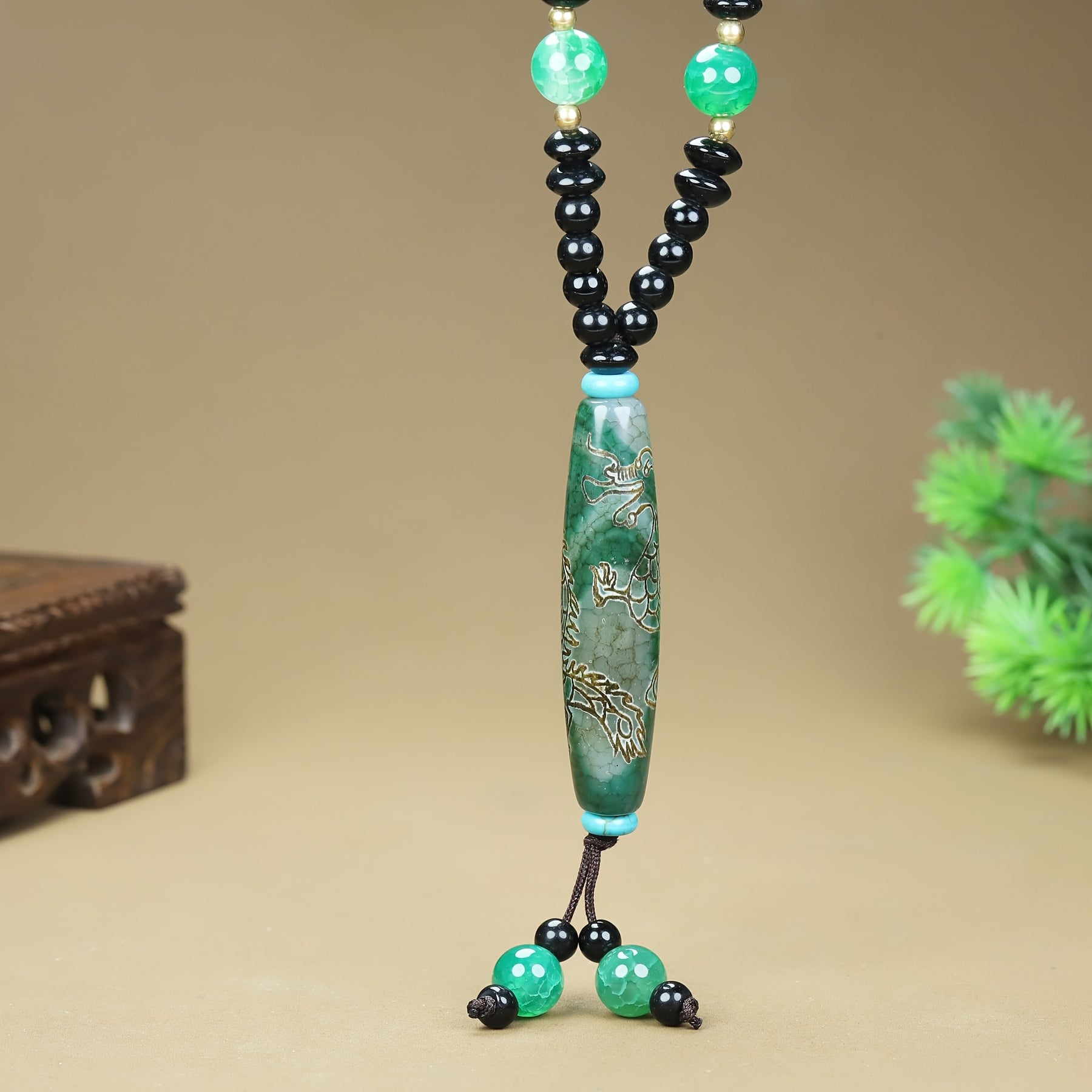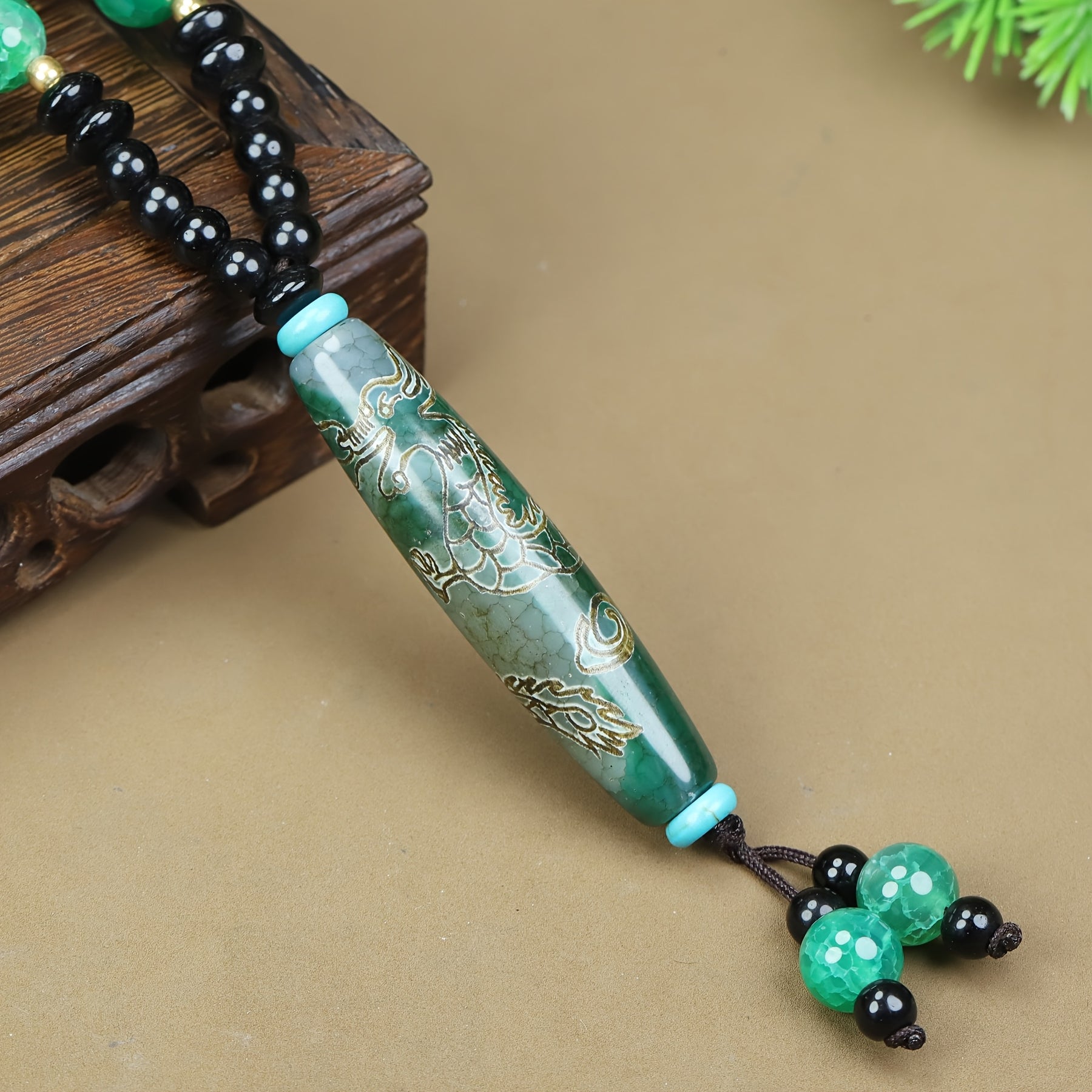 Boho Agate Dragon Pendant Necklace w/ Green Beads & Golden Engraving