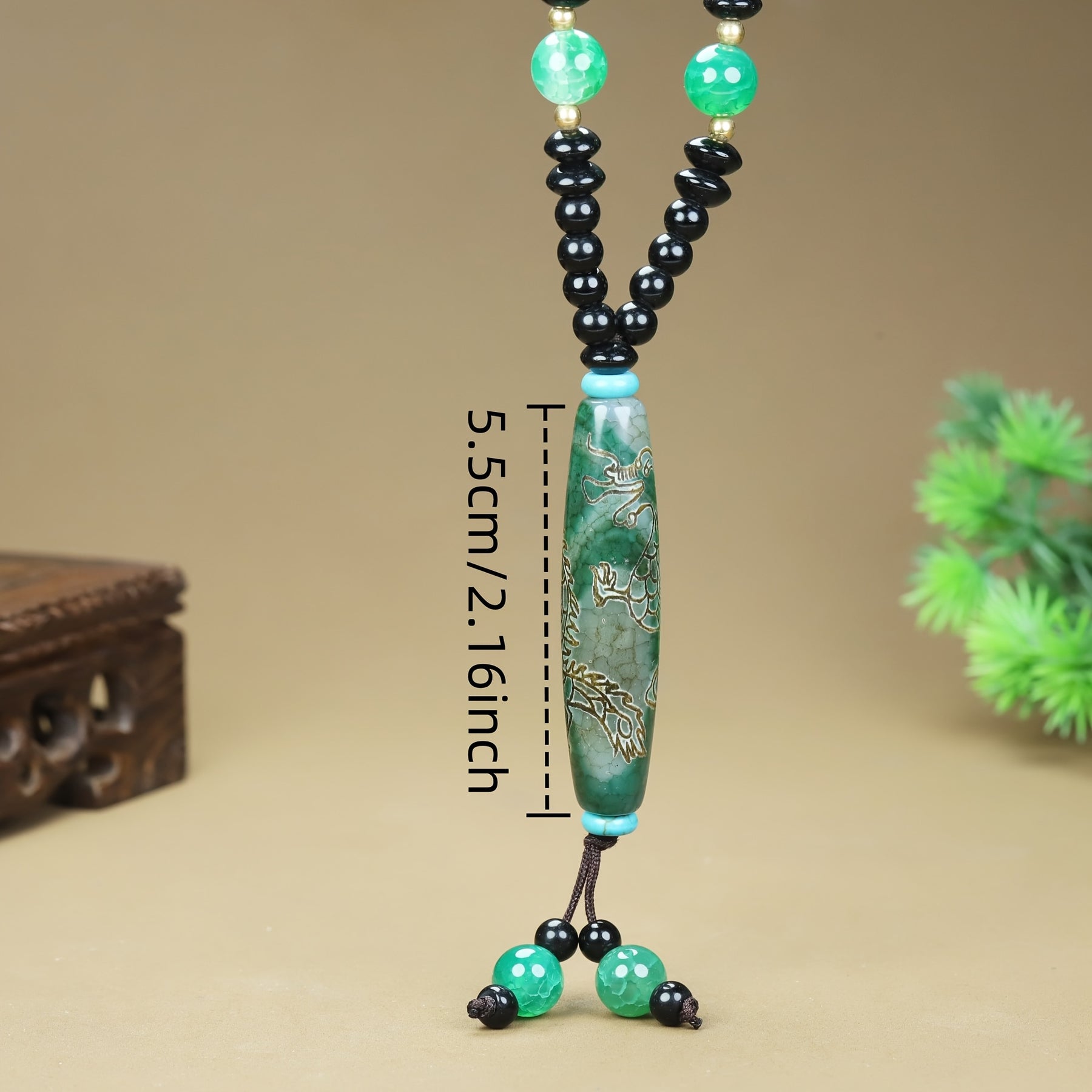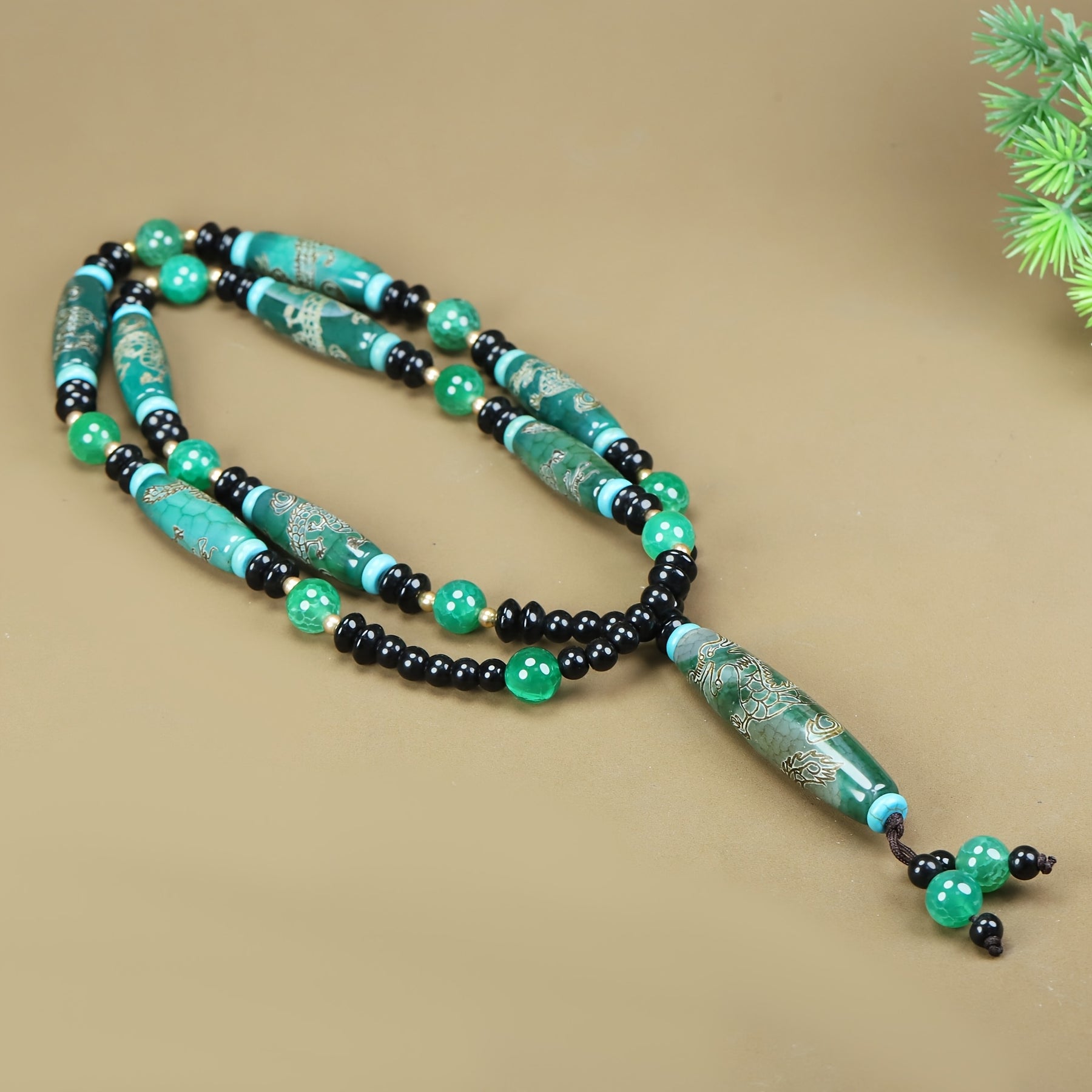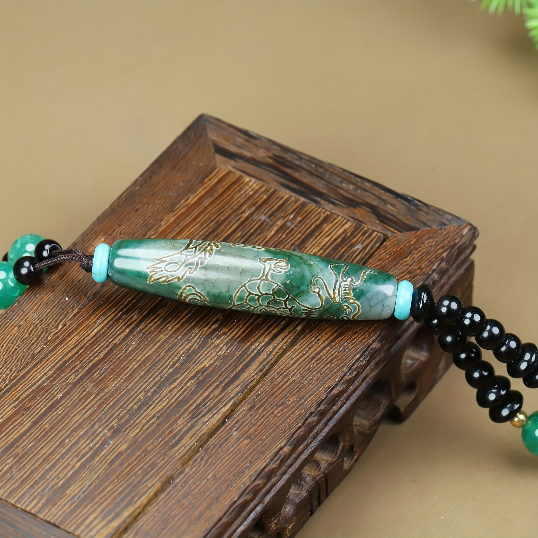 Boho Agate Dragon Pendant Necklace w/ Green Beads & Golden Engraving