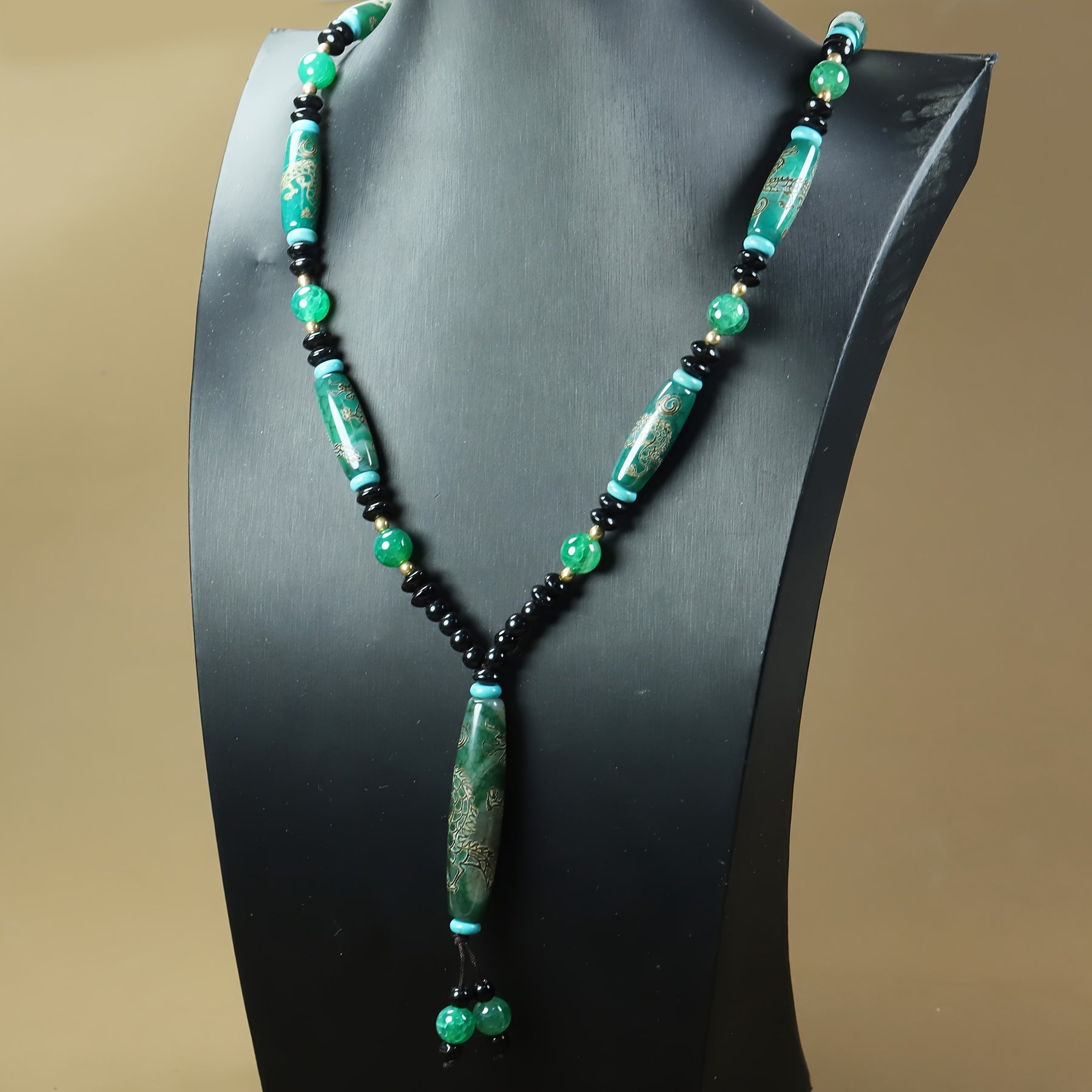 Add a touch of bohemian style to your look with this intricate agate dragon pendant necklace. Featuring green beads and golden engraving, this necklace is perfect for men and makes an ideal holiday gift or festive accessory.