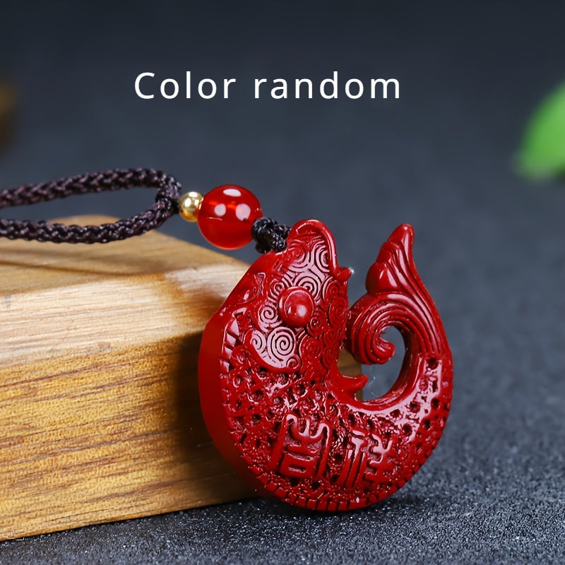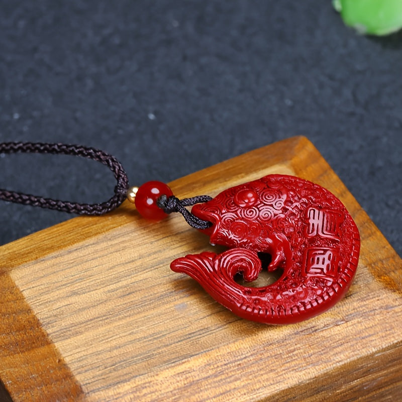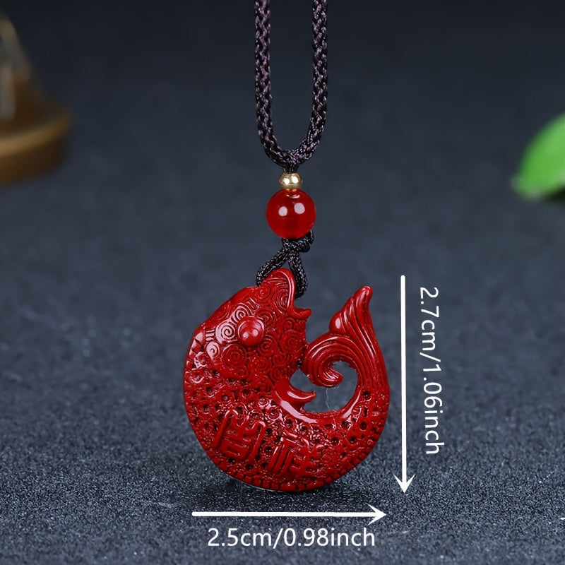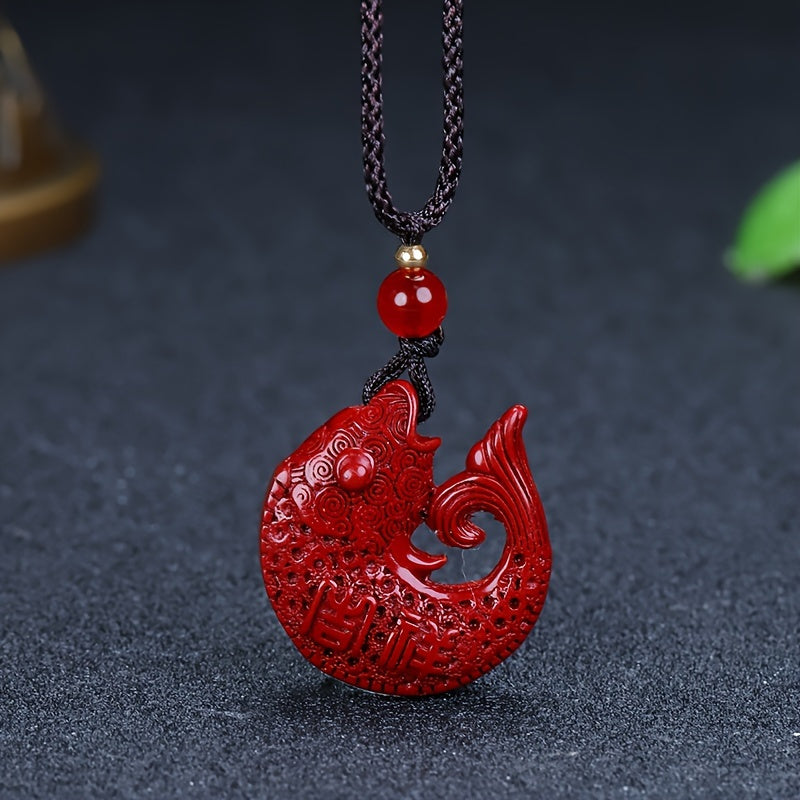 Boho Cinnabar Stone Fish Pendant Necklace Ethnic Style Hand Carved Amul
