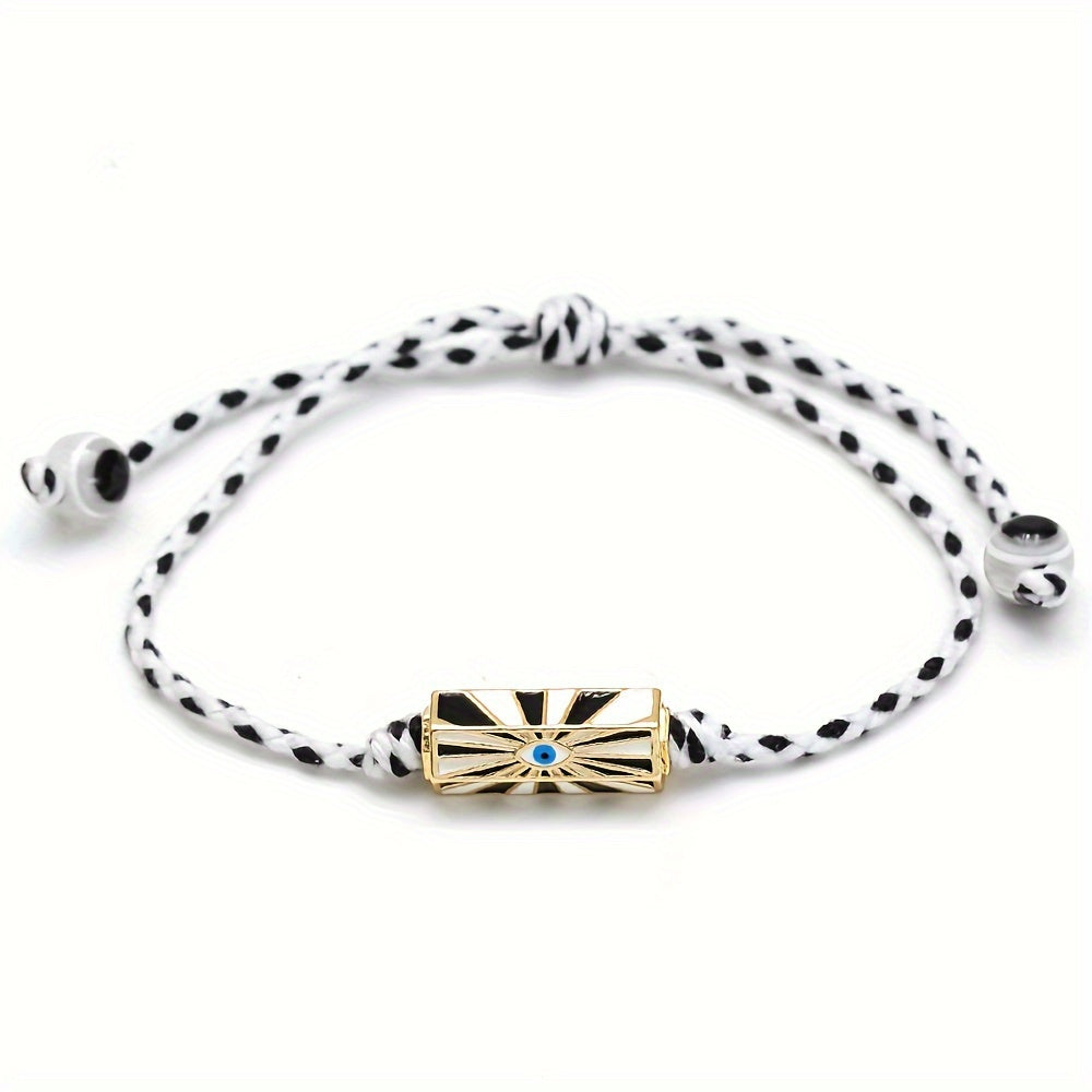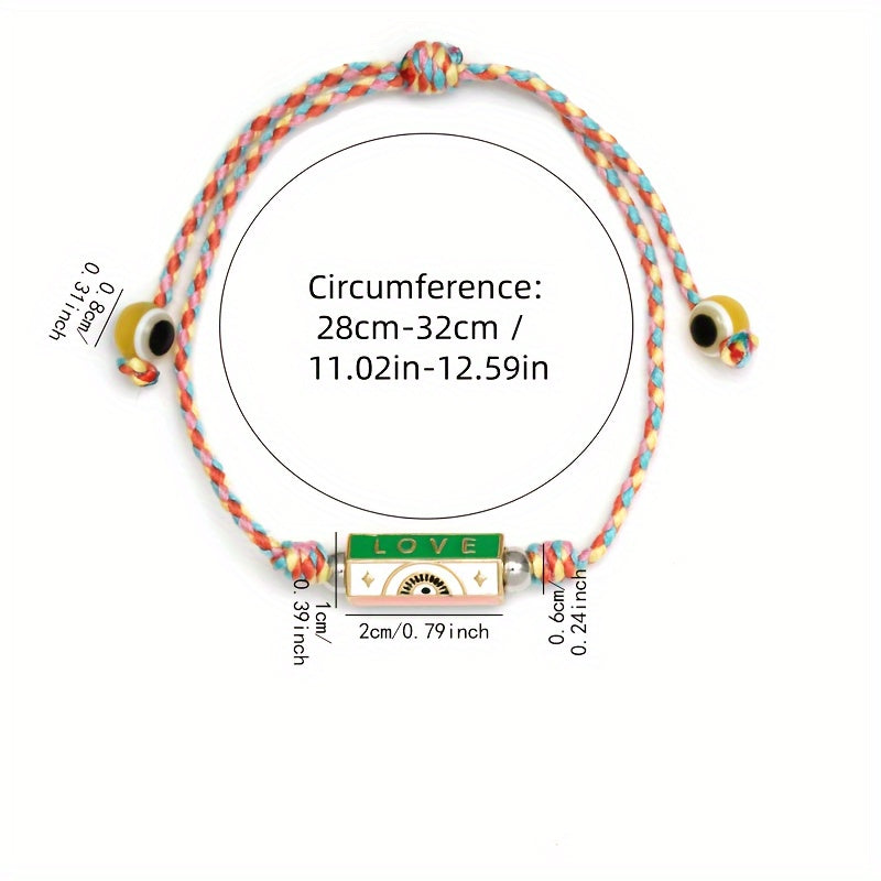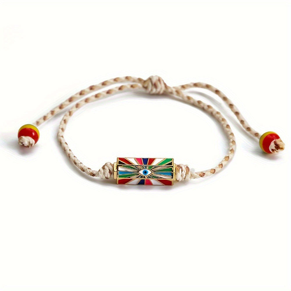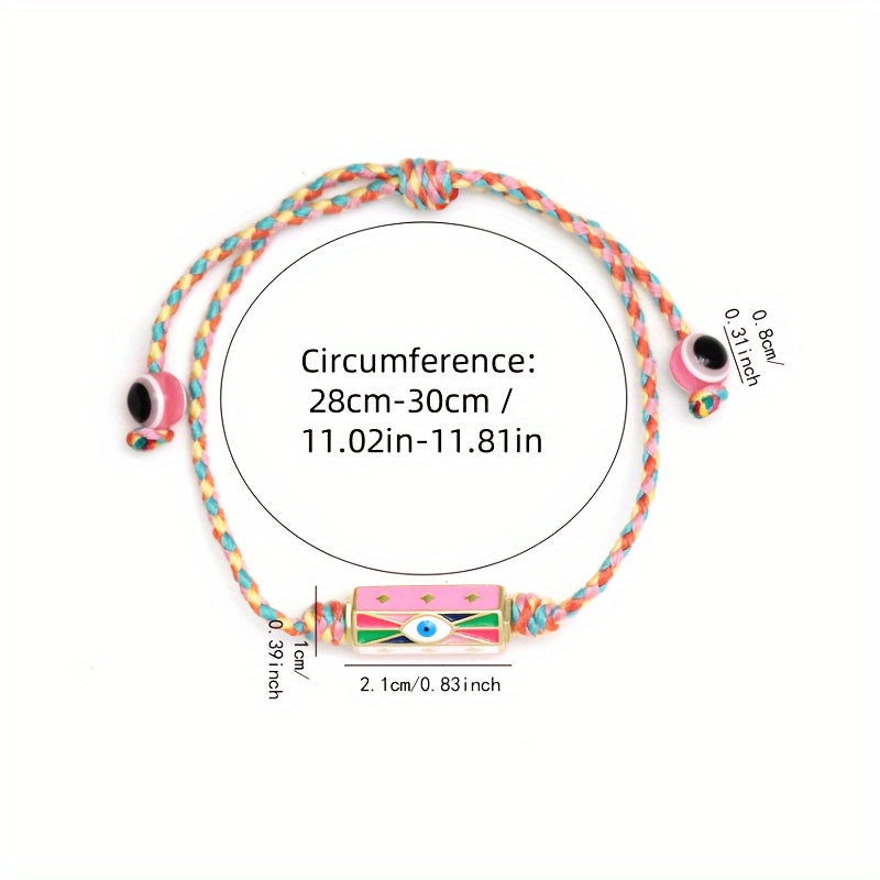 This adjustable bracelet features a lucky eye design, made of braided rope in vibrant colors. Perfect for adding a bohemian touch to your look.