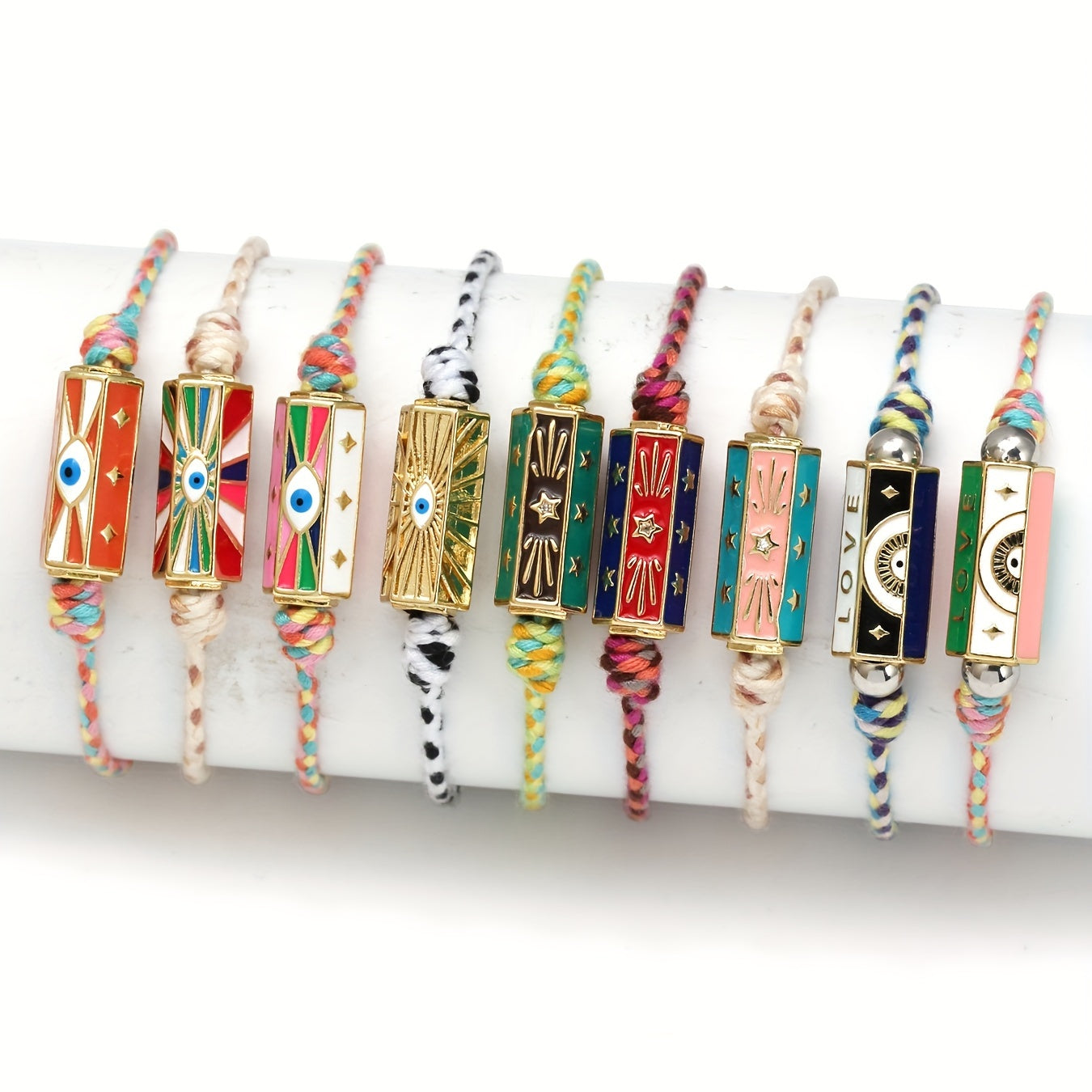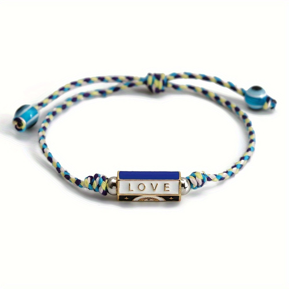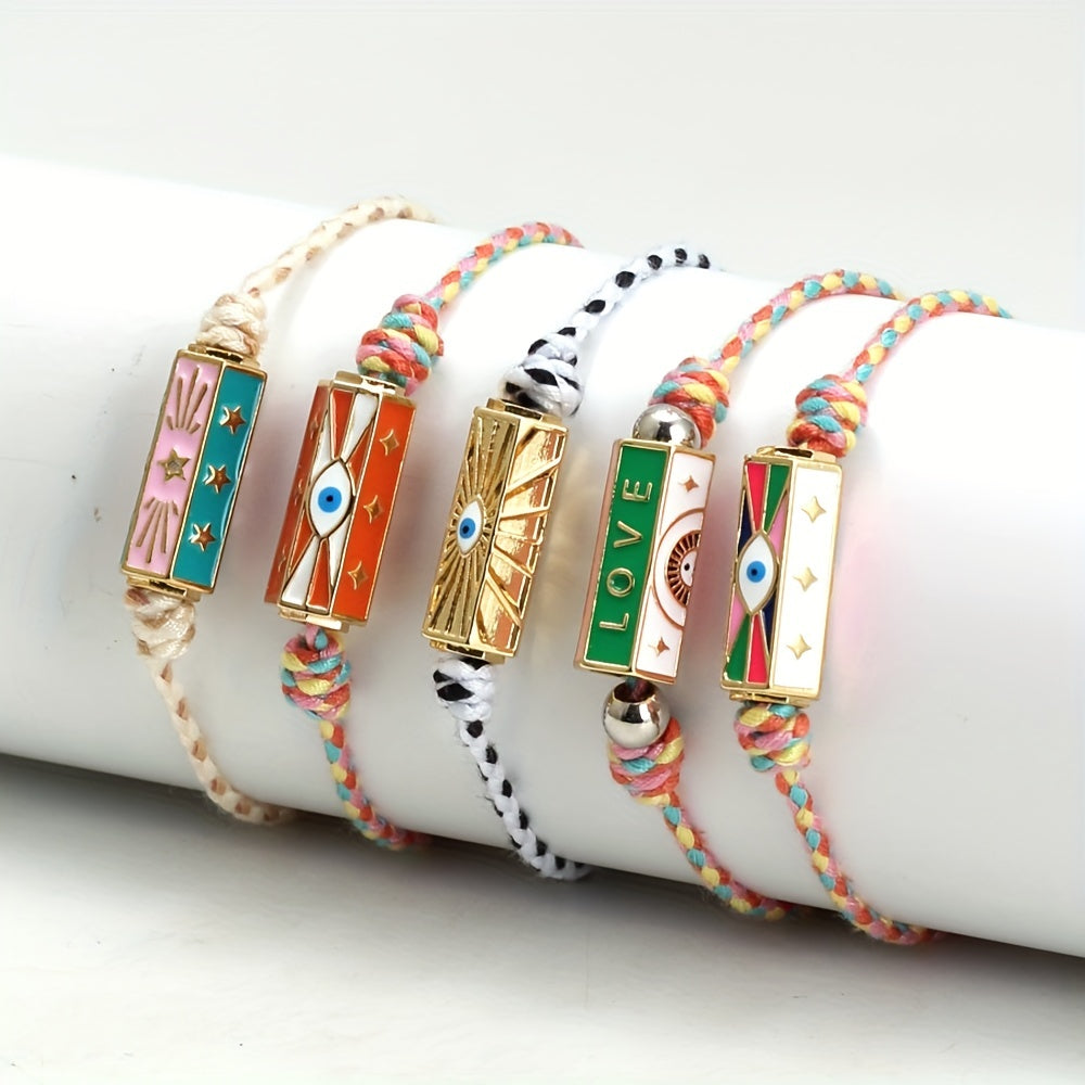 This adjustable bracelet features a lucky eye design, made of braided rope in vibrant colors. Perfect for adding a bohemian touch to your look.