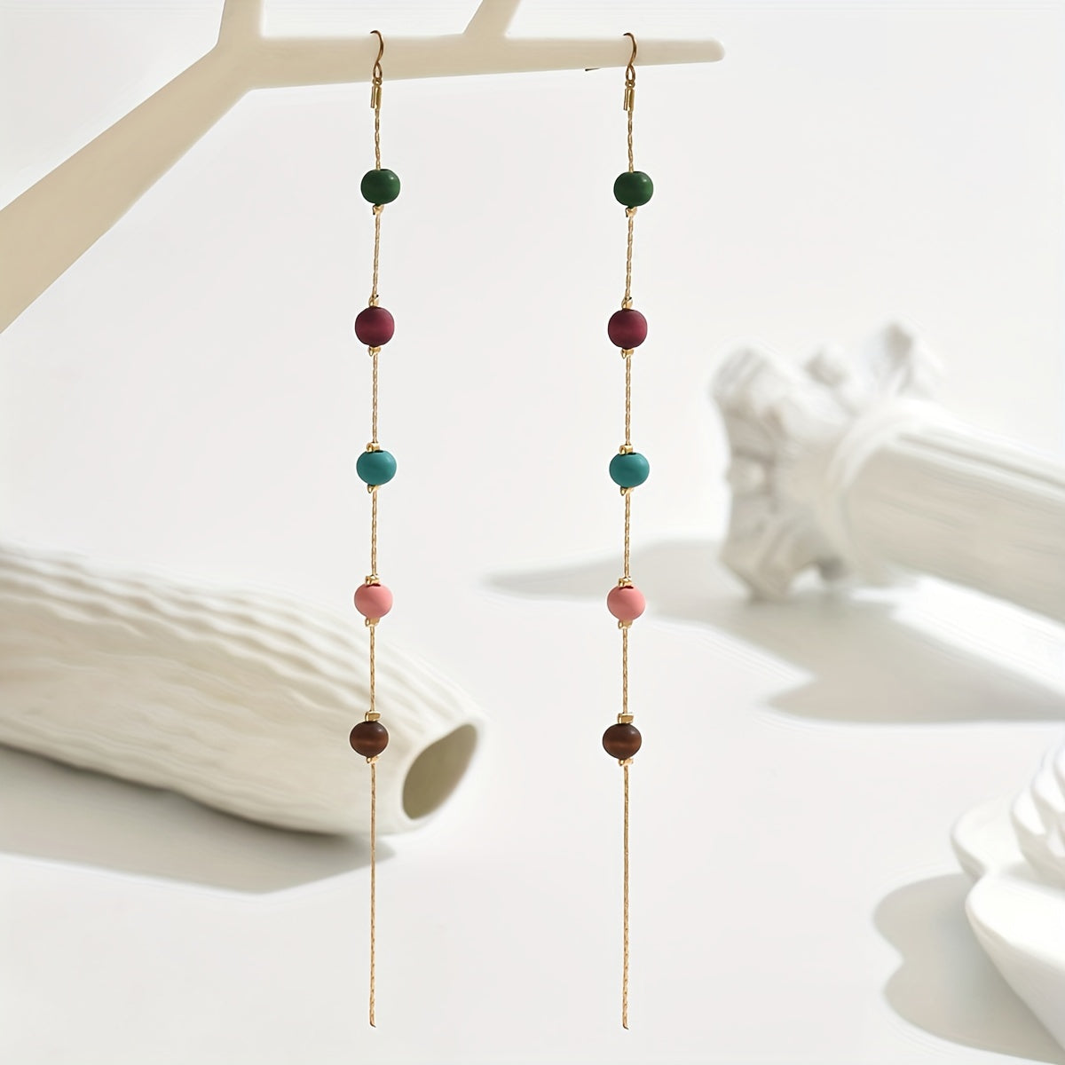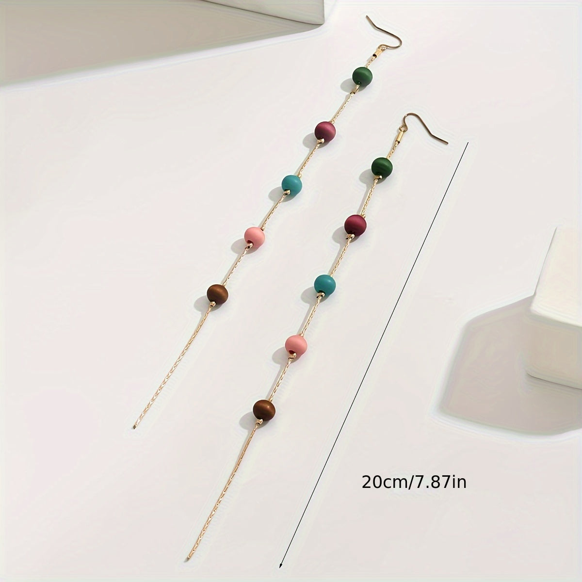 Elevate your casual look with these Boho vintage tassel earrings featuring cascading green, pink, and brown wooden beads. These earrings are perfect for adding a pop of color to your outfit.