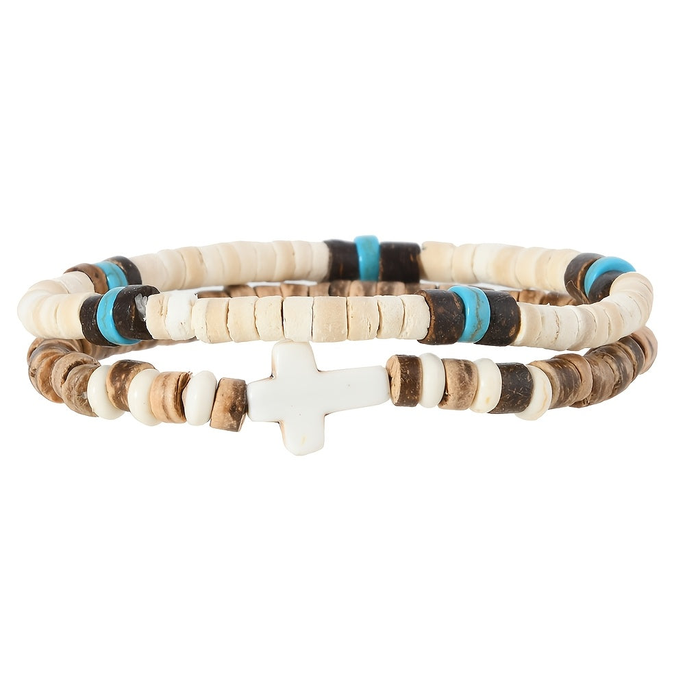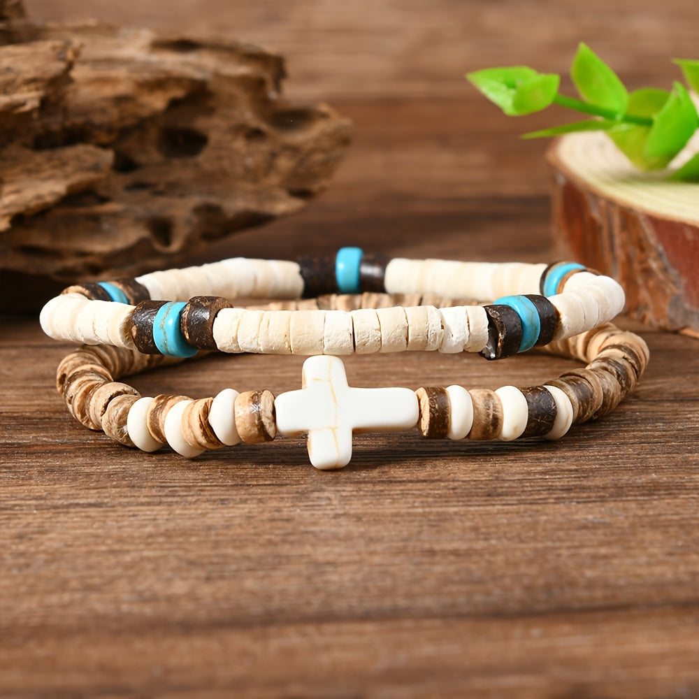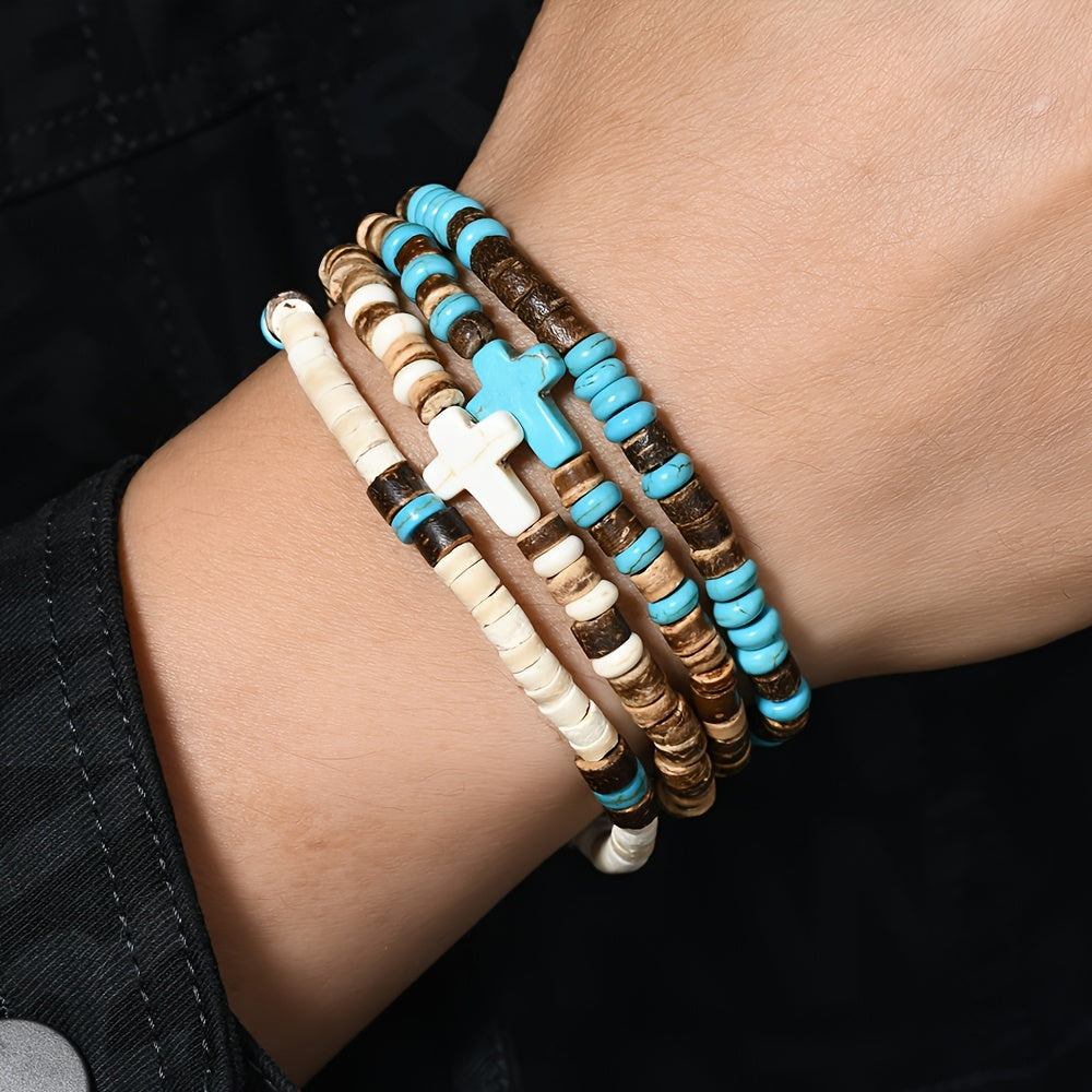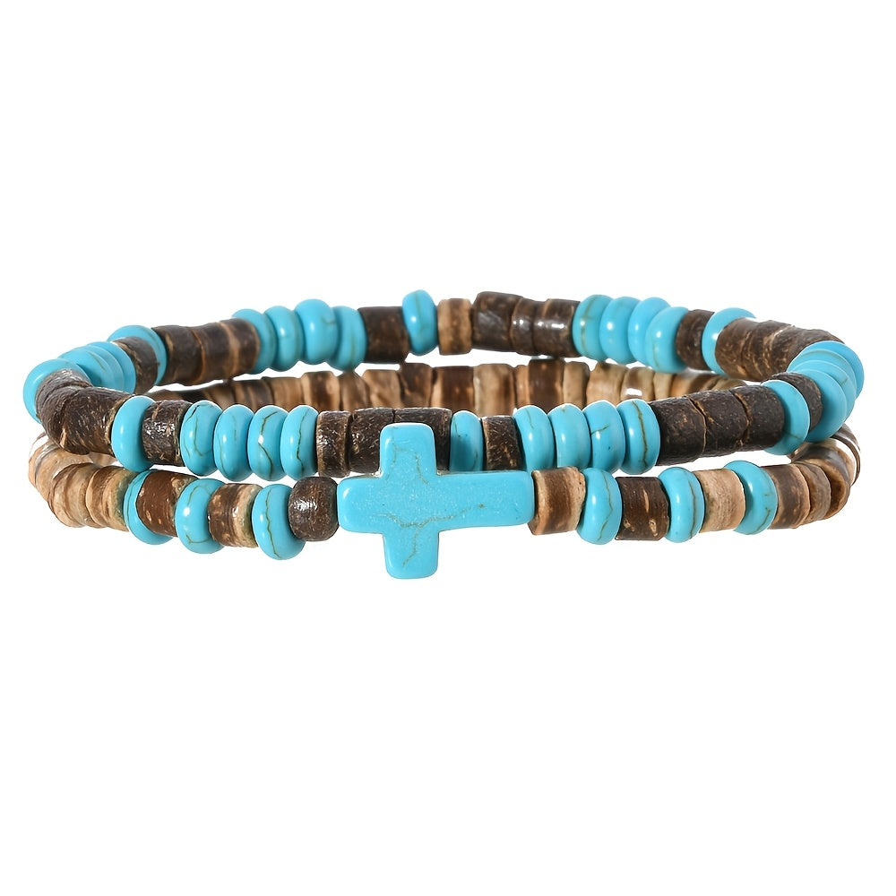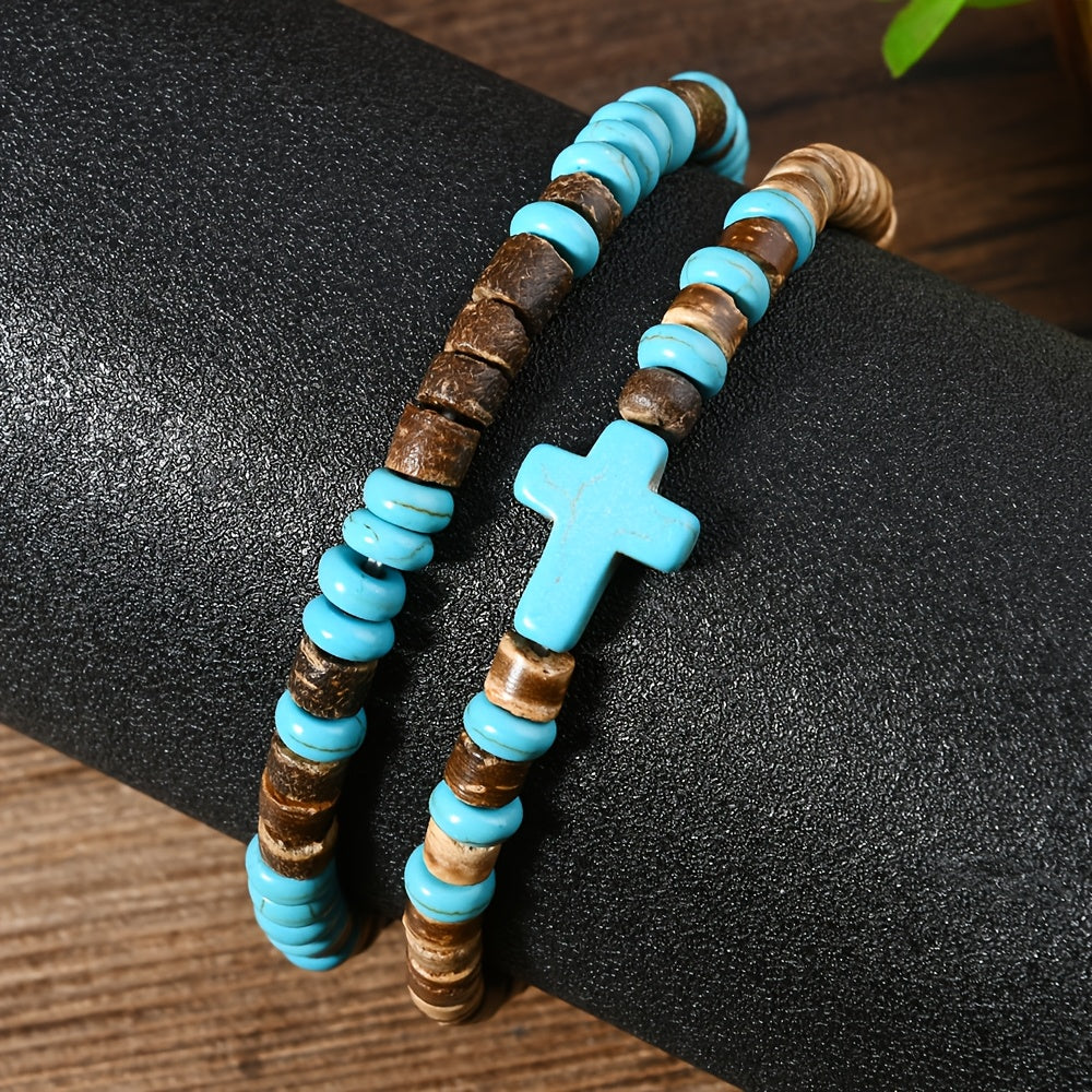 Boho Cross Charm Layer Bracelet Set Turquoise & Wood Beads Vintage Men's Bangle