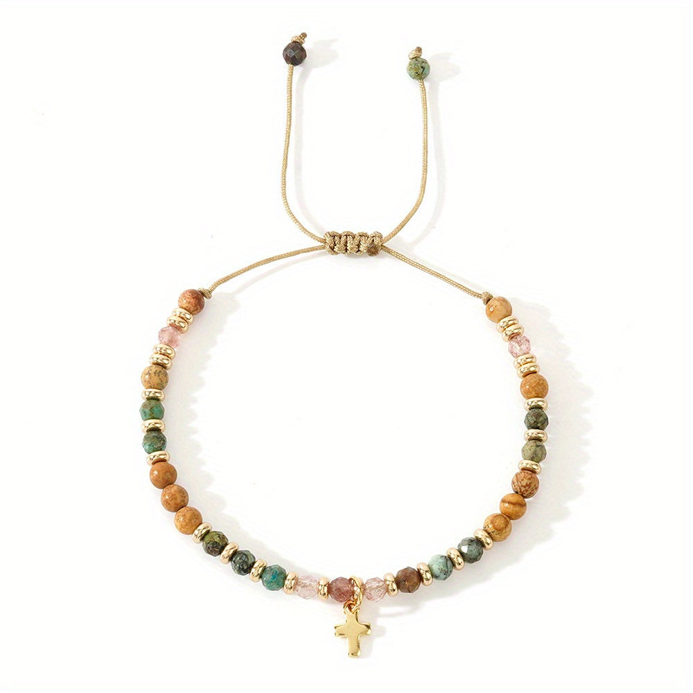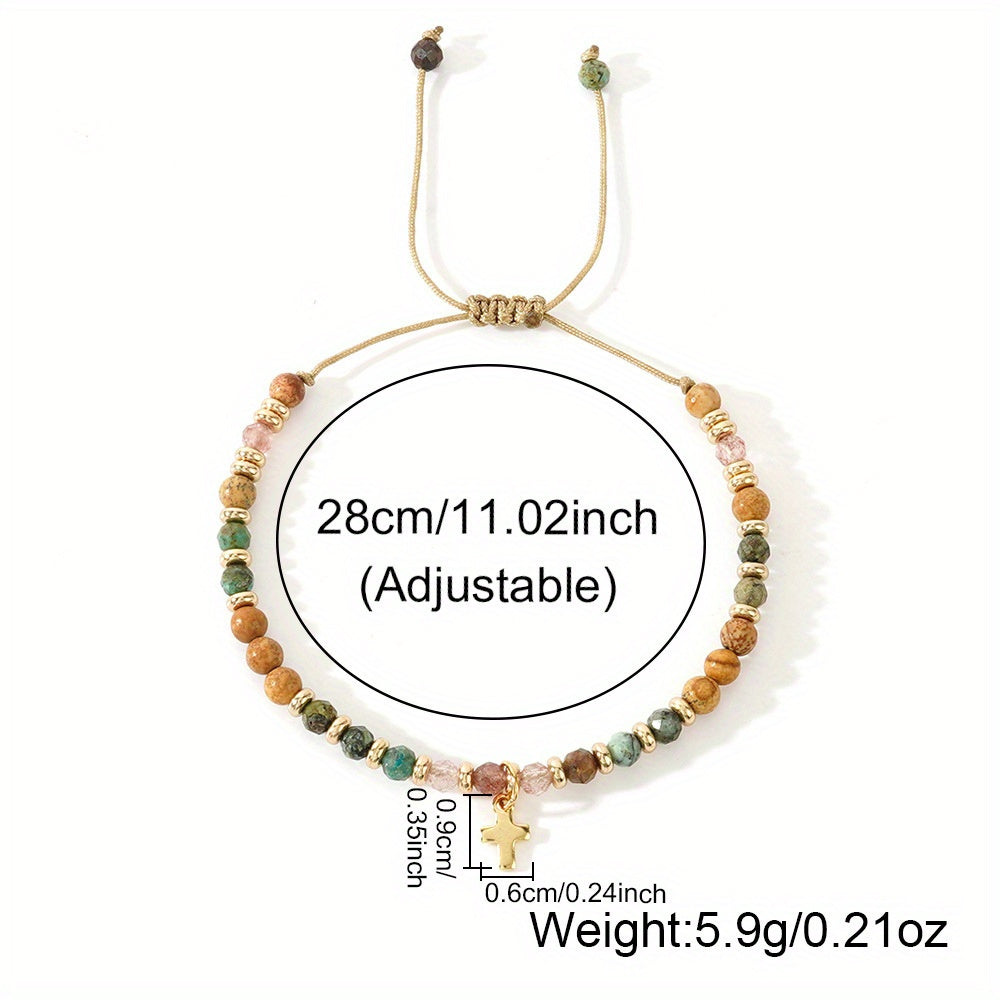 This natural gemstone beaded bracelet features a cross charm in a tribal style design. It is adjustable to fit and versatile for all seasons, perfect for everyday wear and vacations.