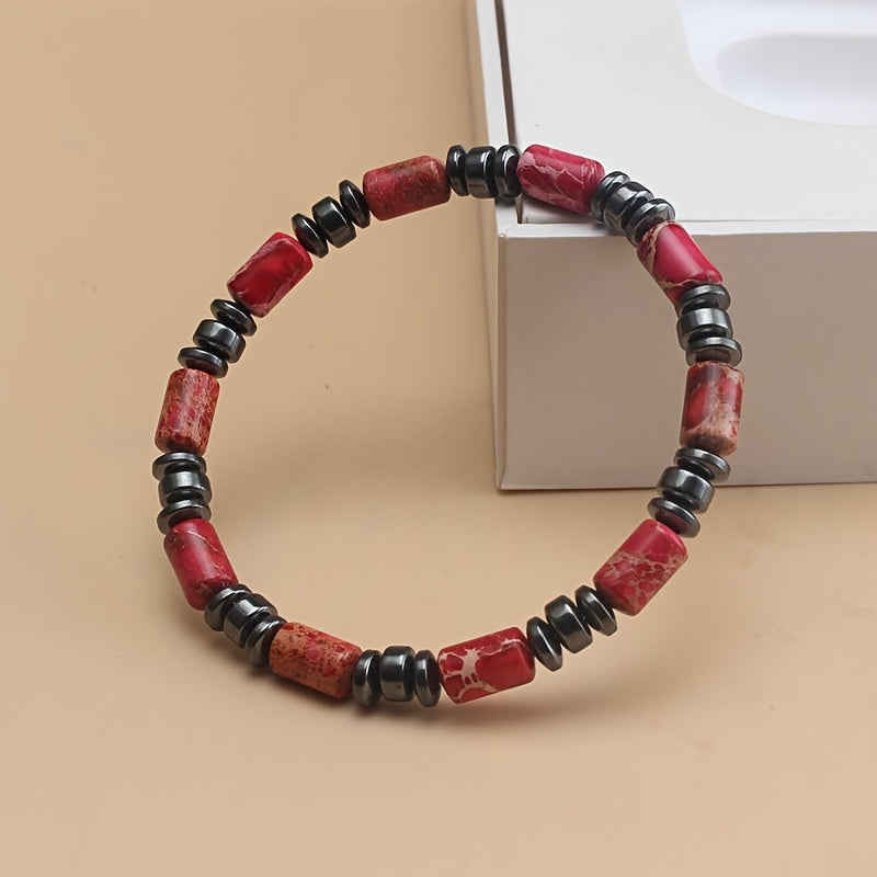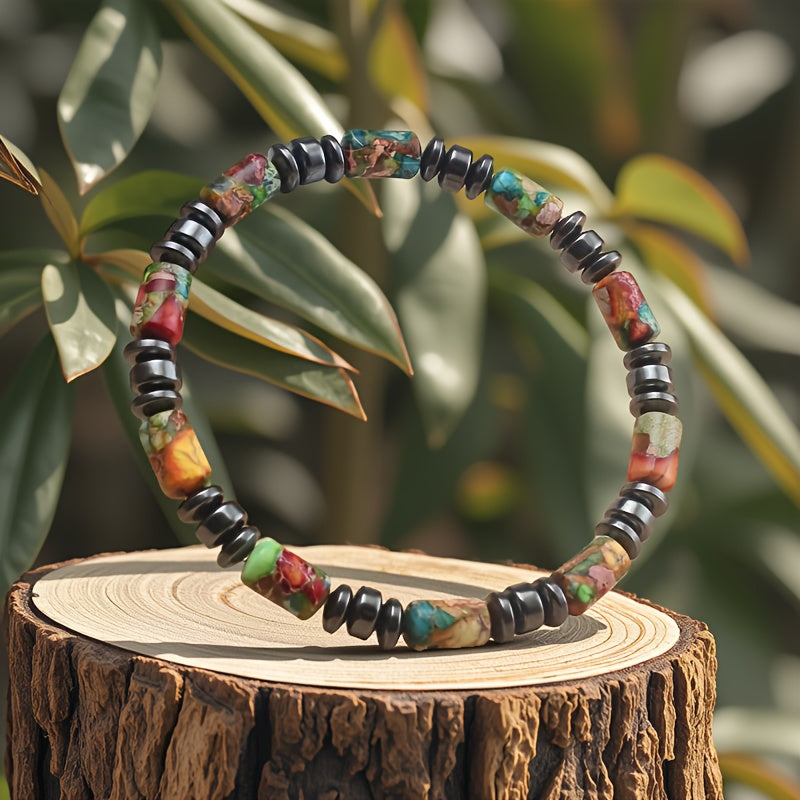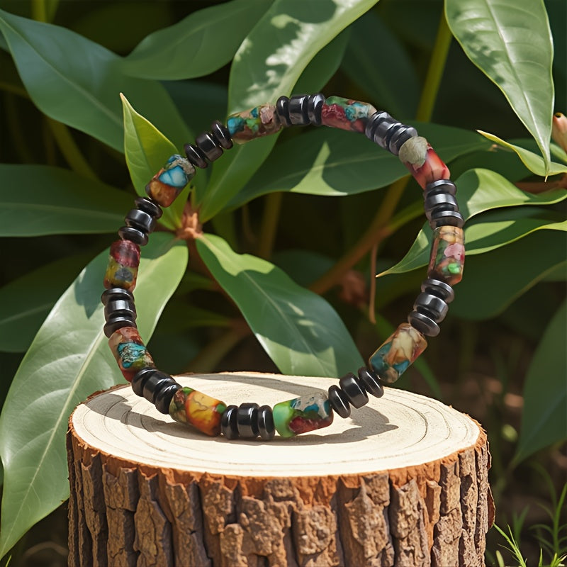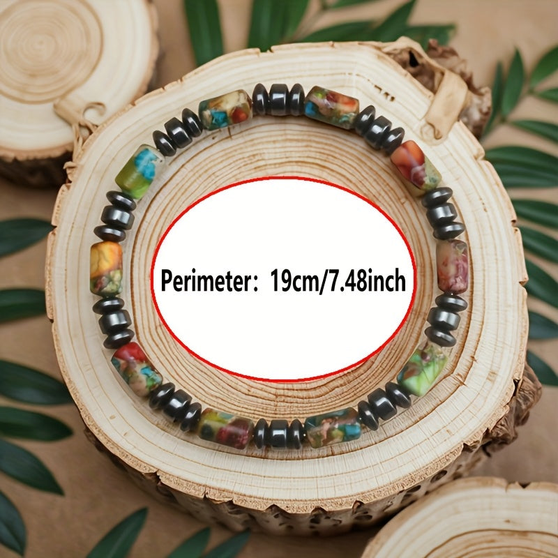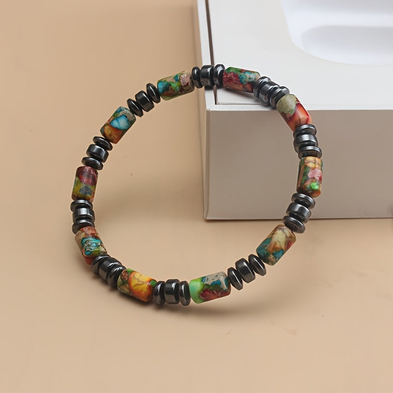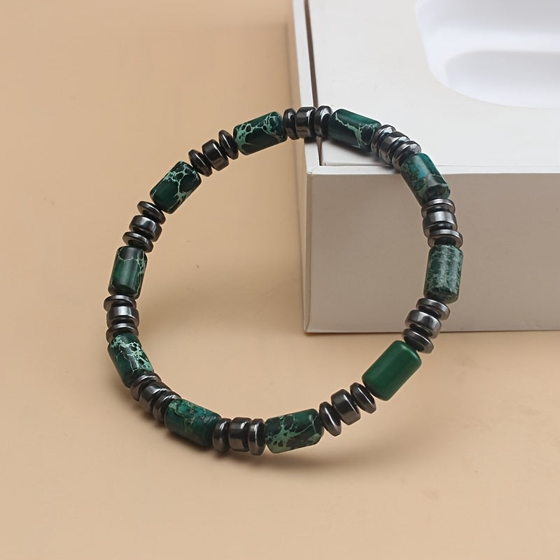 This boho style bracelet features natural imperial stone and hematite beads on a stretch cord, suitable for men and women. A perfect gift for Father's and Mother's Day.