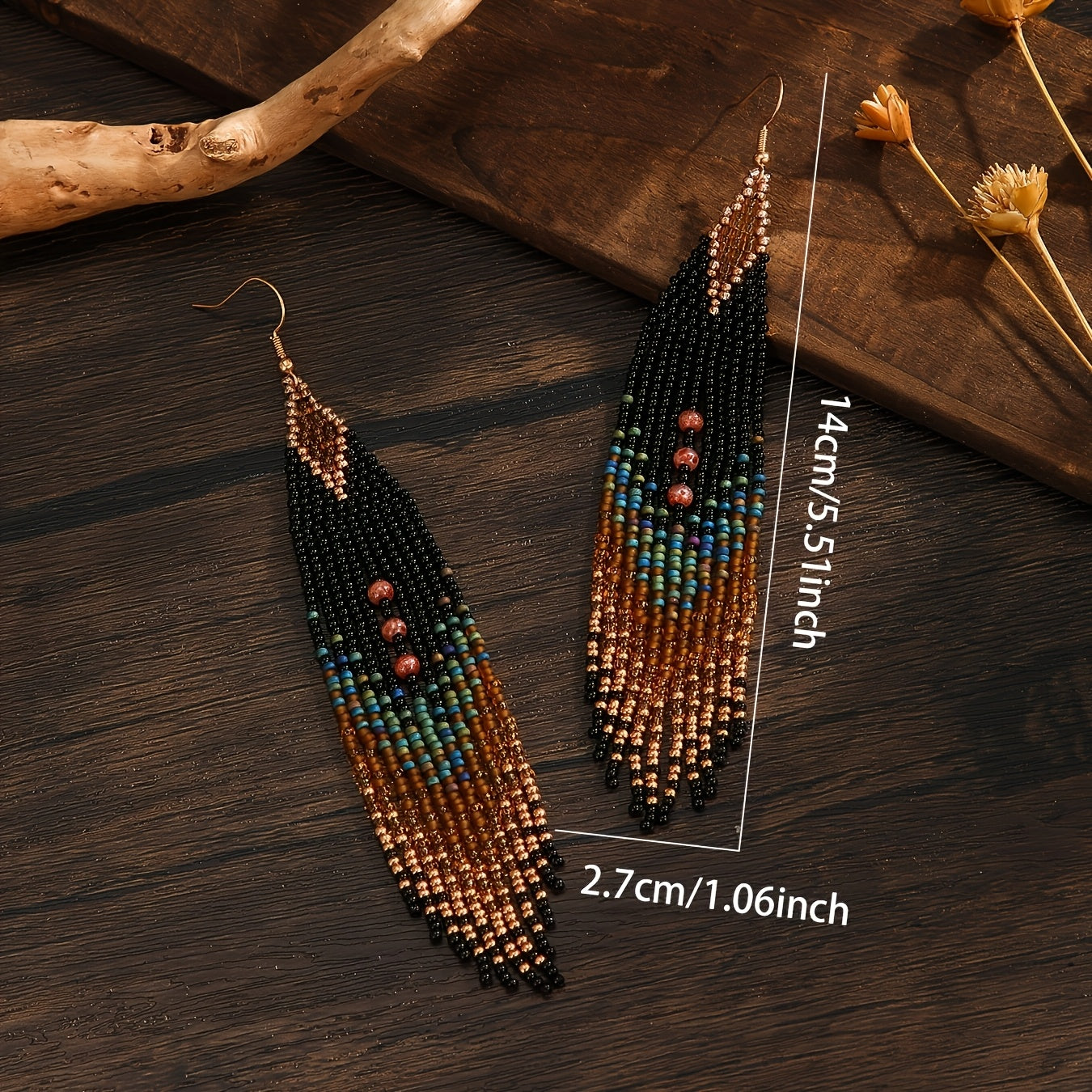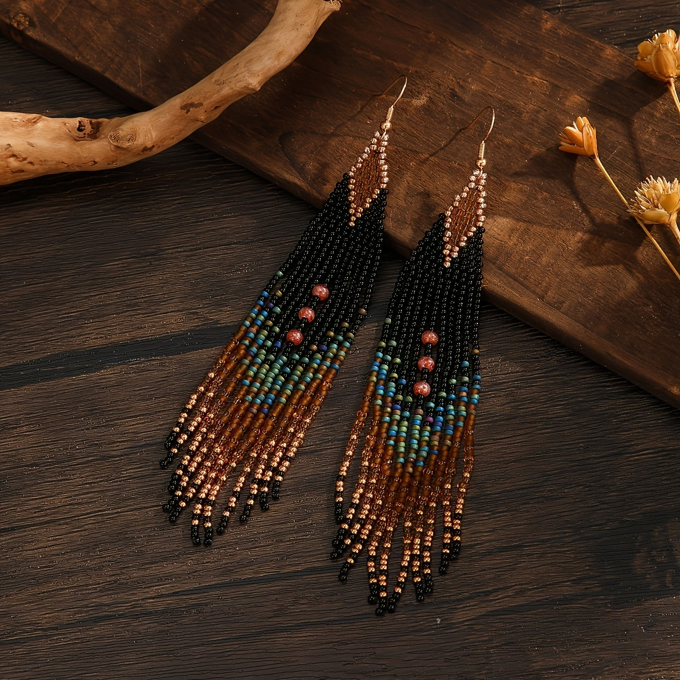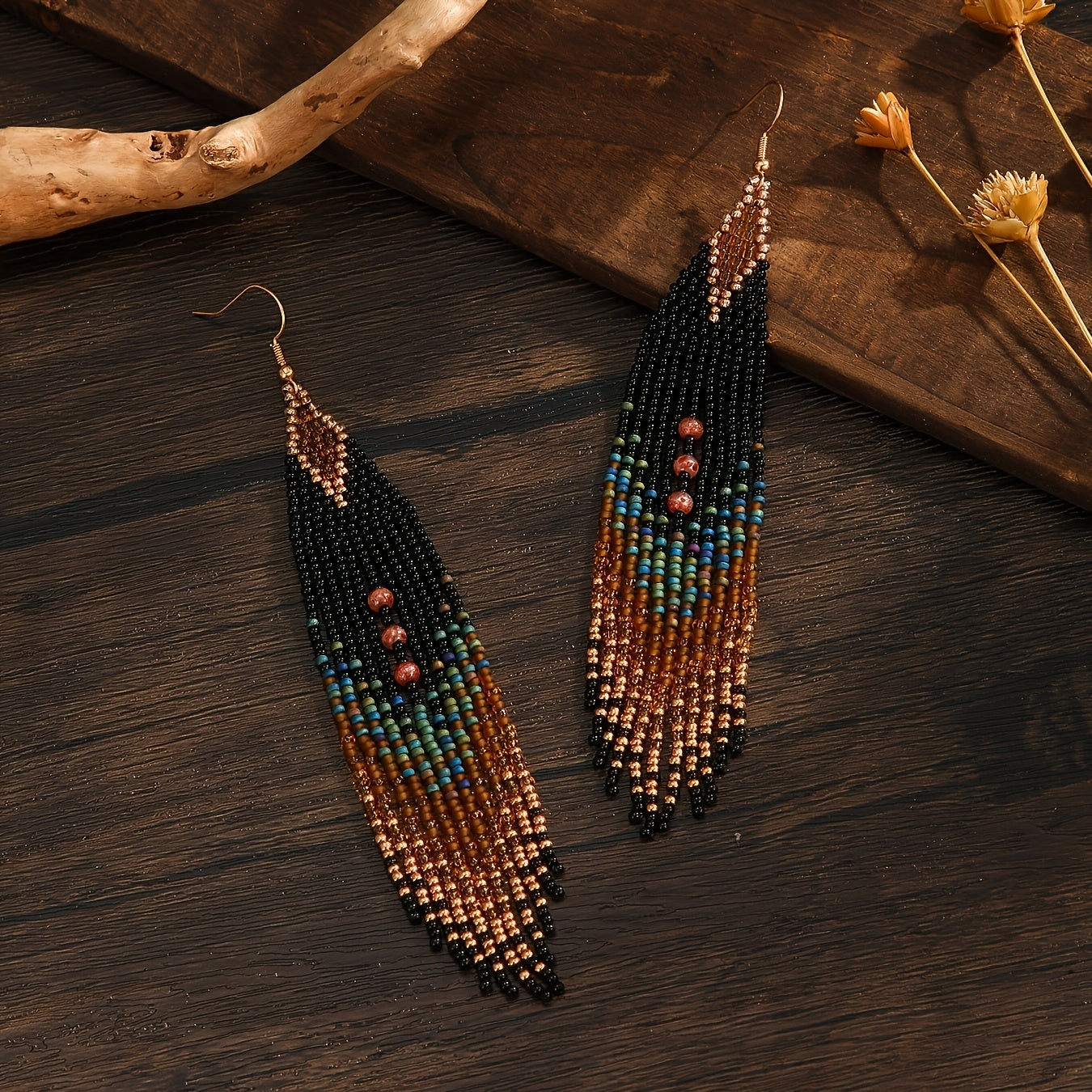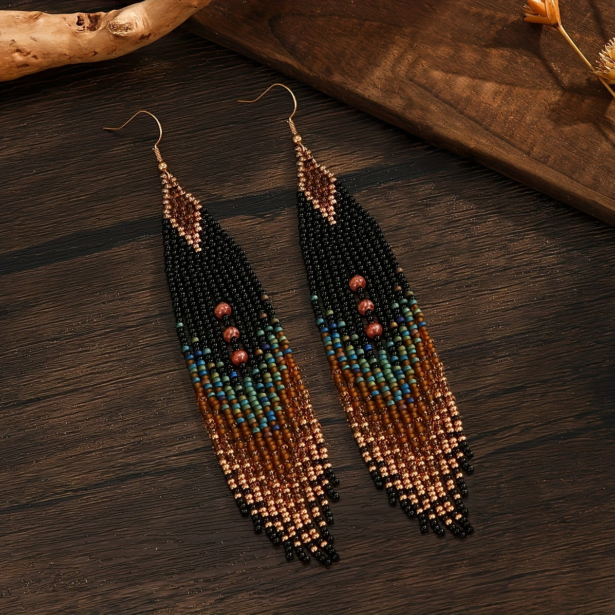 Boho Vintage Beaded Tassel Earrings Handcrafted Glass Seed Golden Accent