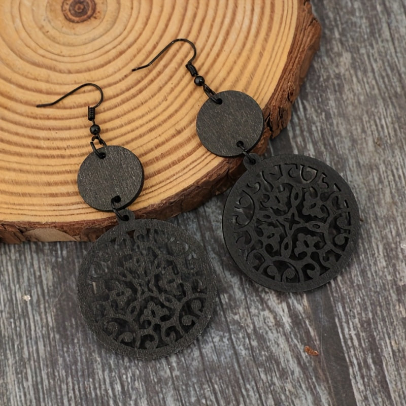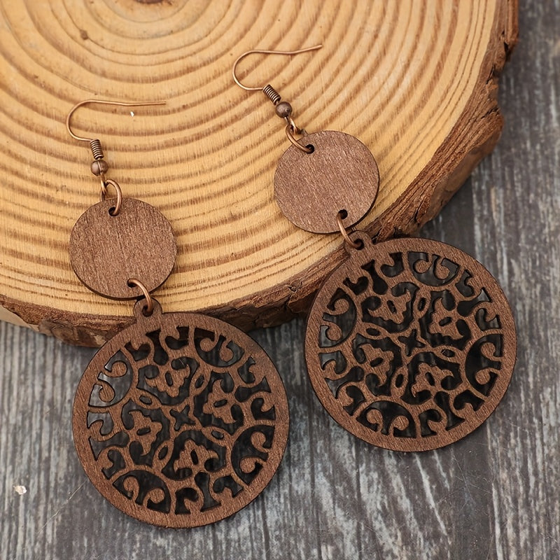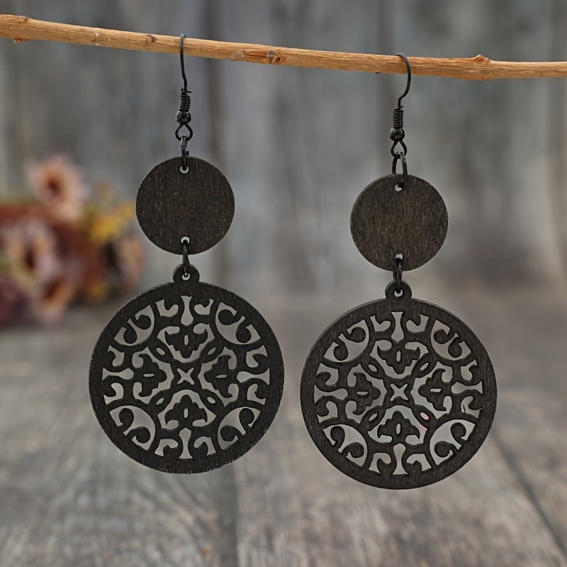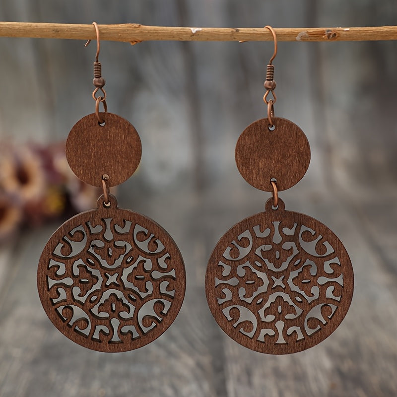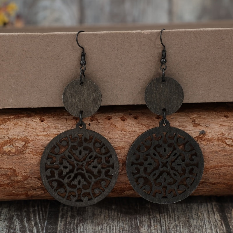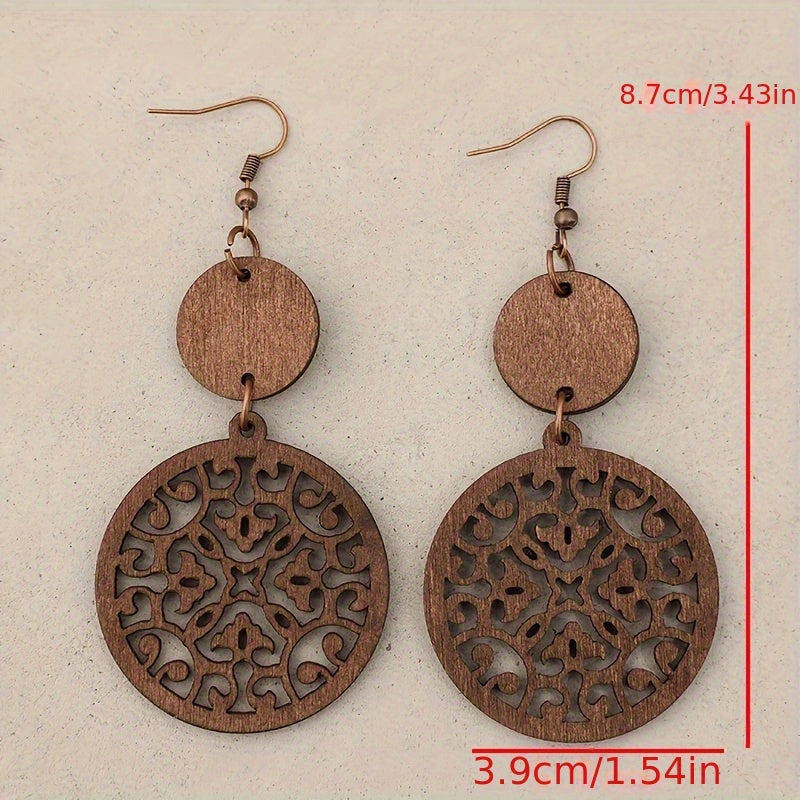 Boho Vintage Round Hollow Out Wood Earrings with Copper Hooks