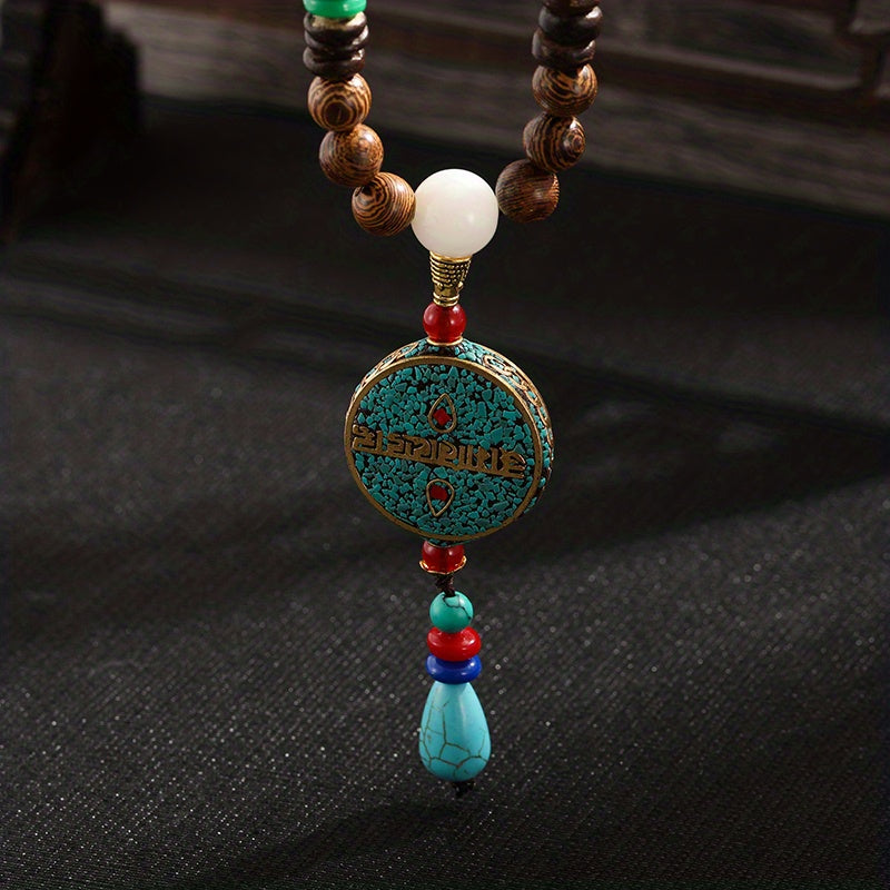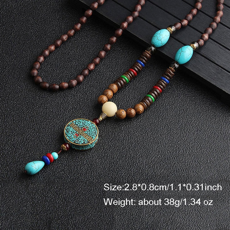 This stylish pendant necklace features wooden beads on a long sweater chain. It is perfect for a boho chic look and makes a great gift for loved ones.