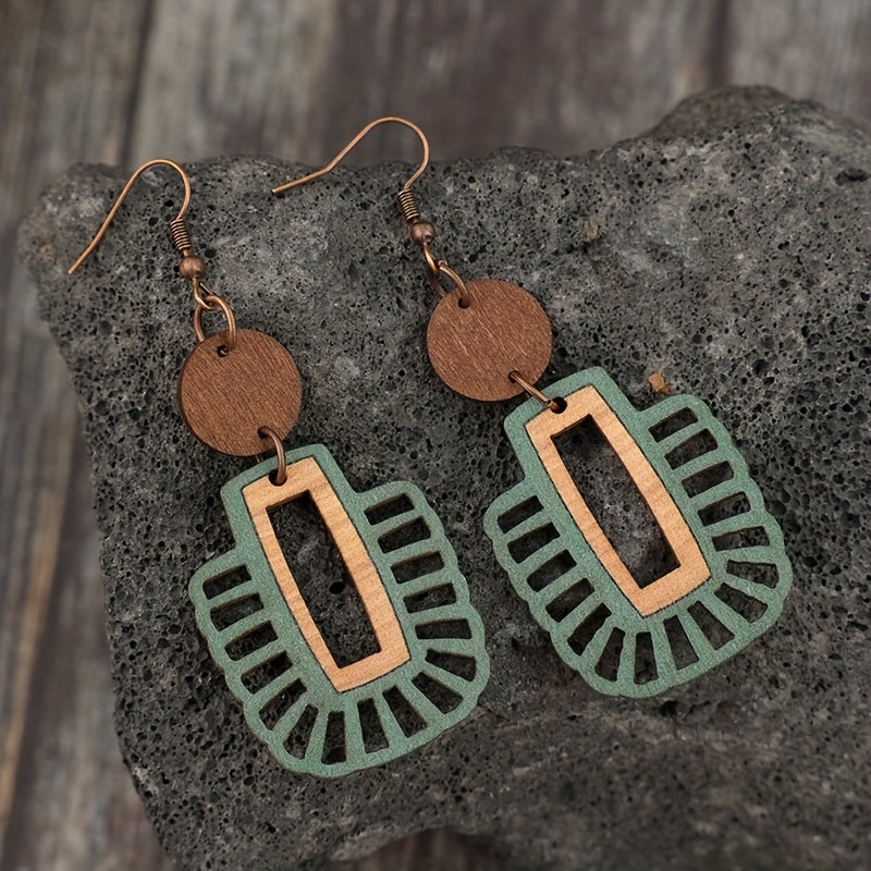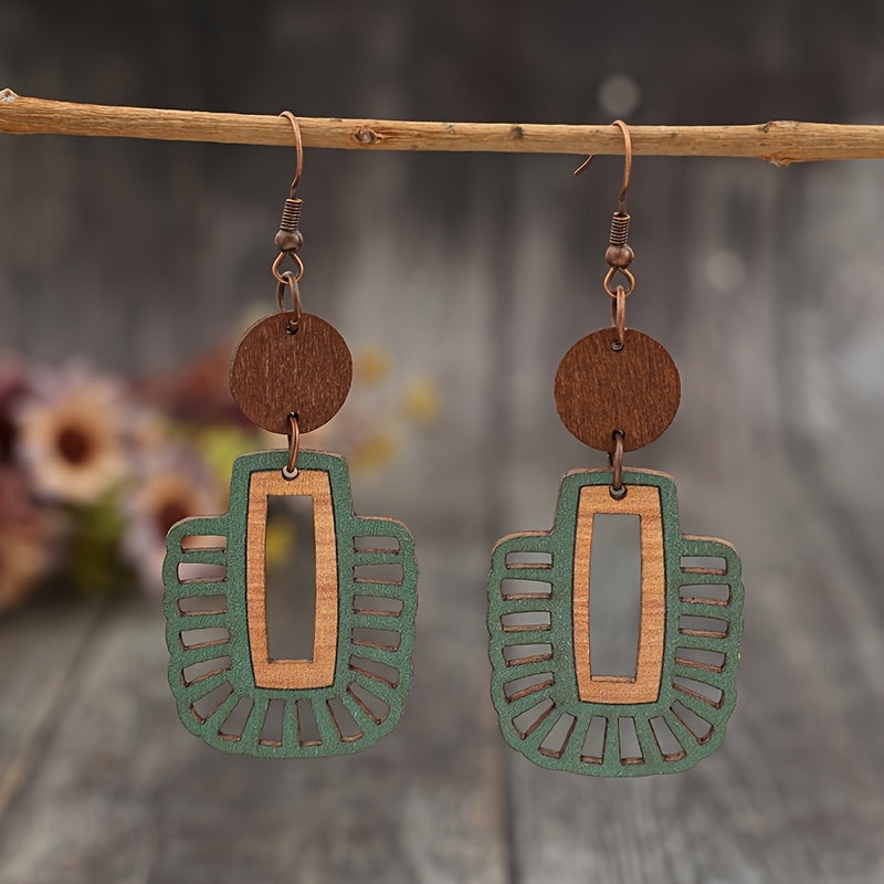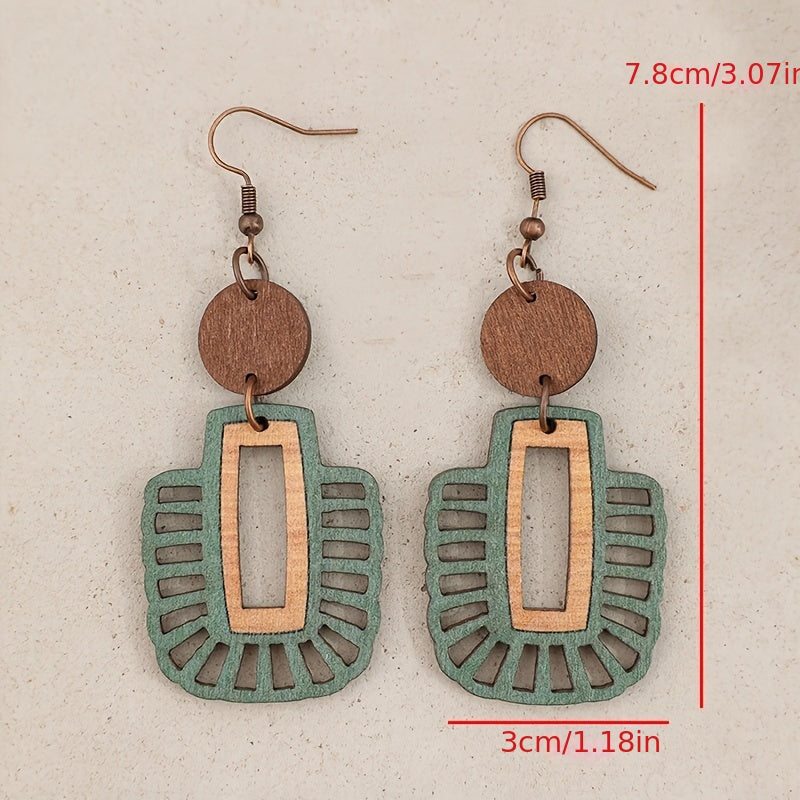 These beautiful earrings feature a unique mix of colors and a geometric hollow design that adds a touch of vintage ethnic style to your look.