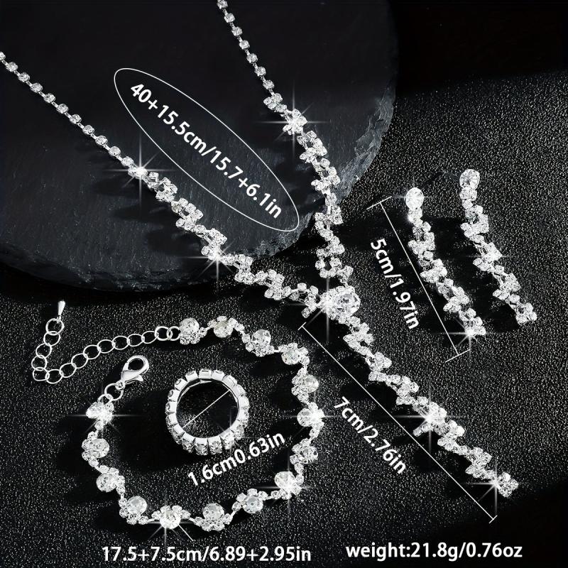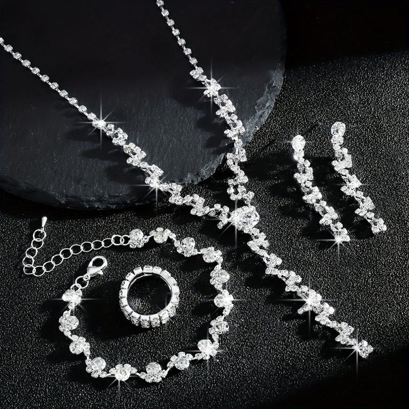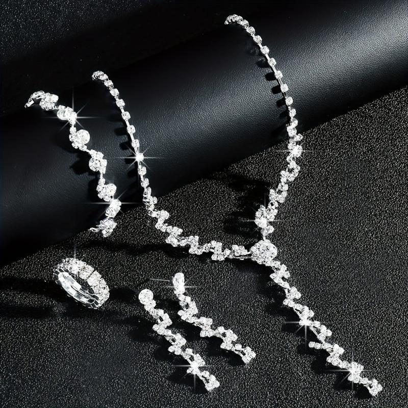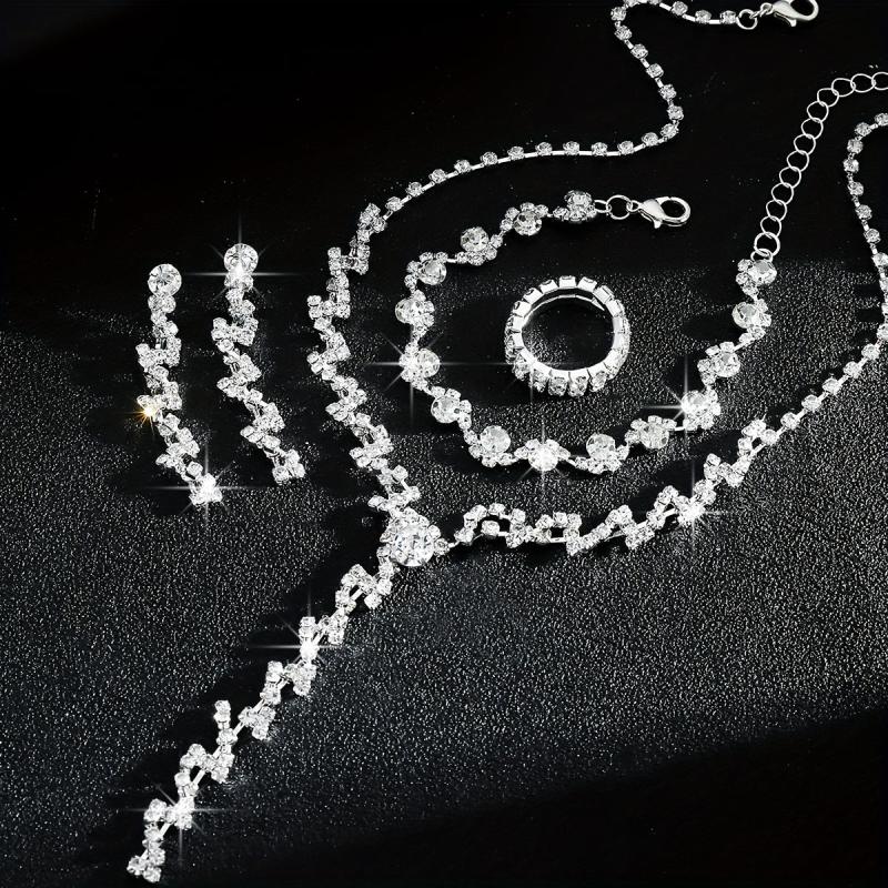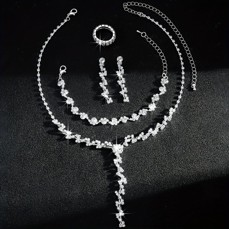 Complete your bridal look with this fashionable and sparkling four-piece set including a necklace, bracelet, ring, and earrings adorned with rhinestones.