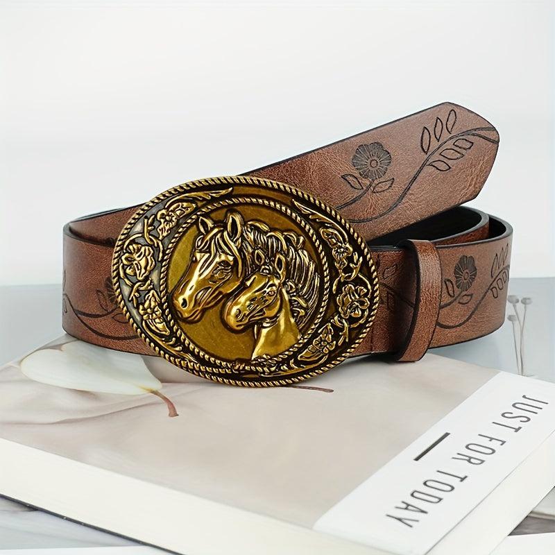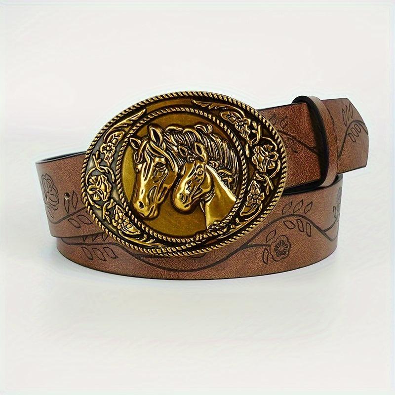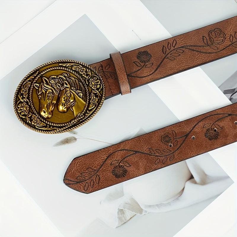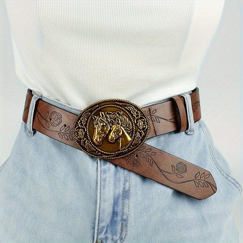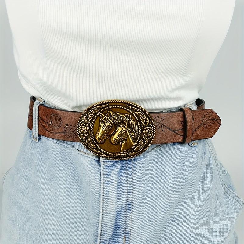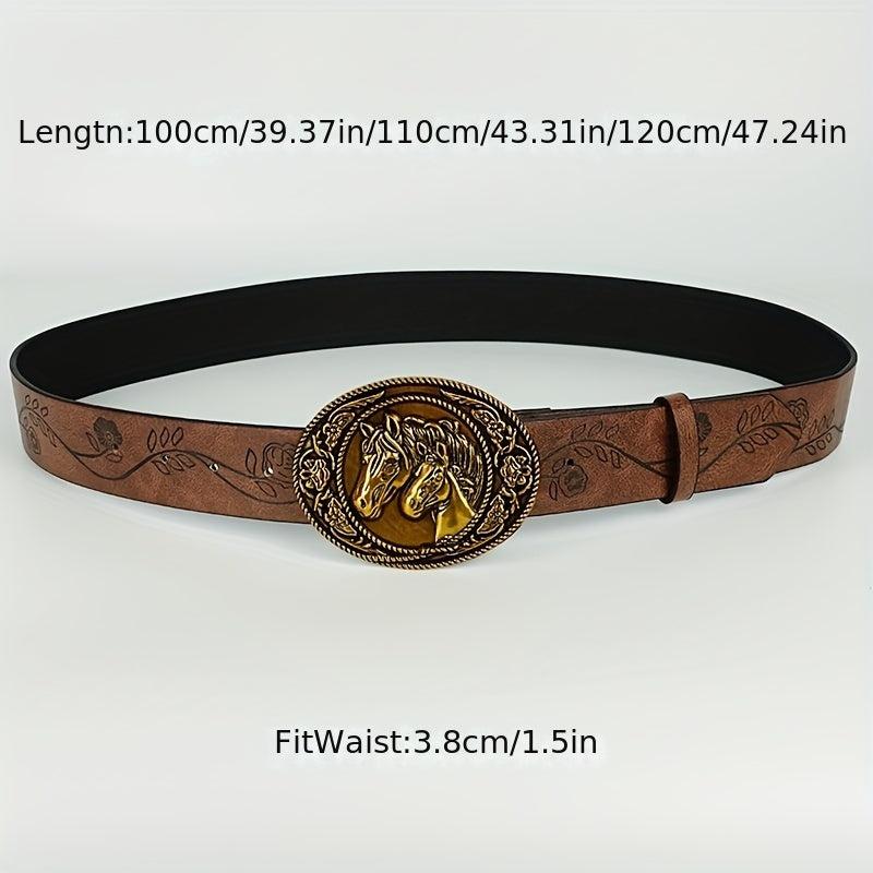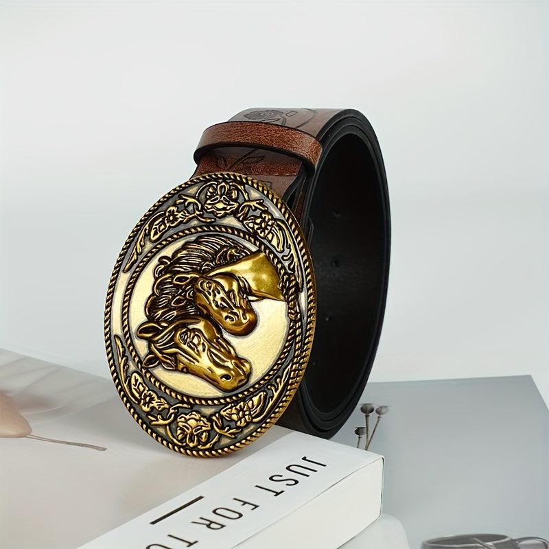 Elevate your style with this dark brown carved waistband featuring a golden round carved buckle, perfect for dressing up jeans or shirts.
