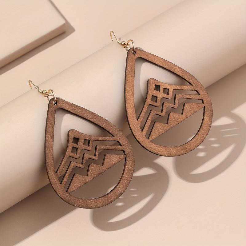 Brown Hollow Mountain Pattern Dangle Earrings Wooden Jewelry