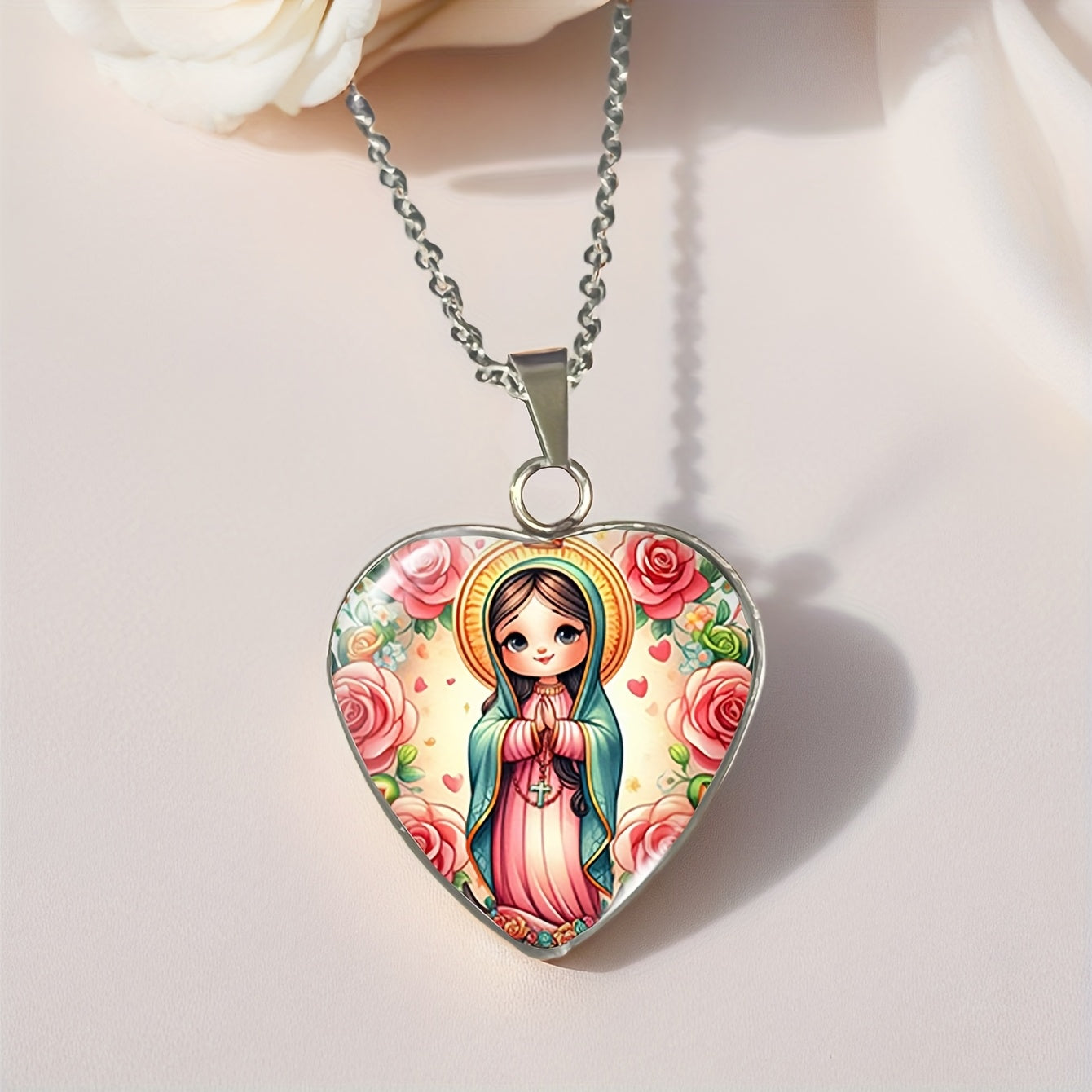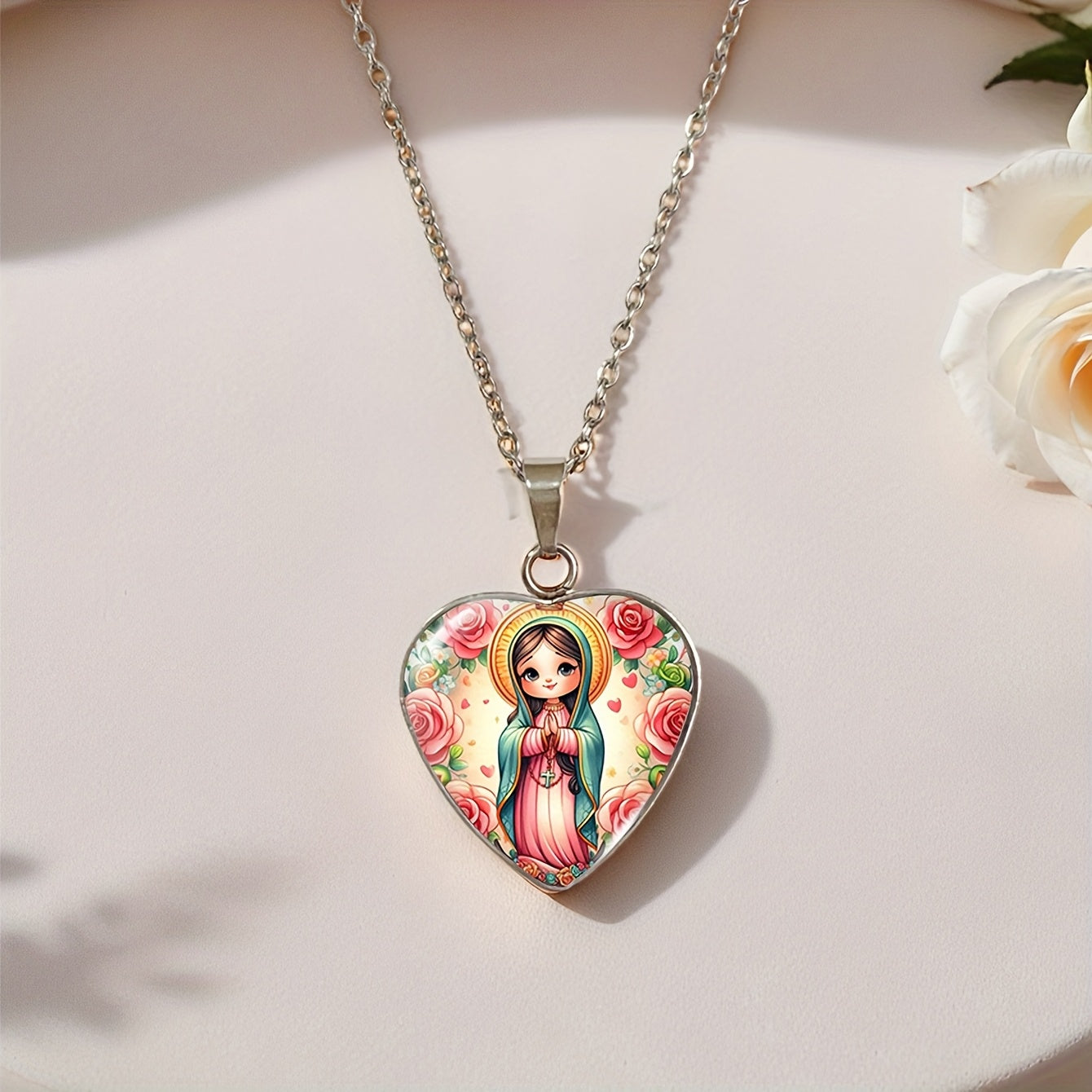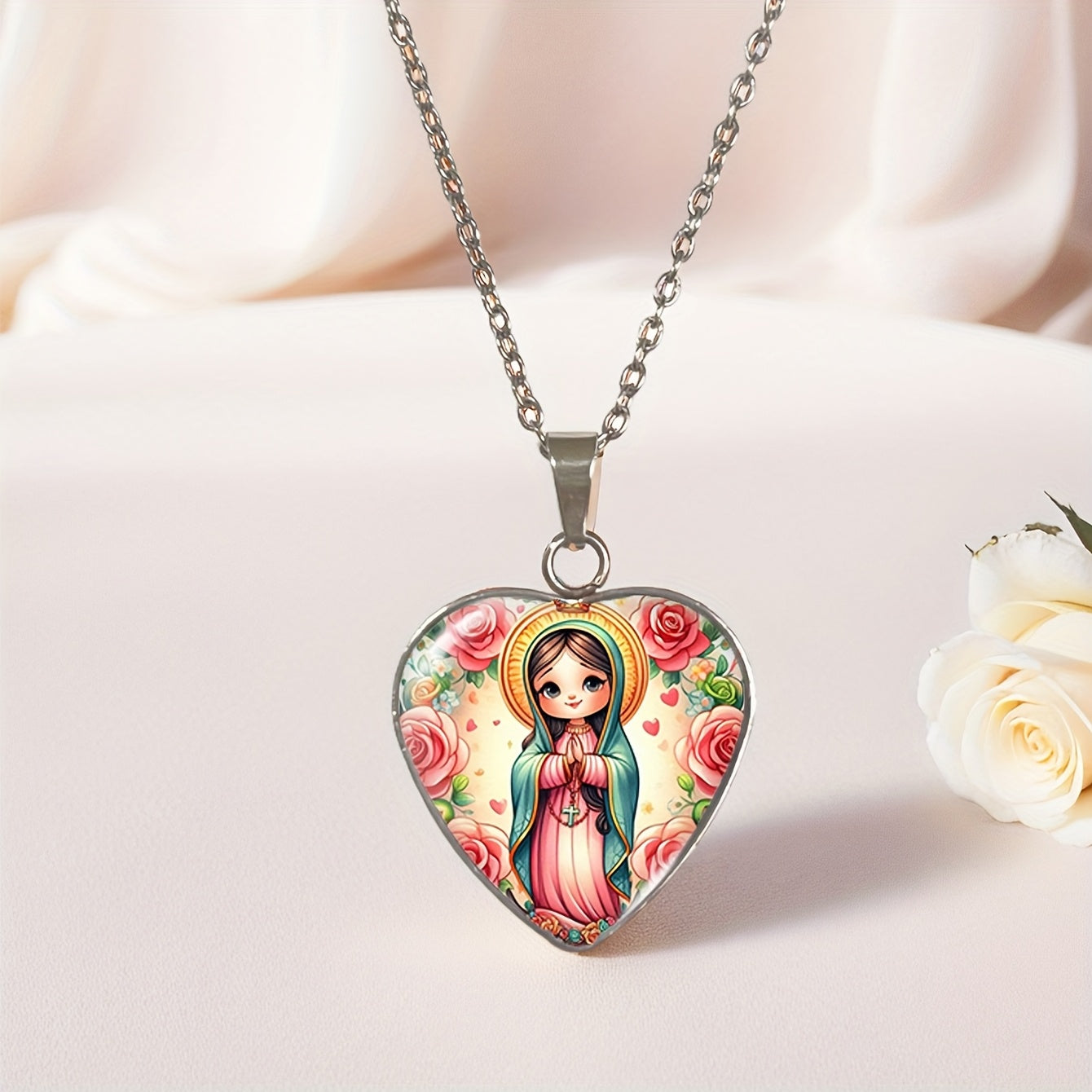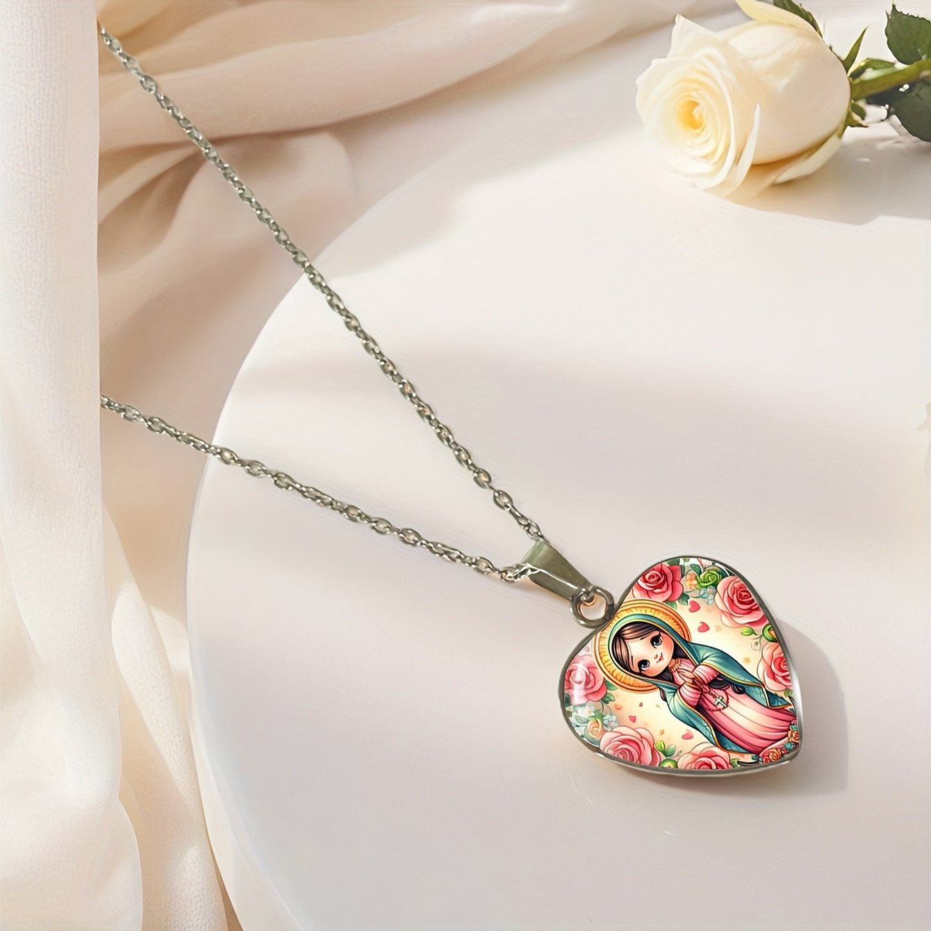 Stunning pendant necklace featuring a Cartoon Virgin Mary and Rose Heart design made of stainless steel with glass mosaic. Ideal accessory for birthdays and parties.
