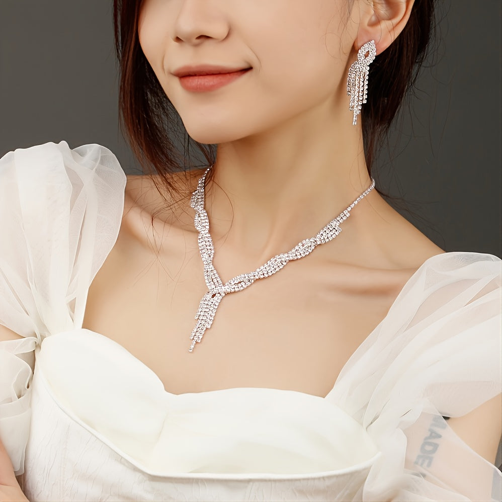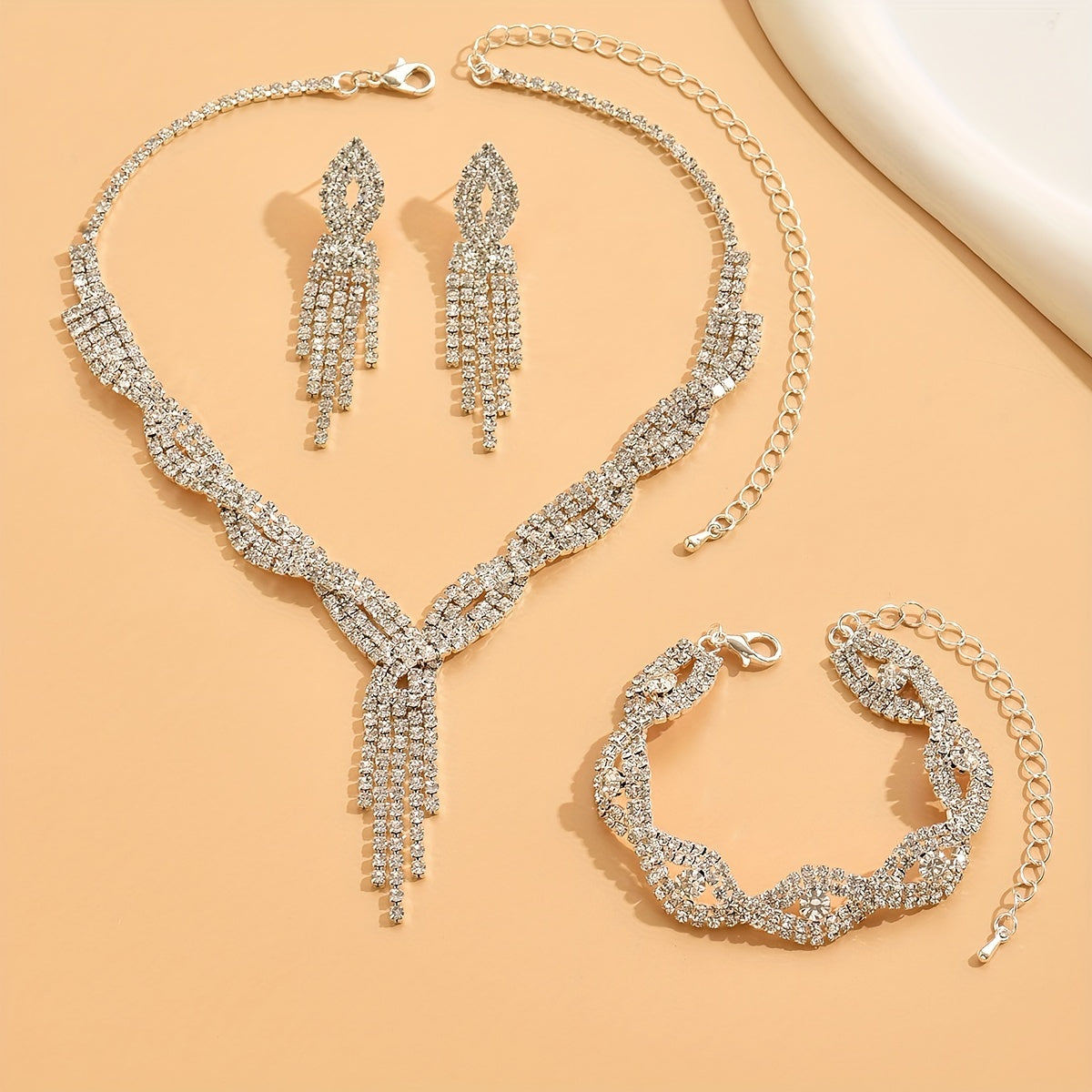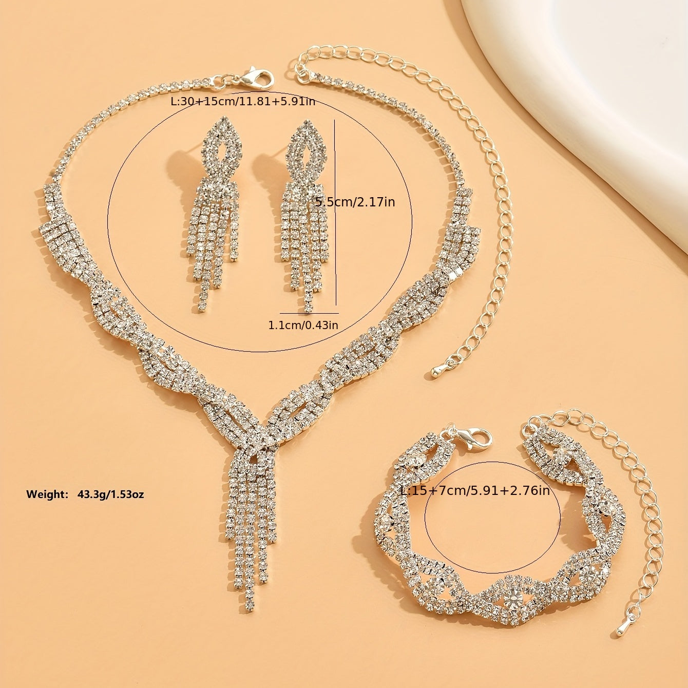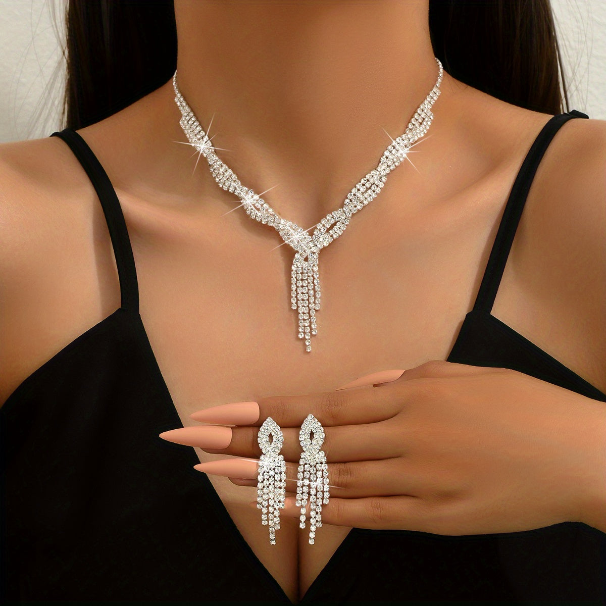 Complete your elegant look with this stunning jewelry set. The set includes a charm necklace, drop earrings, and a choker bracelet, all adorned with sparkling rhinestones and a stylish tassel pendant. Perfect for a birthday surprise gift for women and girls or a wedding photo accessory.