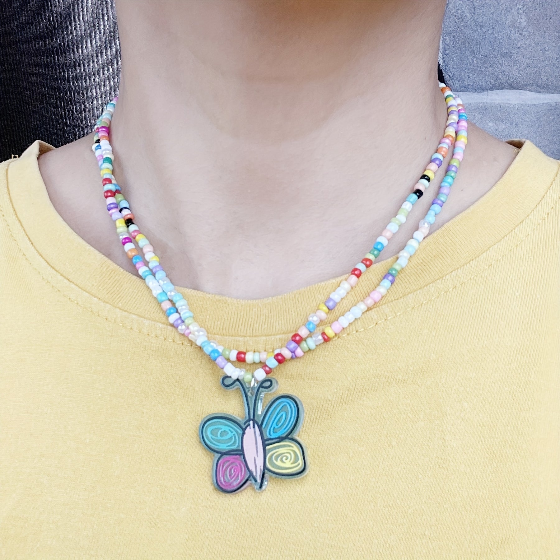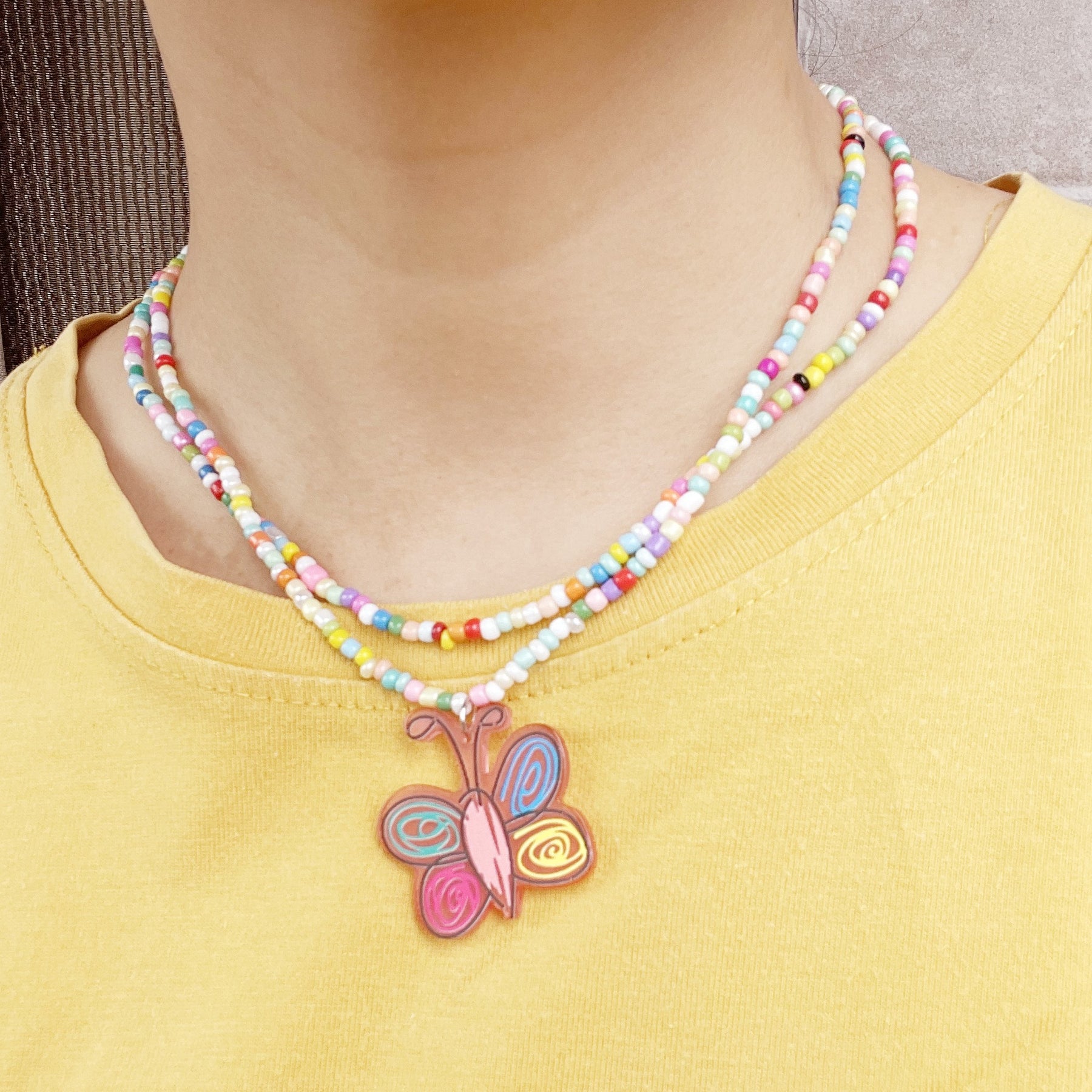 • Double-layered beaded necklace with flower or butterfly charm pendant