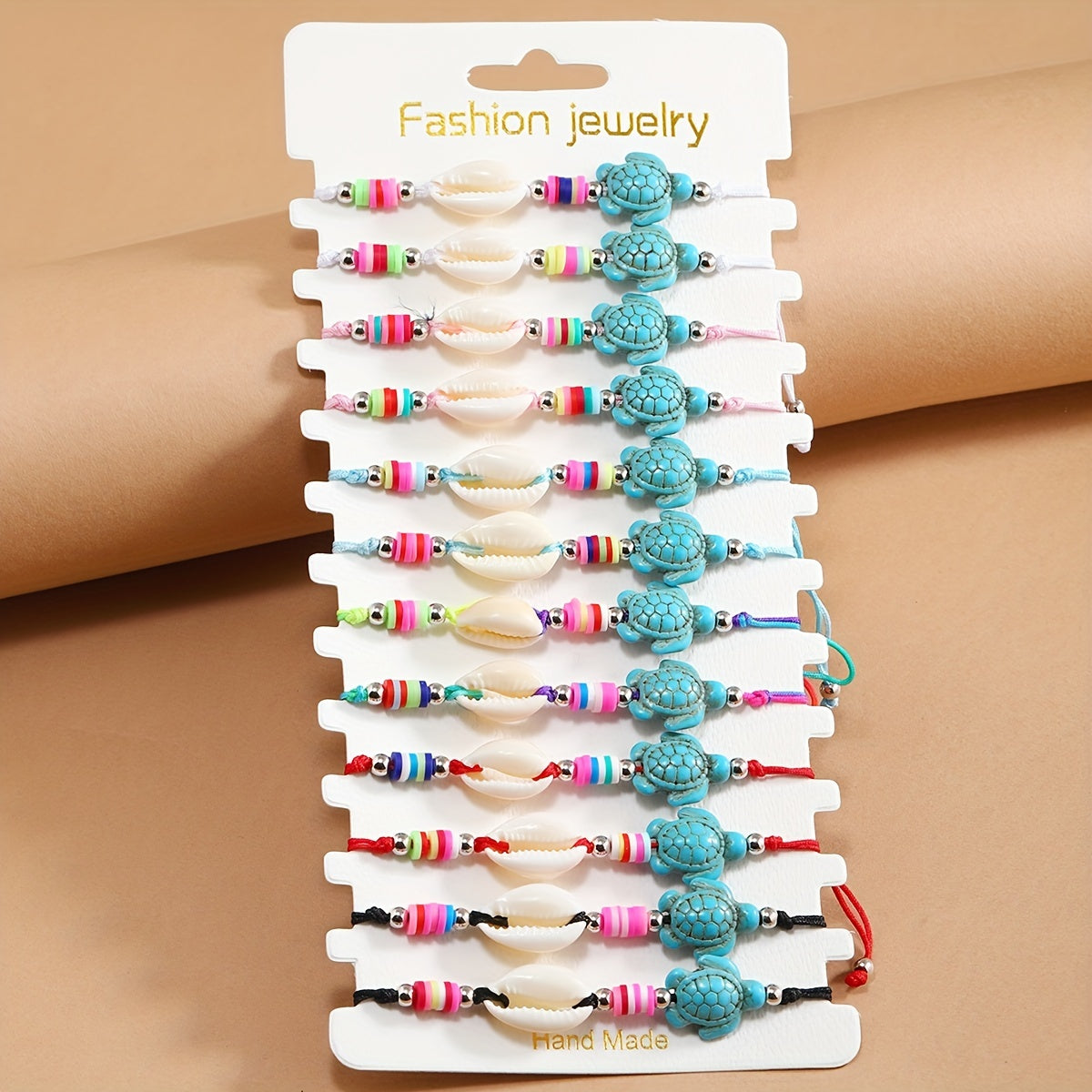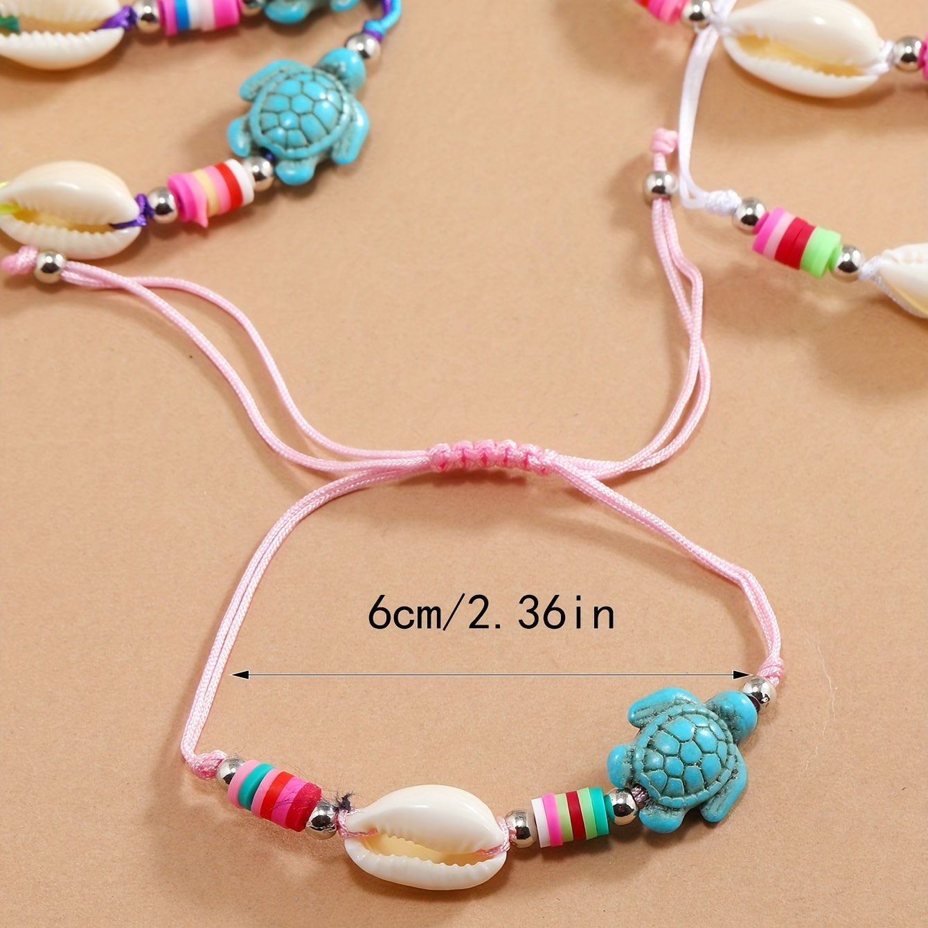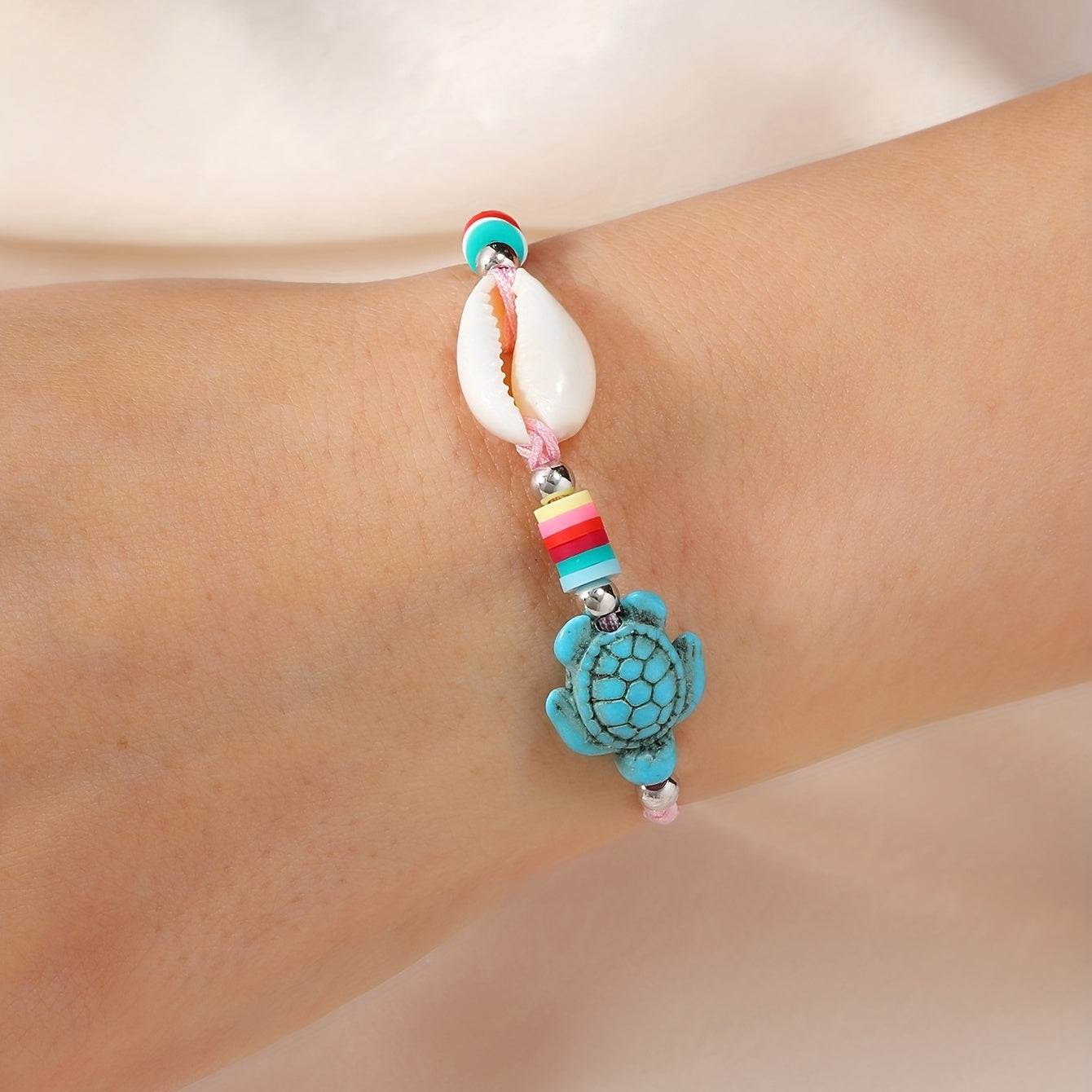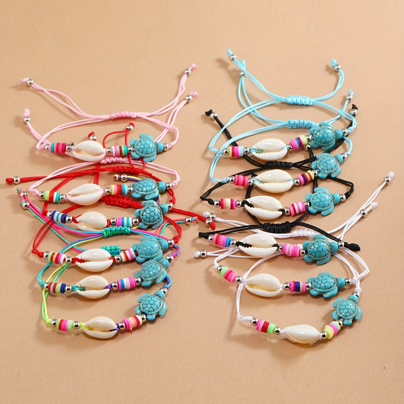 Add a boho touch to your summer look with this handwoven bracelet set featuring colorful ceramic turtle shell charms. Perfect for beach days and surfer style, these bracelets make great friendship jewelry.