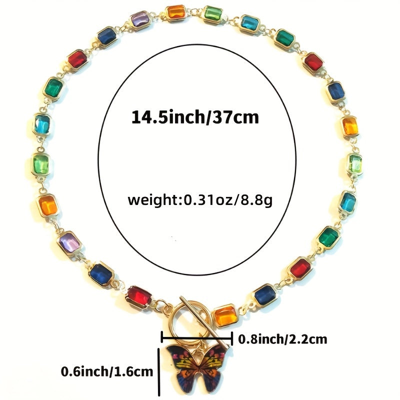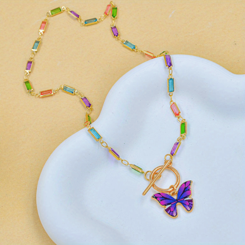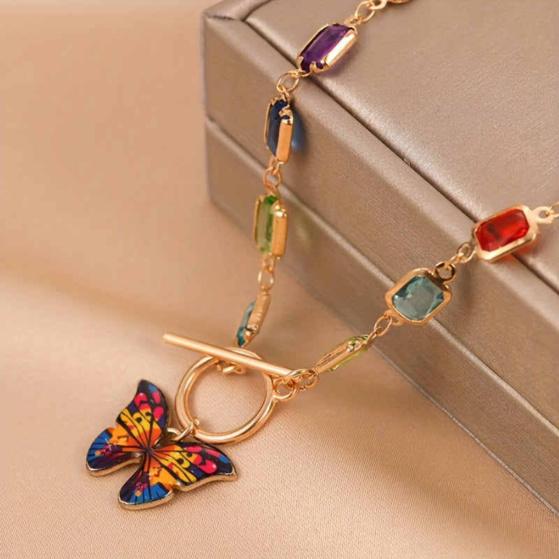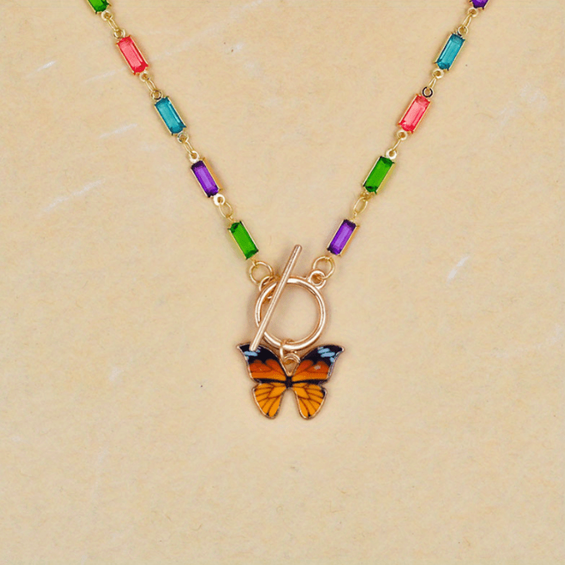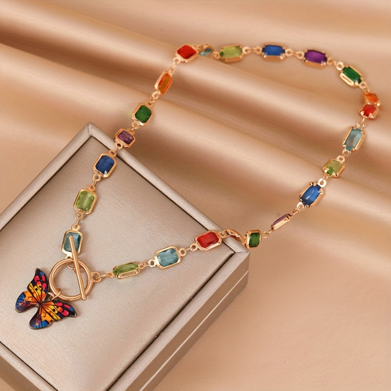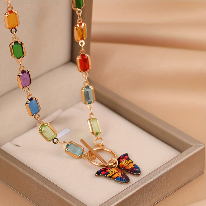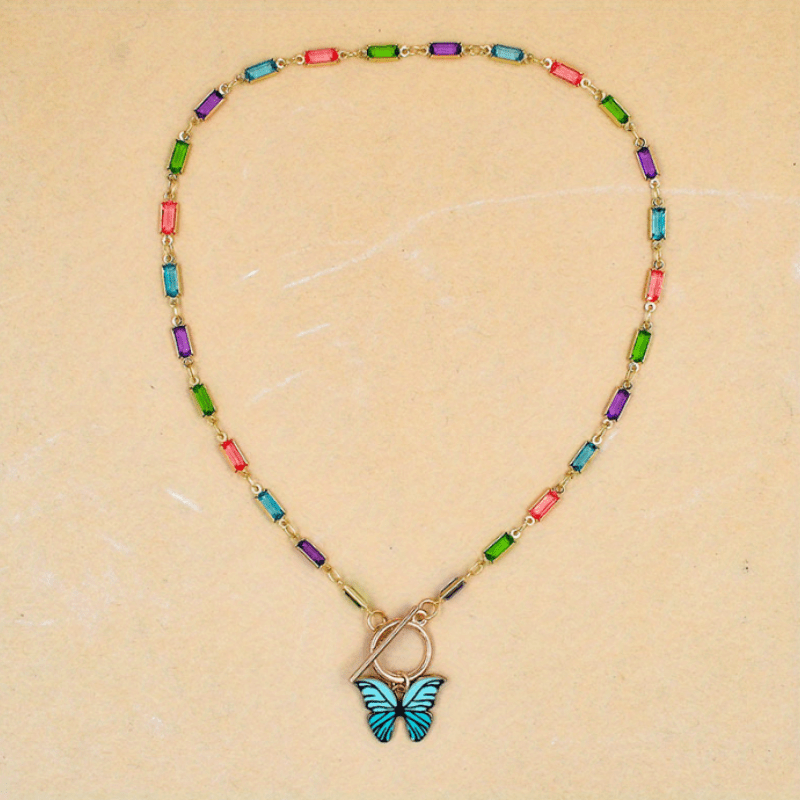 This charming necklace features a square crystal butterfly charm and a classic OT clasp chain. The vibrant colors and retro design make it a standout accessory.