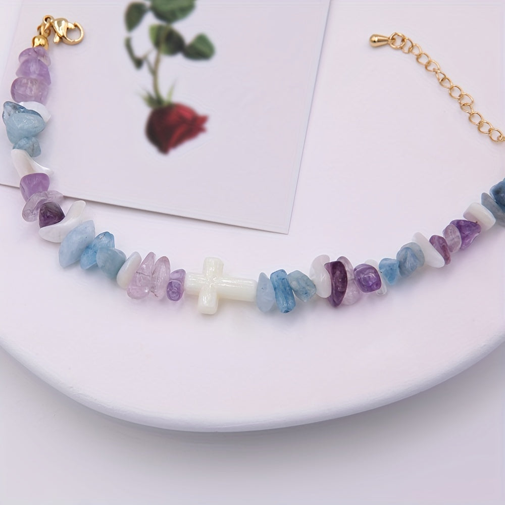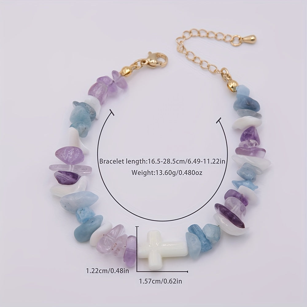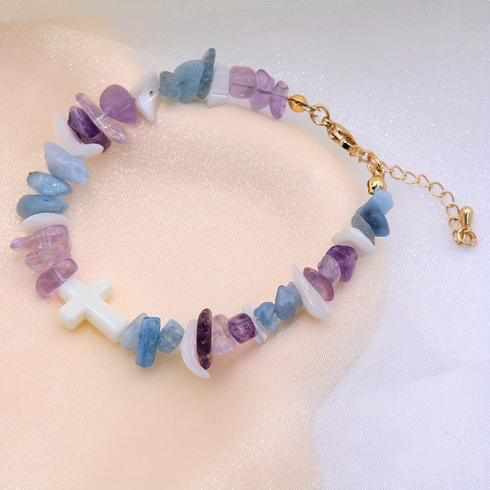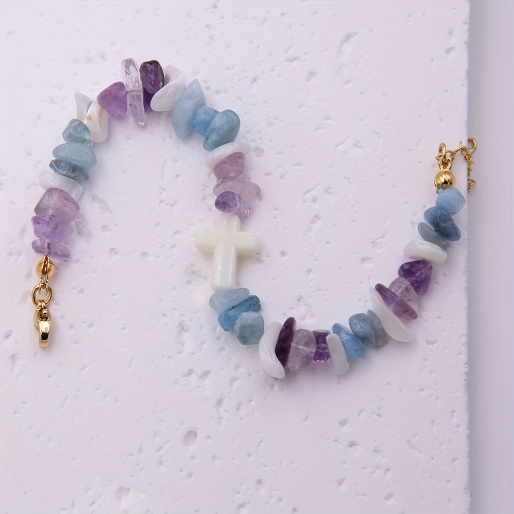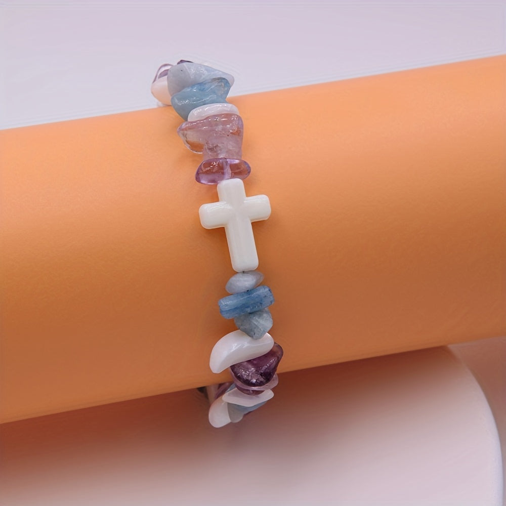Embrace the beauty of natural crystals with this colorful gravel cross charm bracelet designed for women, perfect for prayer and daily wear.