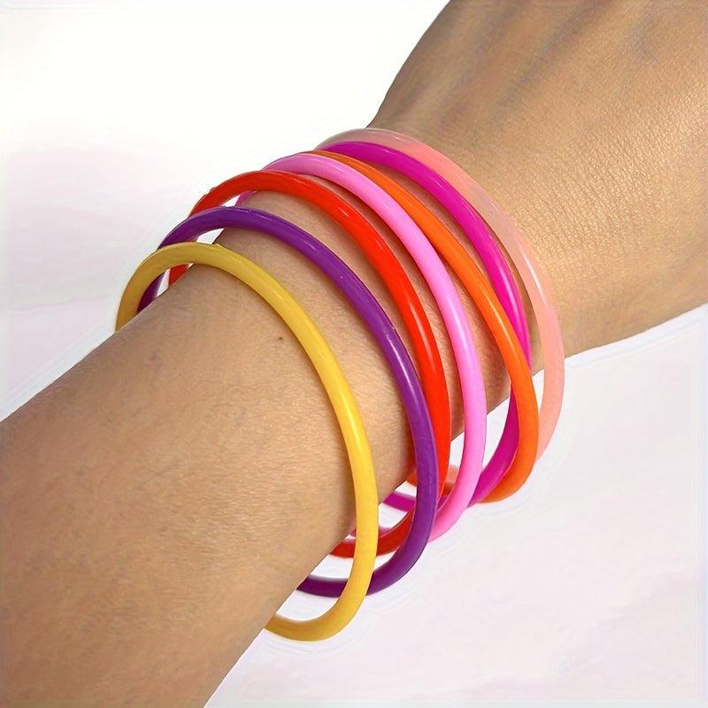 This set includes 4 stretchable silicone bangles in vibrant colors. Perfect for vacation and party wear, these non-plated solid wristbands are versatile for daily use and special occasions.