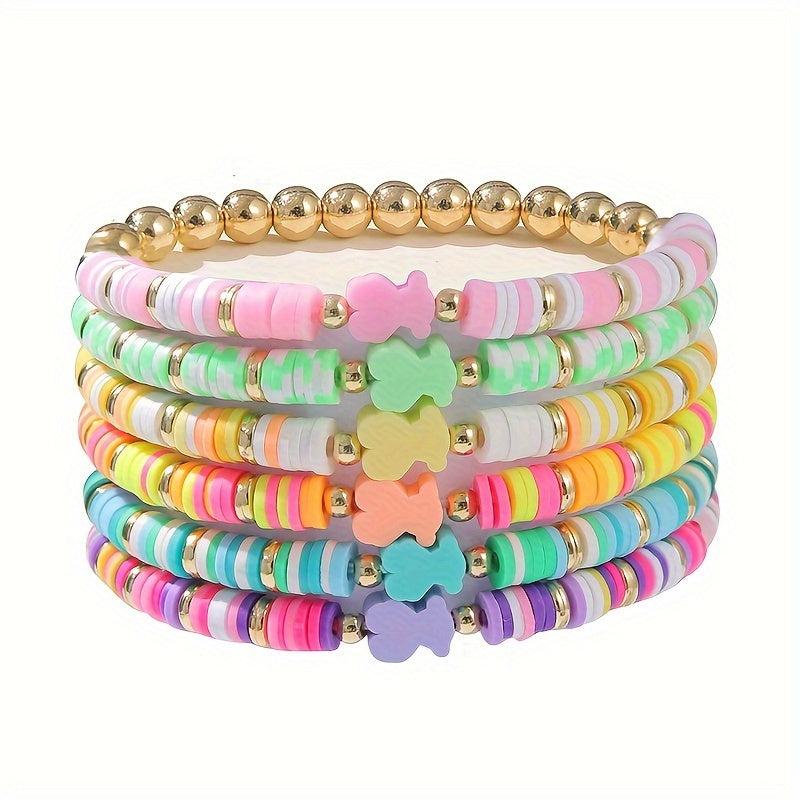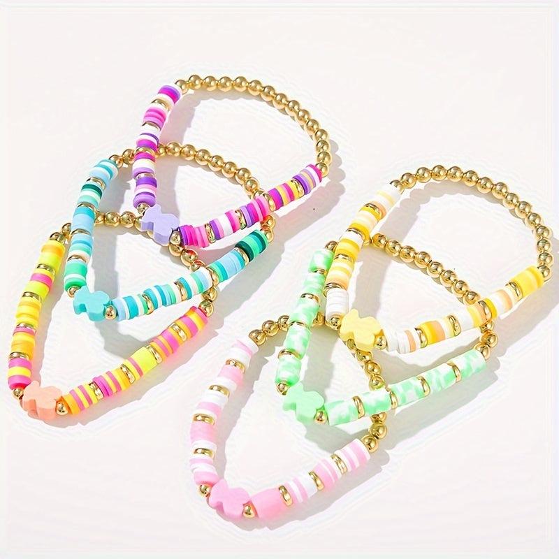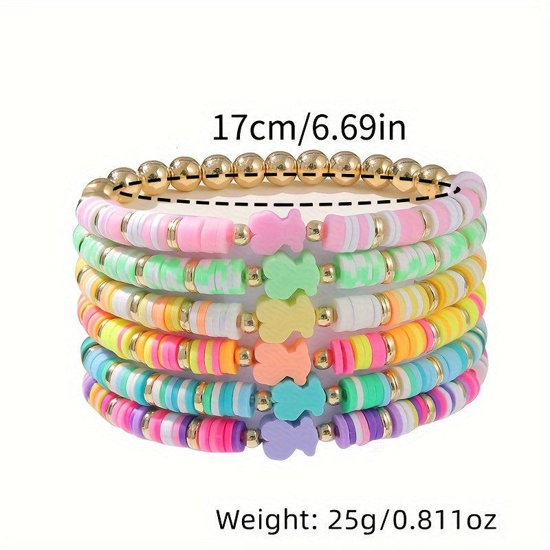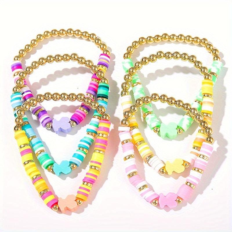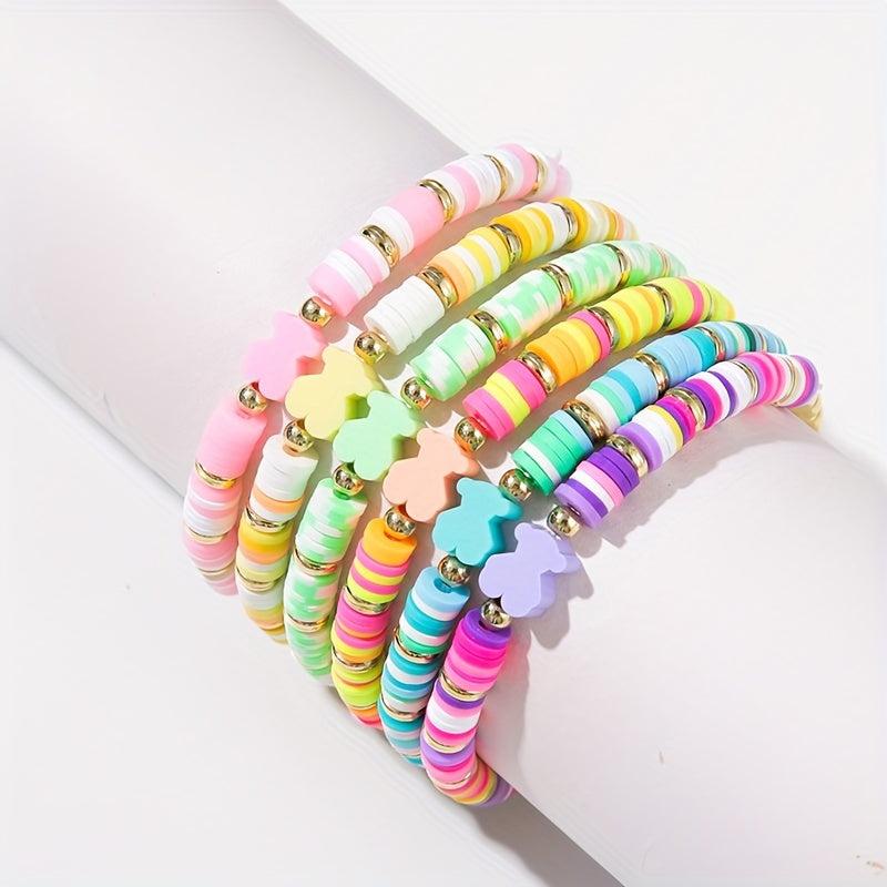 This 6-piece set features fresh spring colors and soft pottery design, perfect for daily wear, parties, and play. Add a pop of color to your outfit with these stacked bracelets.