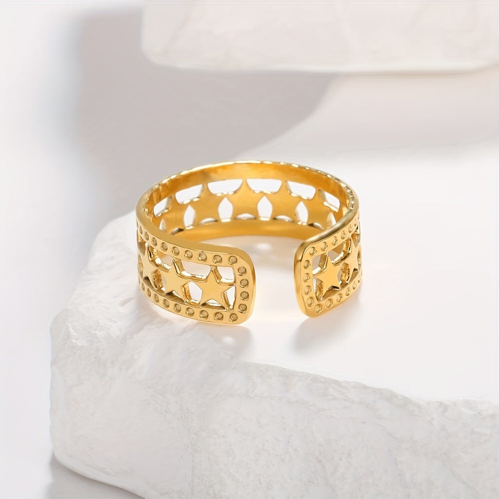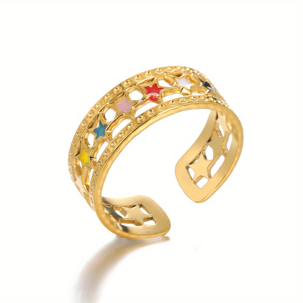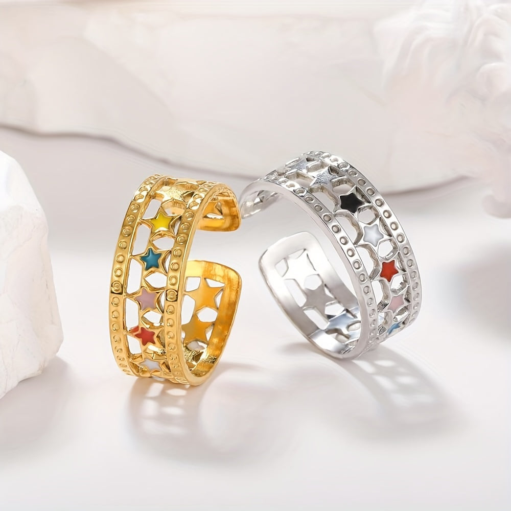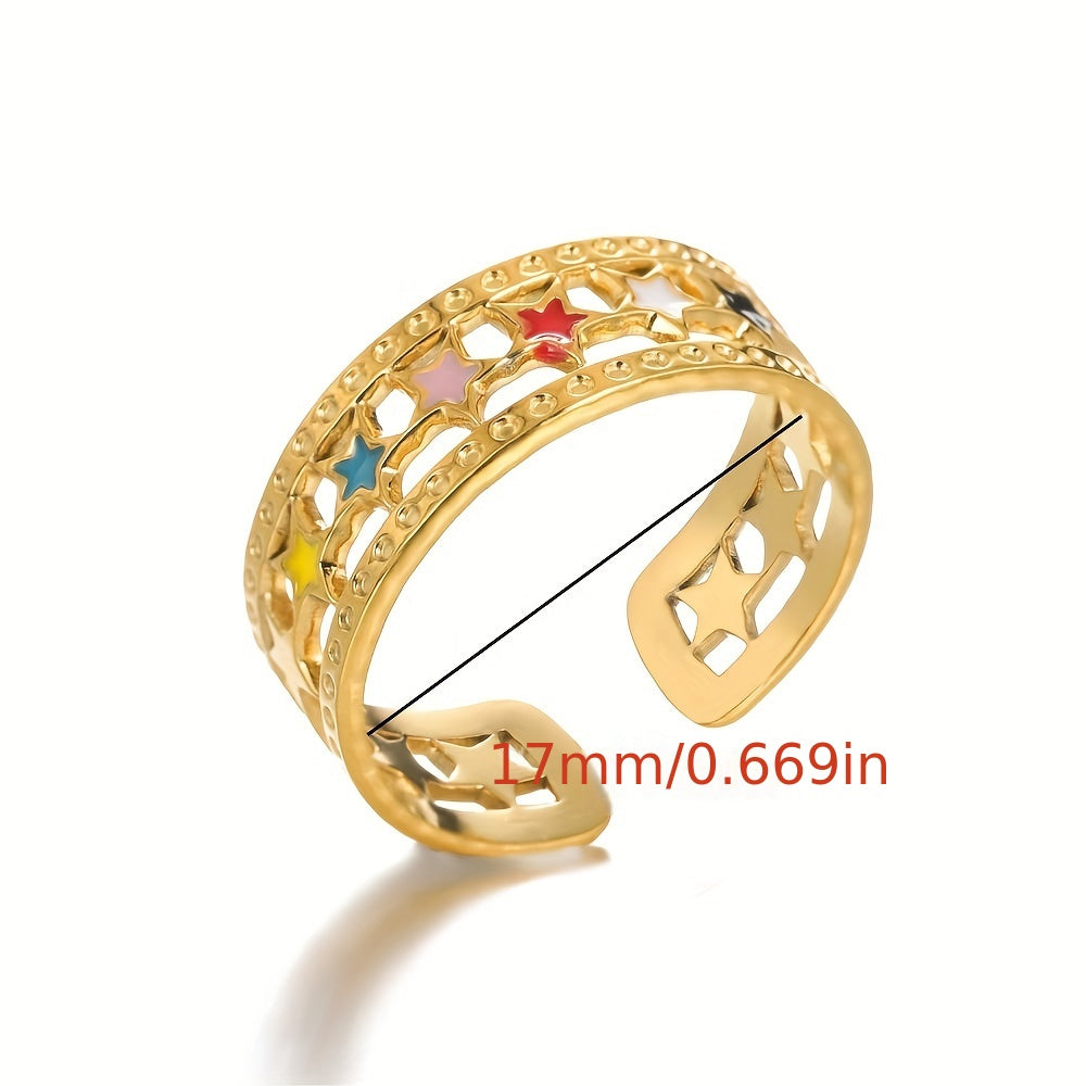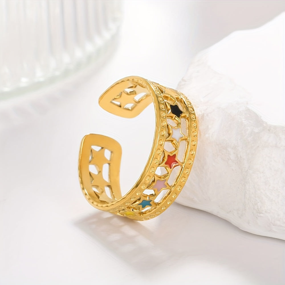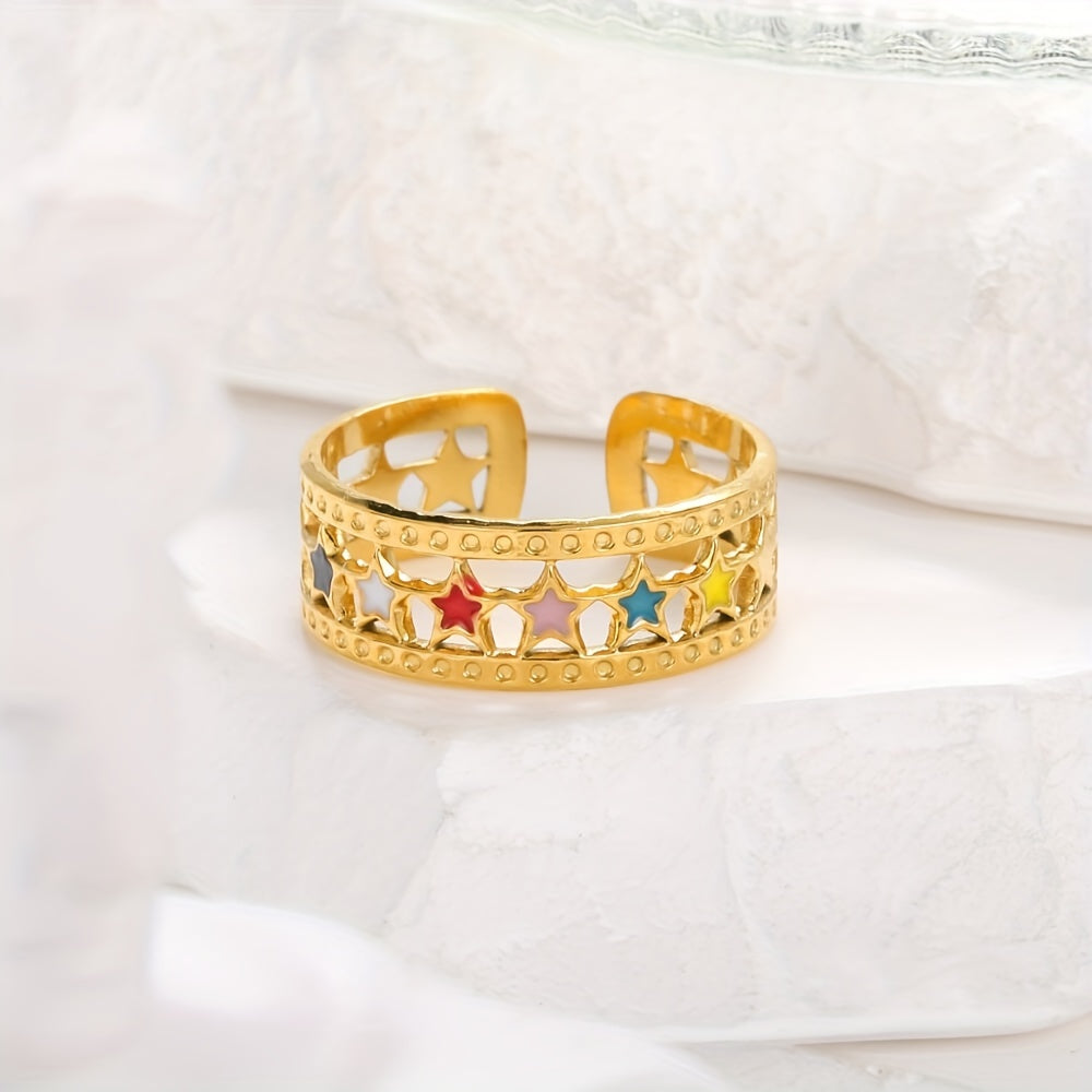 This wide cuff ring features a colorful star design and is made of stainless steel with 18k plated finish. It's a versatile accessory that can be worn with daily outfits or for special occasions.