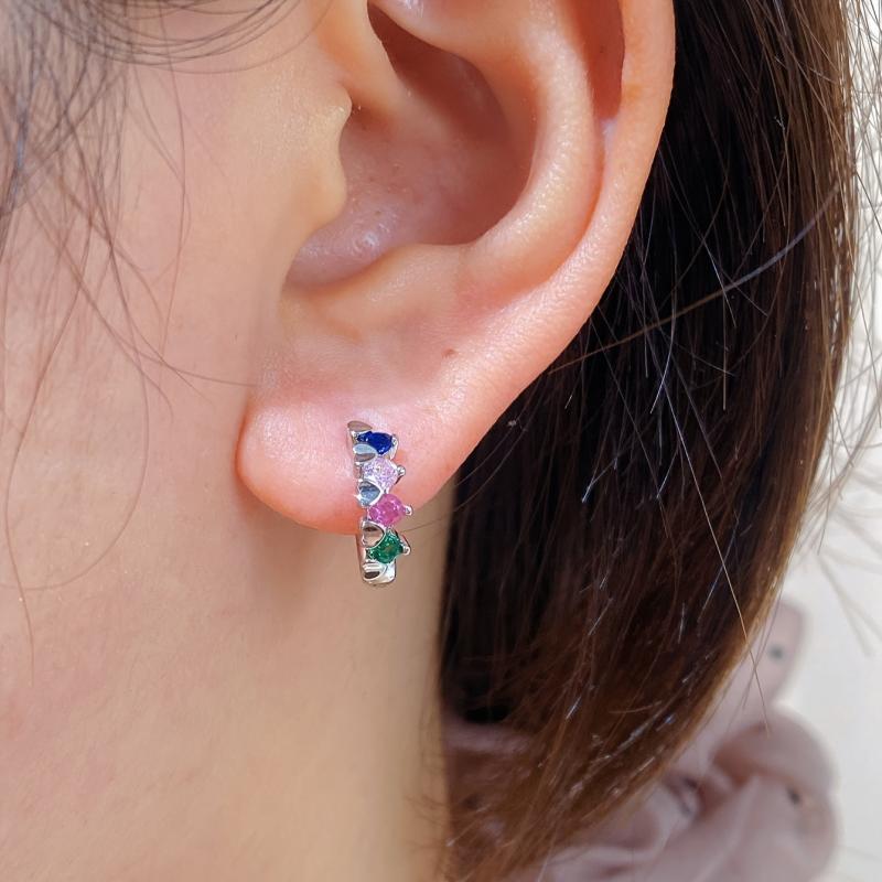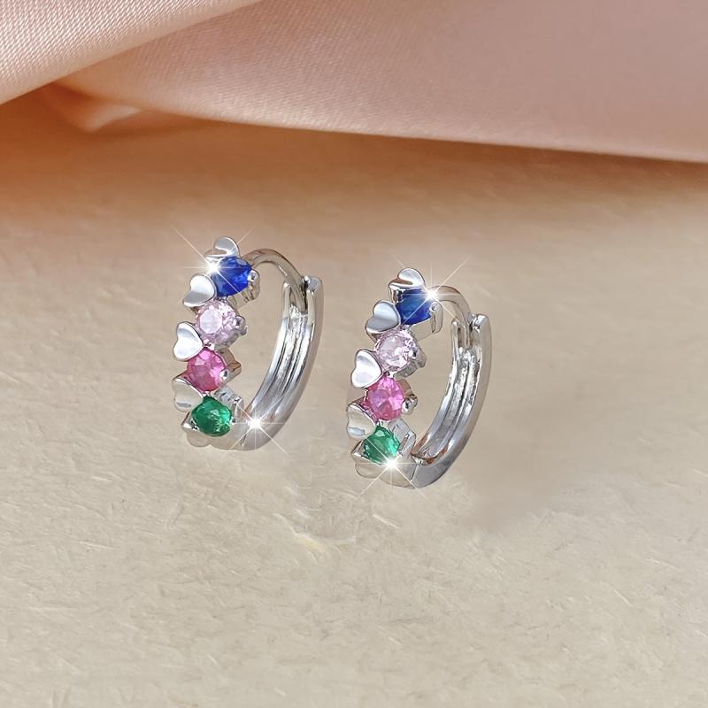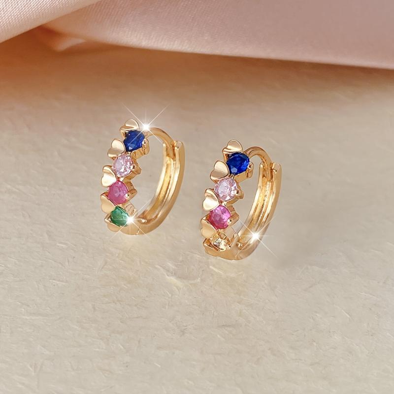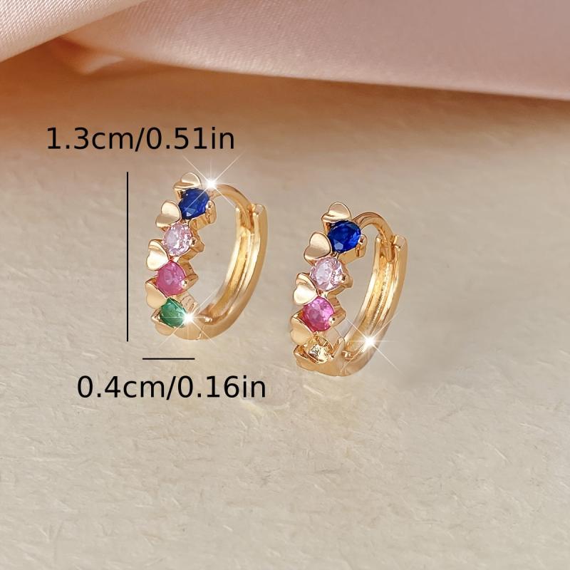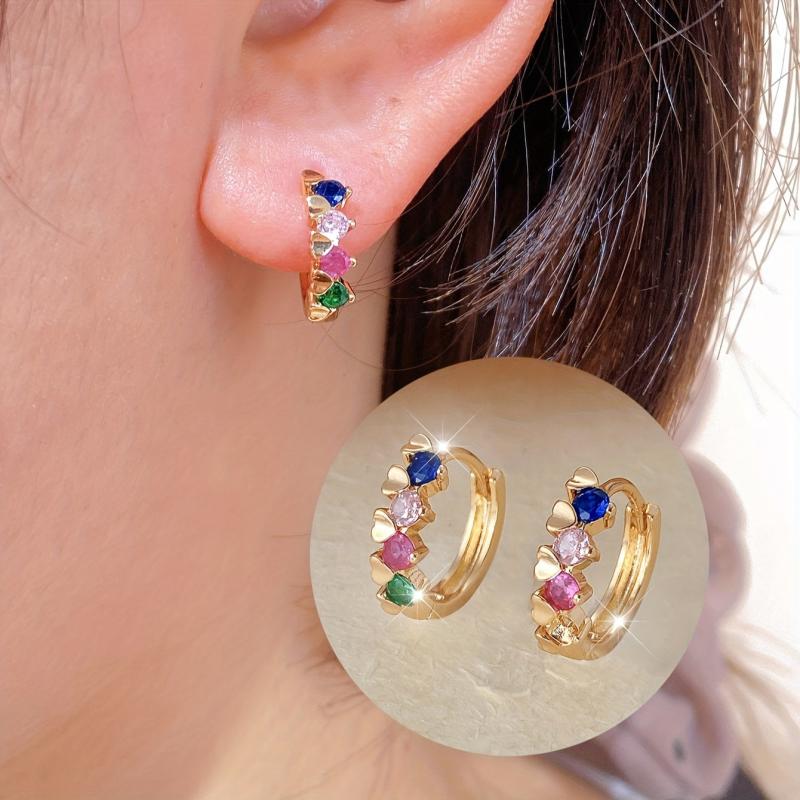 Adorn your ears with these stylish heart-shaped earrings featuring colorful zirconia stones. Perfect for a touch of charm and elegance.
