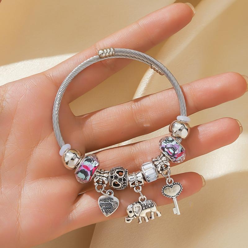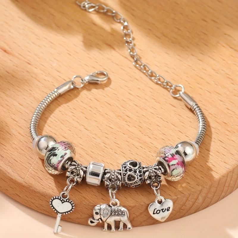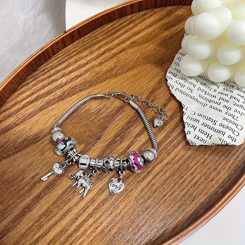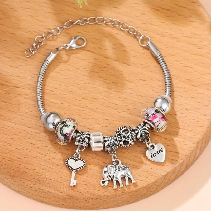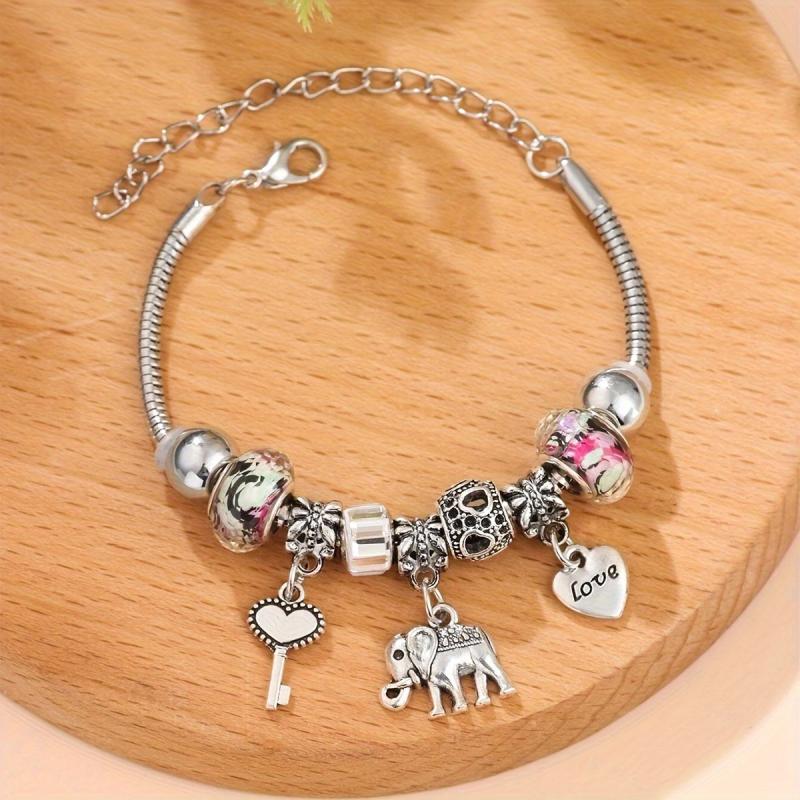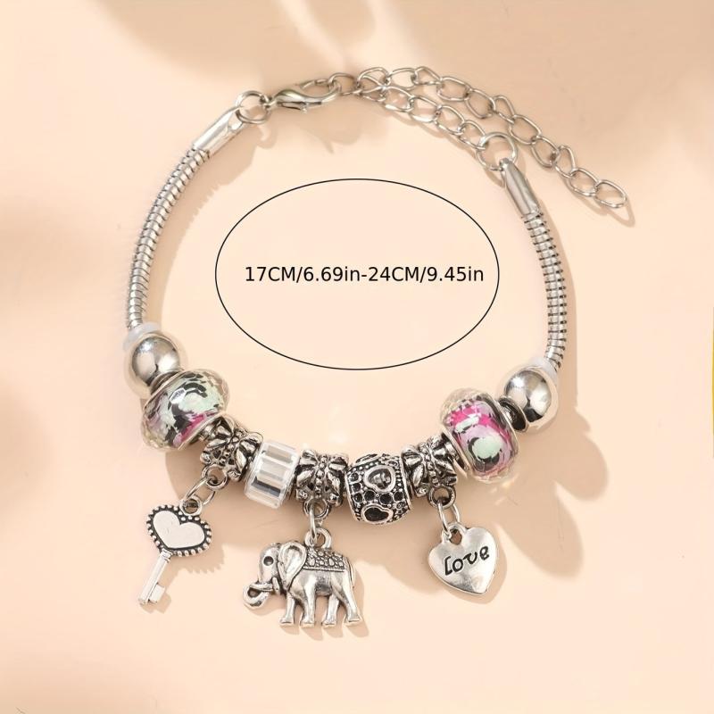 This adorable bracelet features a charming elephant, key, and heart pendant design. Made of zinc alloy, silver-plated for a timeless look. Perfect gift for women.