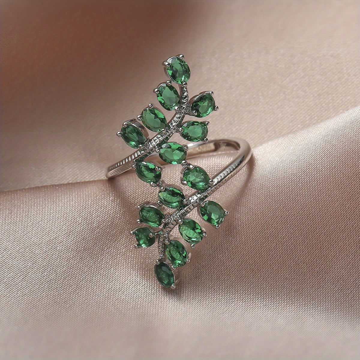 Stunning emerald green zircon leaf shape wedding ring designed for ladies, perfect for engagements and special occasions.