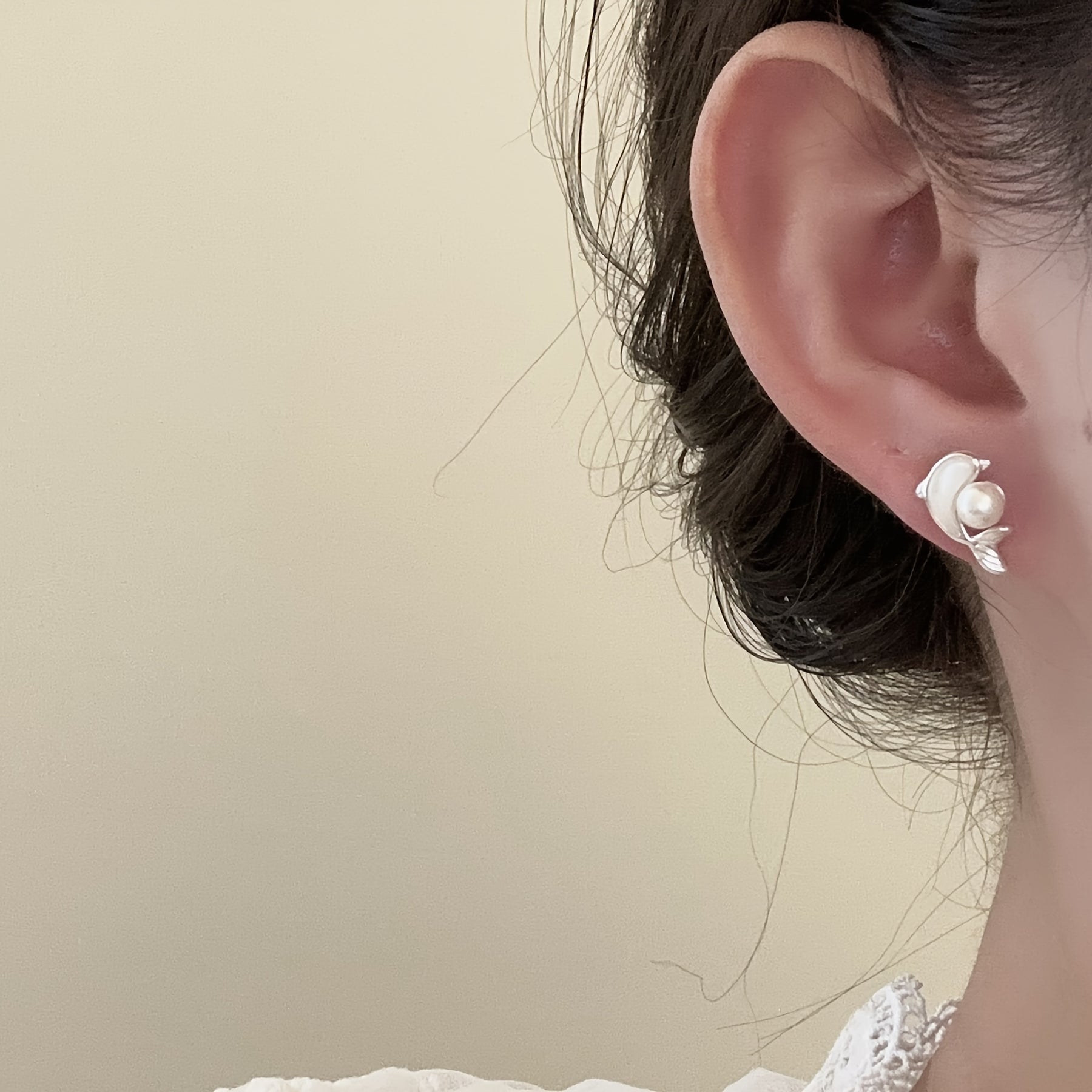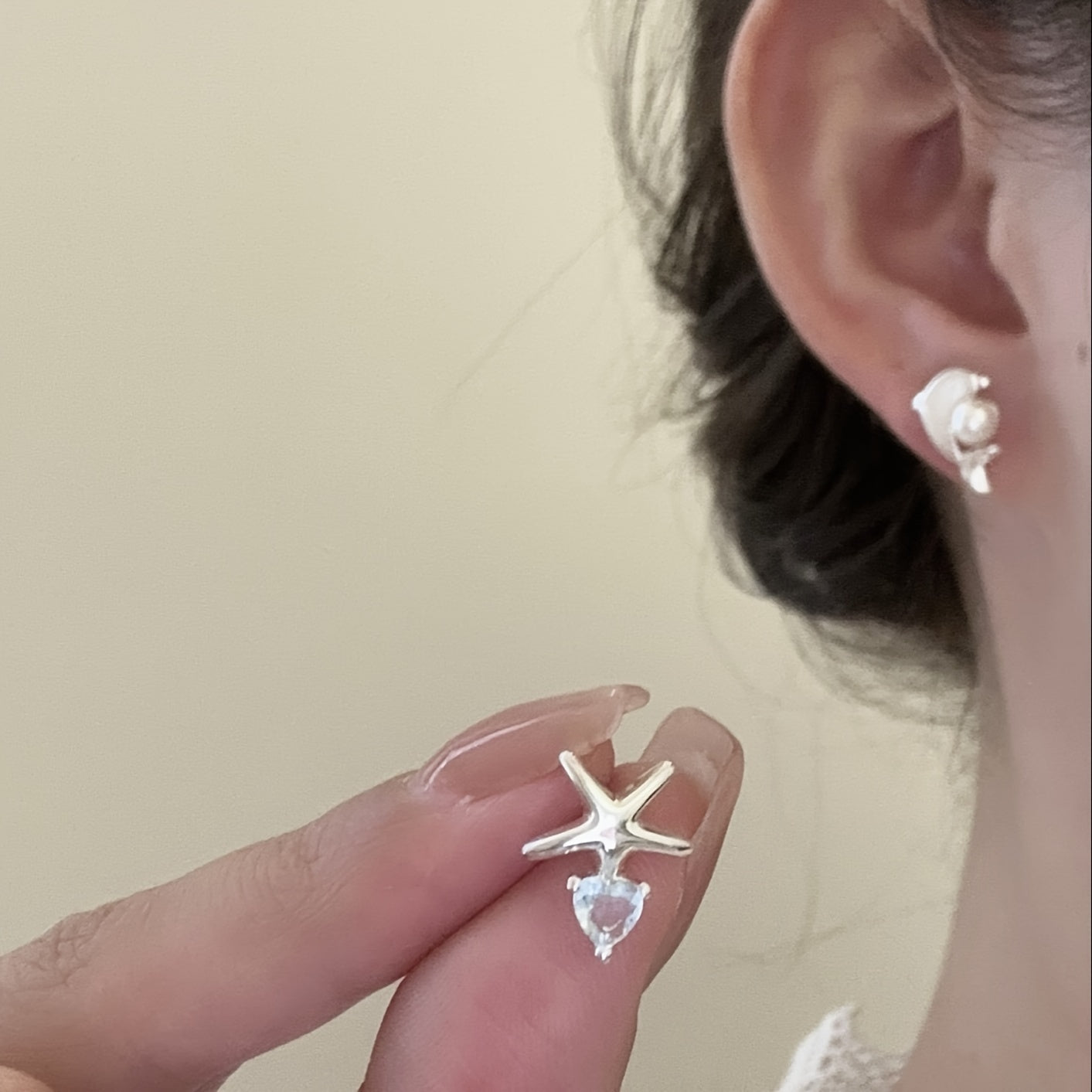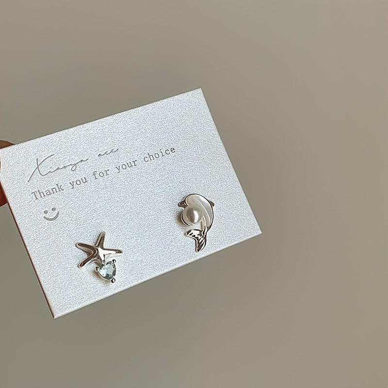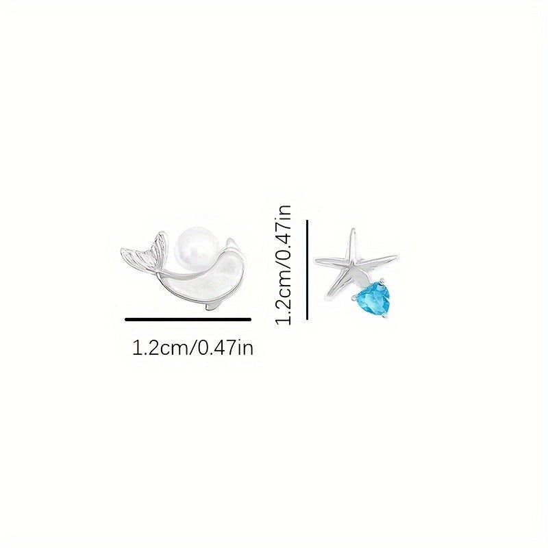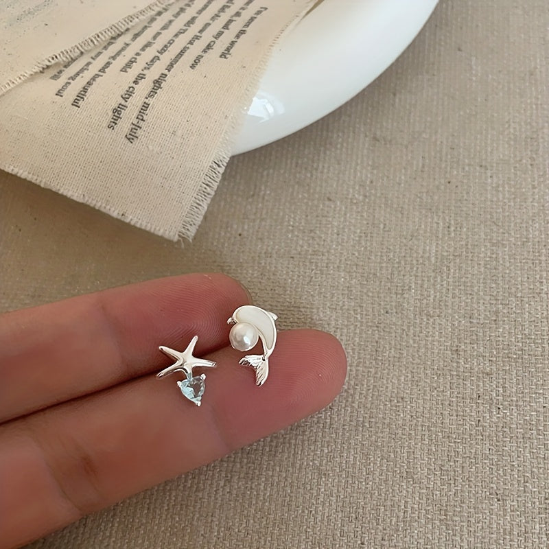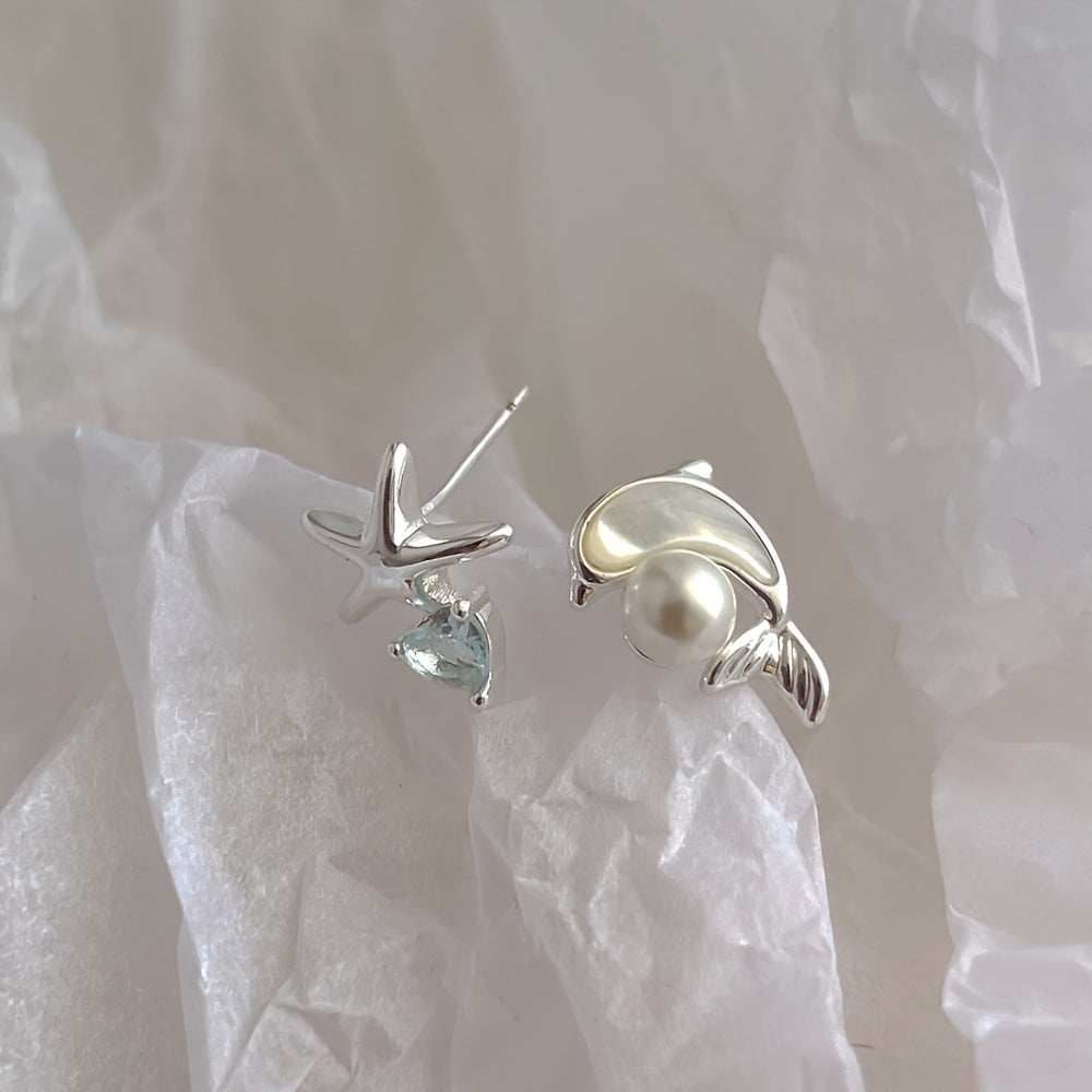 Elegant asymmetrical earrings featuring a starfish and dolphin design with imitation pearls. Made of copper with 925 sterling silver posts, suitable for daily wear and music occasions all year round.