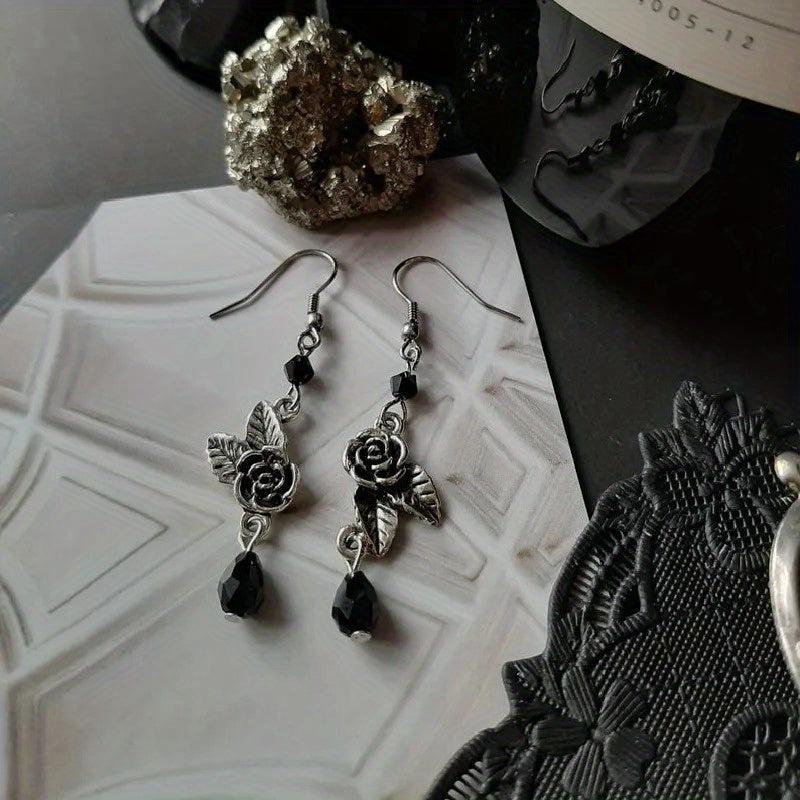 These romantic dark earrings are perfect for a witchy goddess. They feature a gothic design with roses and crystals, ideal for women who love vintage jewelry.