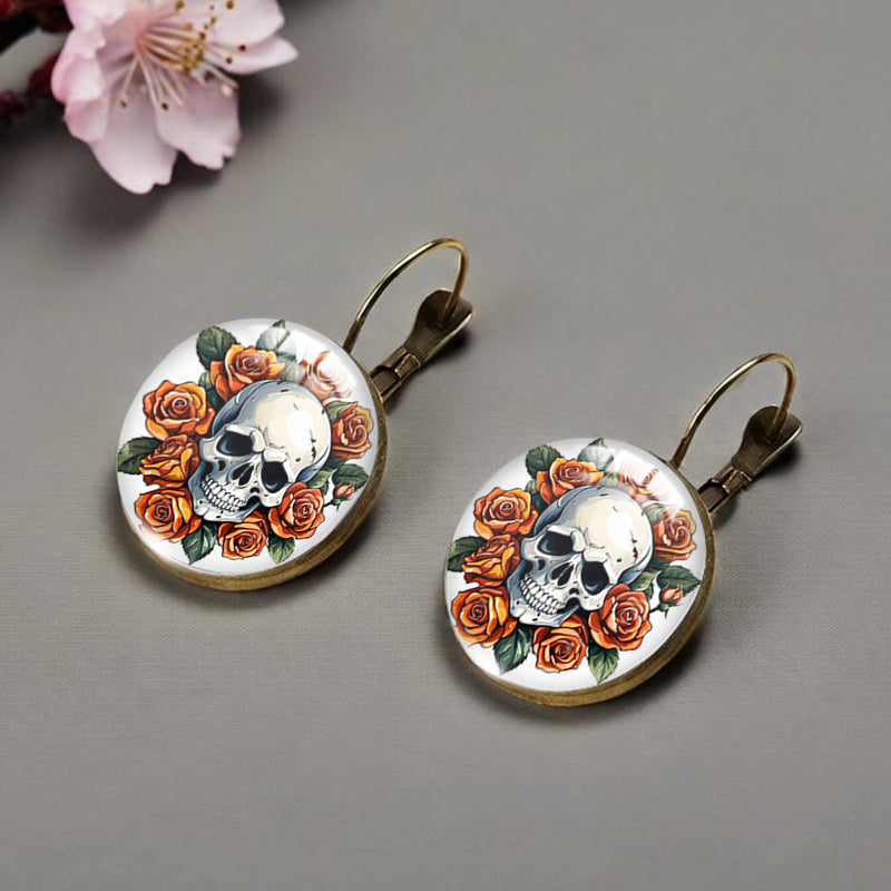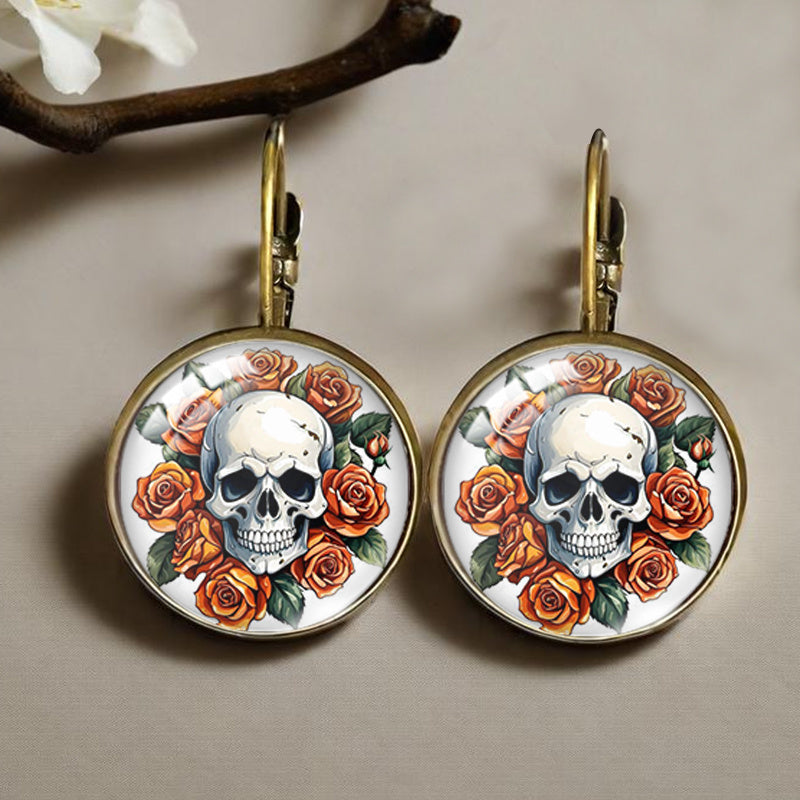 Add a touch of bohemian style to your daily wear with these unique Gothic Skull & Roses round glass earrings. Featuring orange roses and a skull design, these vintage copper plated iron hoop earrings are sure to make a statement.
