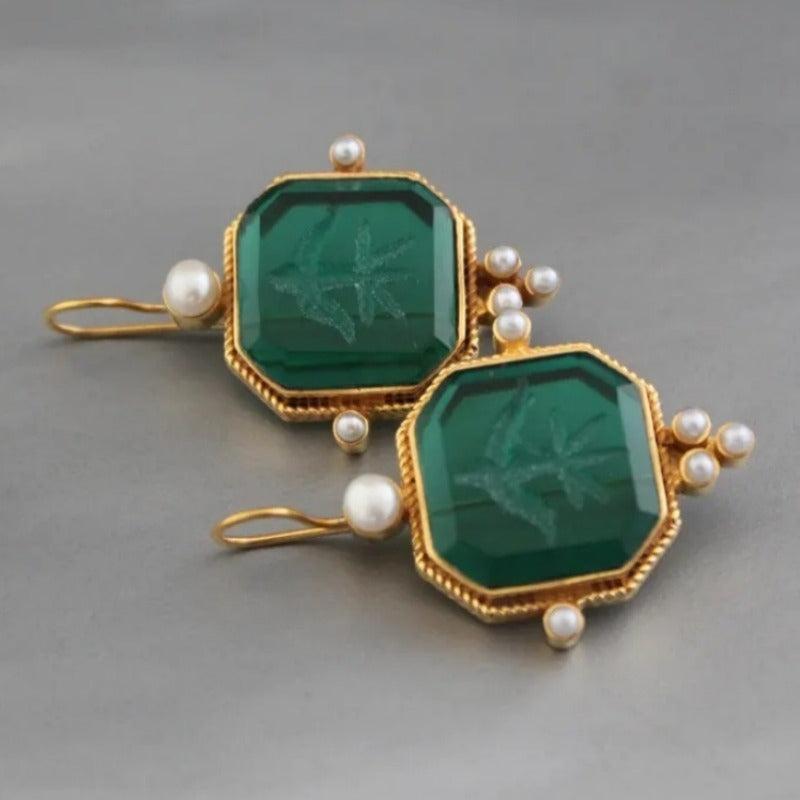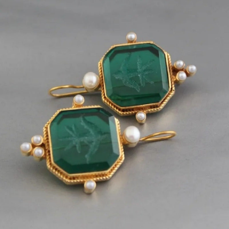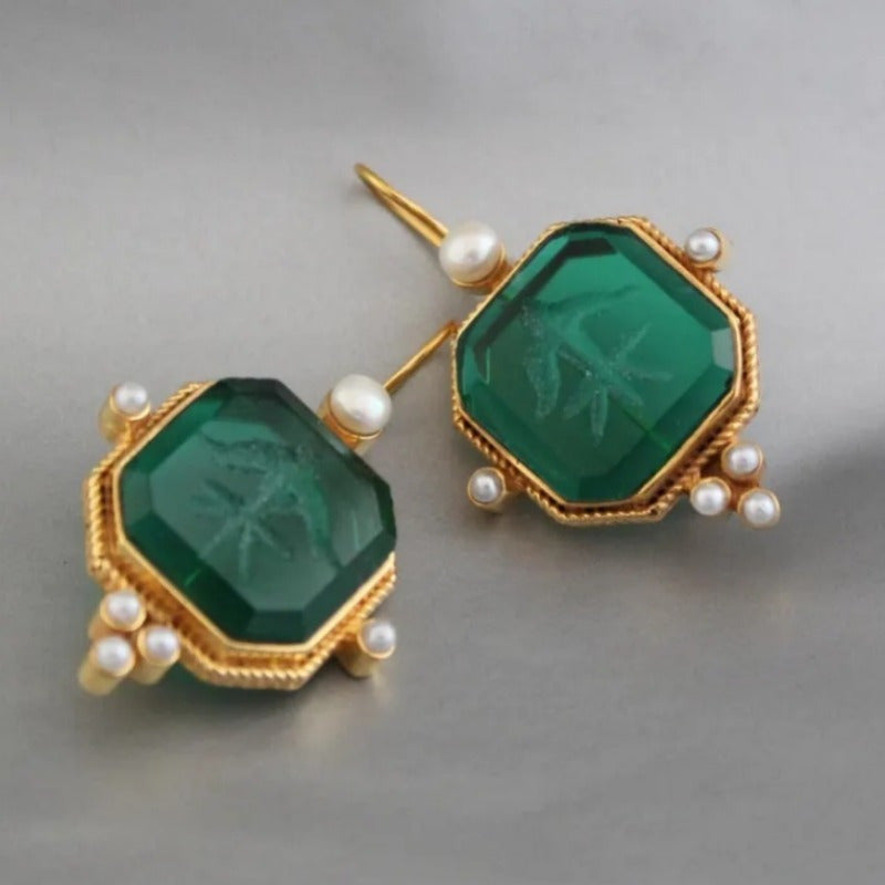 Intaglio Green Gemstone Earrings with Pearl Accents Vintage Bohemian Style
