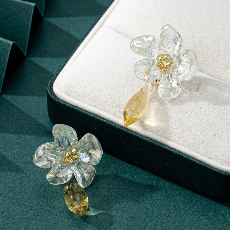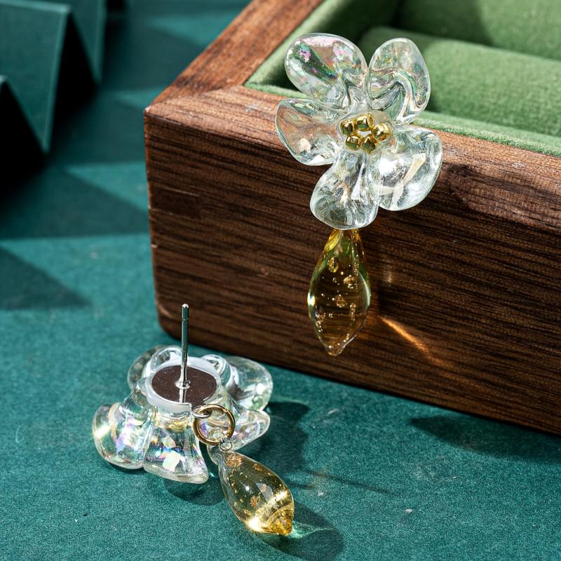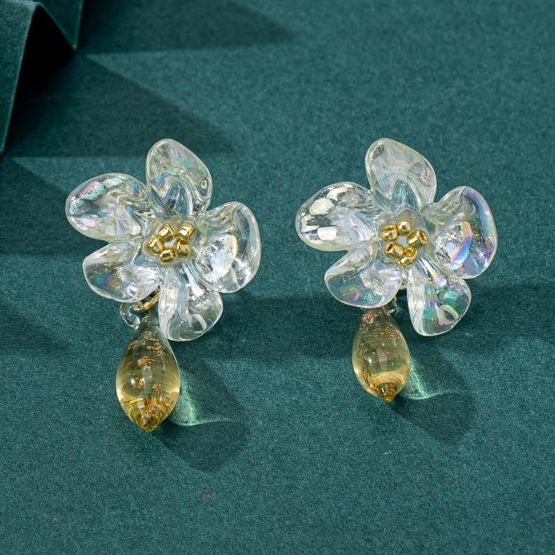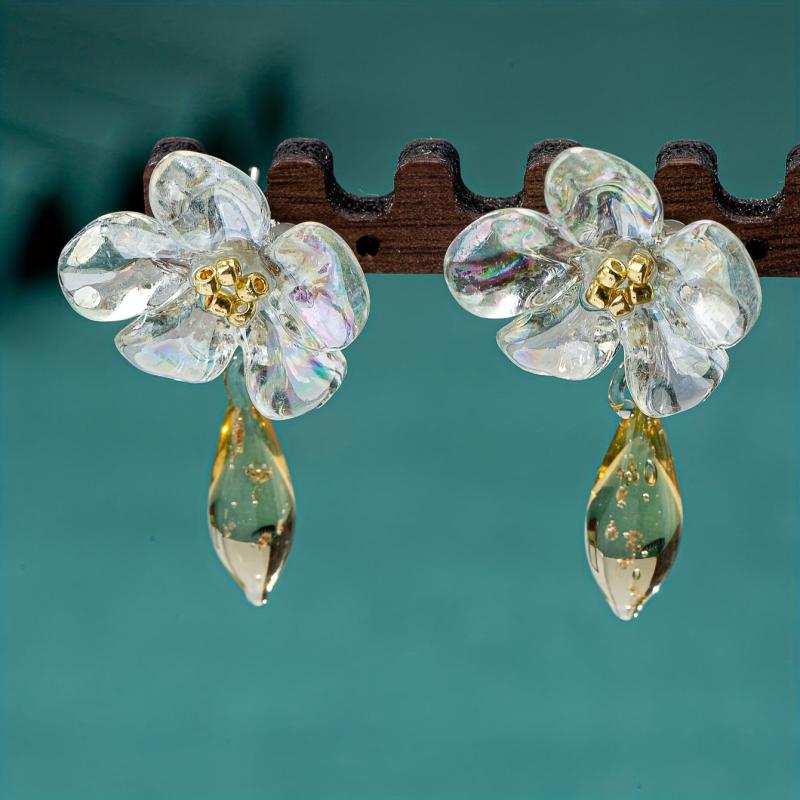 These minimalist earrings are crafted with transparent flower designs and golden accents. They are versatile for daily wear or parties all year round.
