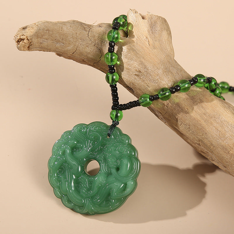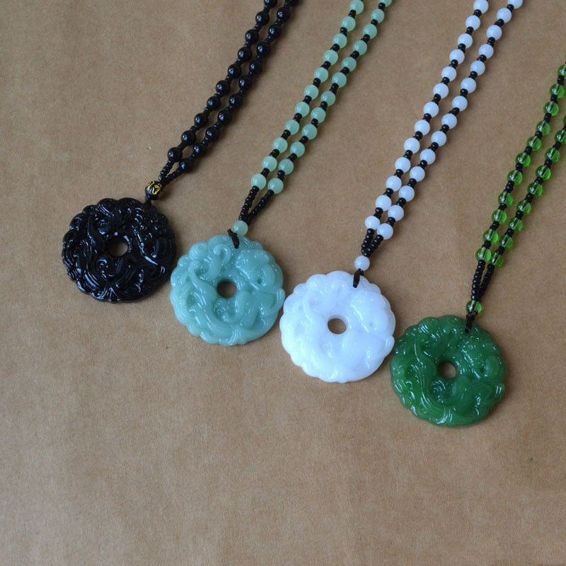 This pendant necklace features a lucky donut design with a green glass stone bead on a sweater chain. It is adjustable to 59 inches, making it suitable for both men and women. This necklace is a great everyday accessory and makes a perfect gift for any occasion.