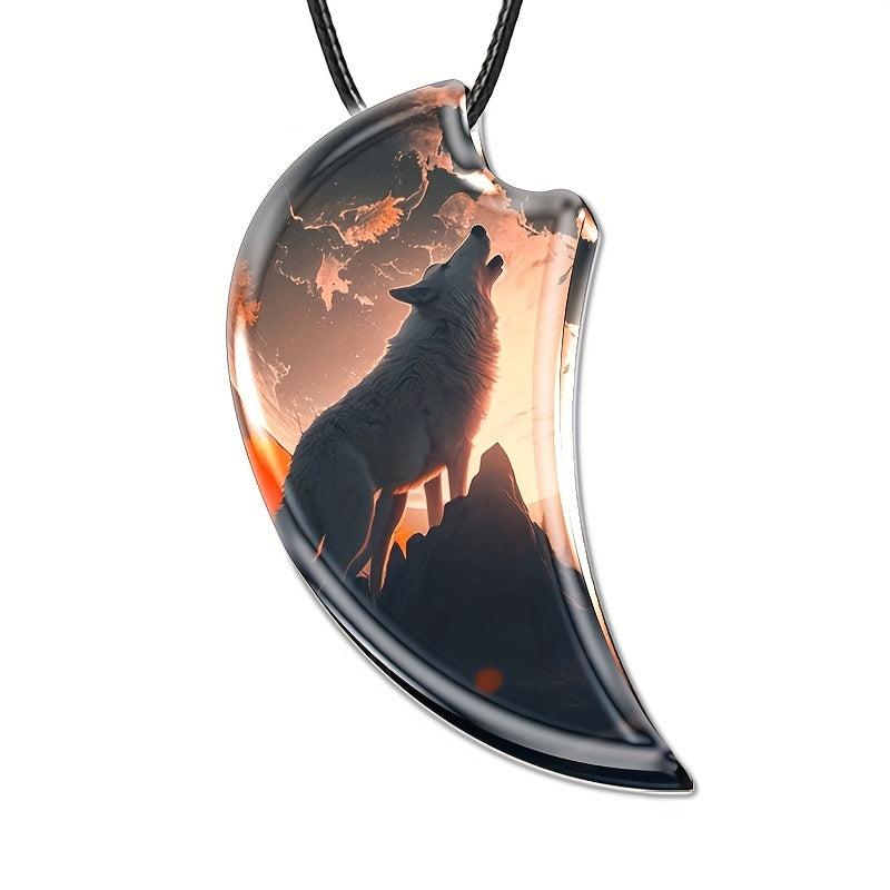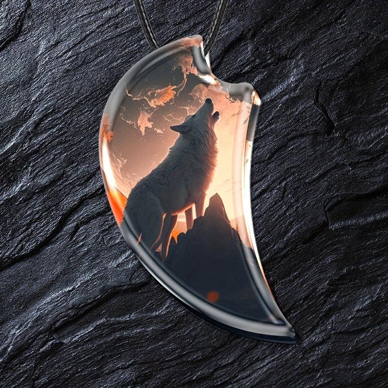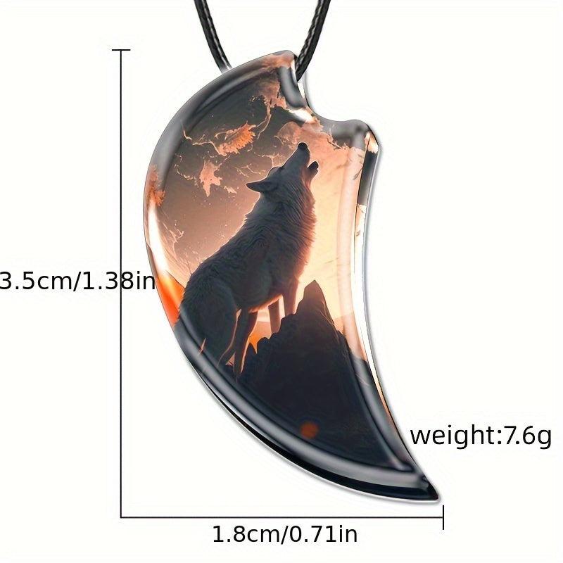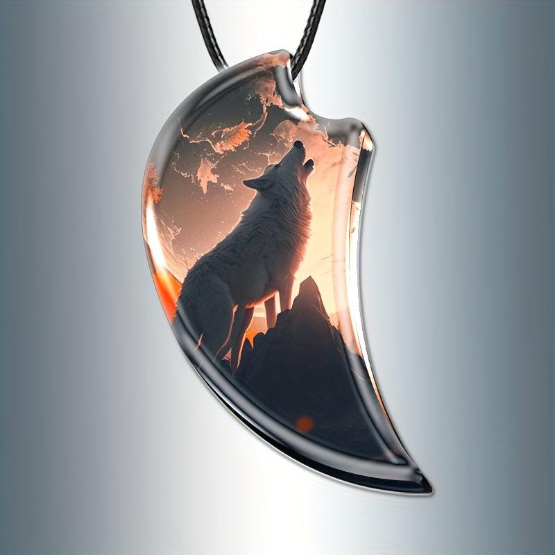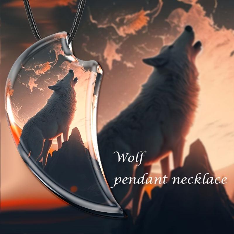 Men's Howling Wolf Necklace Crescent Moon Pendant with Dual Wolf High Clear Glas