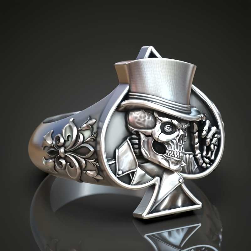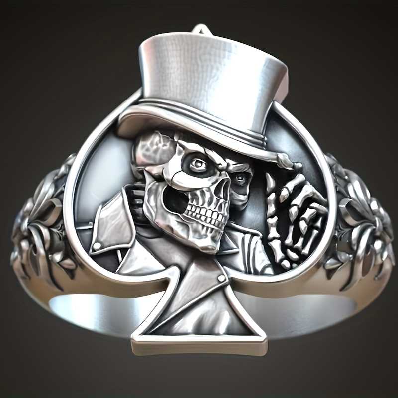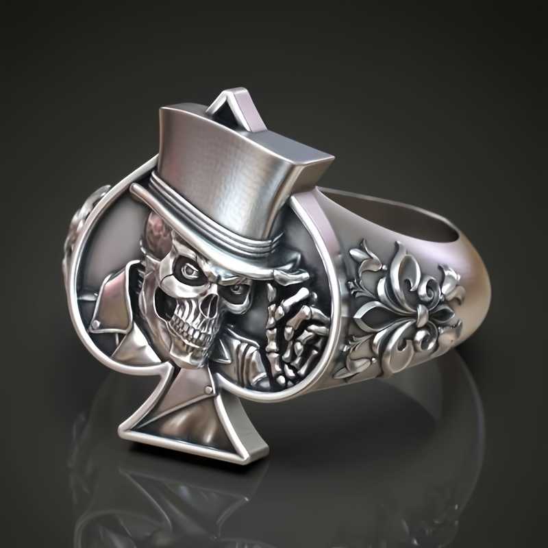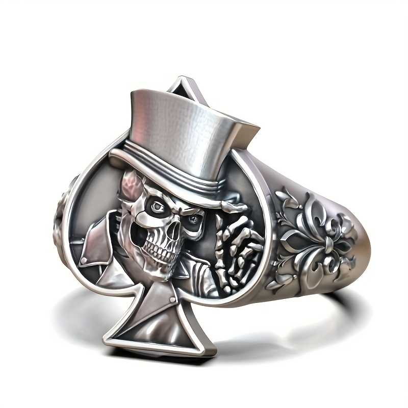 Men's Silver Plated Skull Ring With Floral Carving And Spades Design