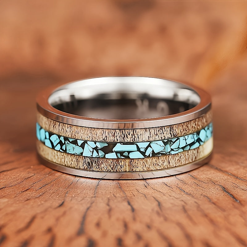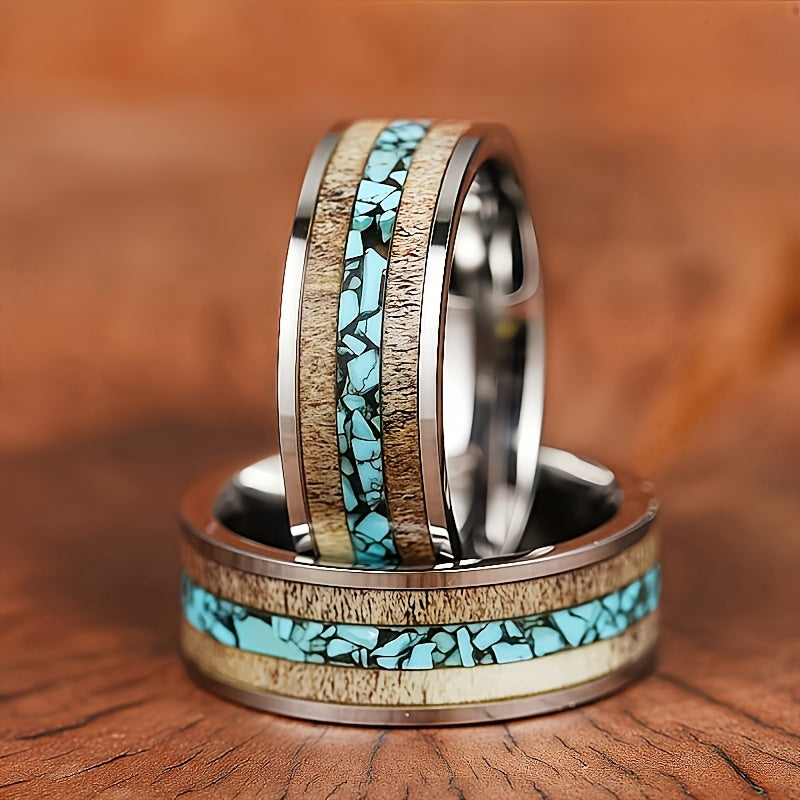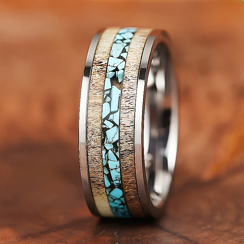 This stylish ring features deer horn design with crushed turquoise inlay, perfect for wedding or party celebrations.