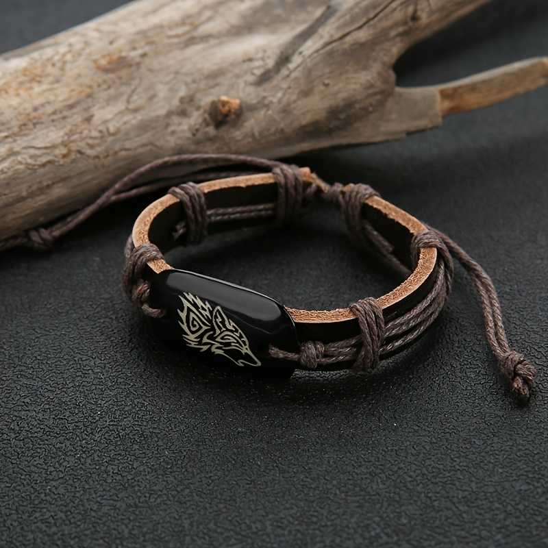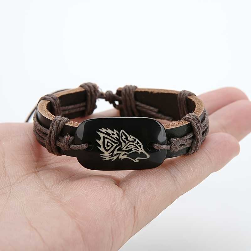 Men's Vintage Braided Leather Rope Bracelet with Wolf Logo
