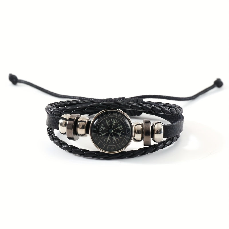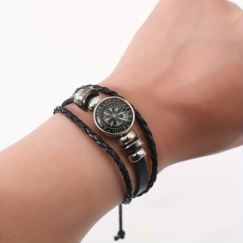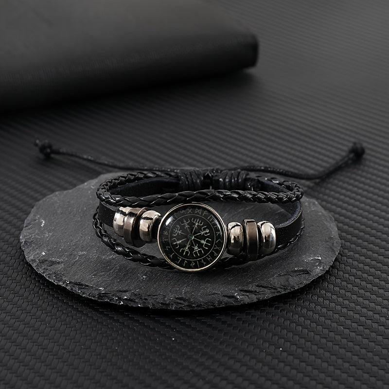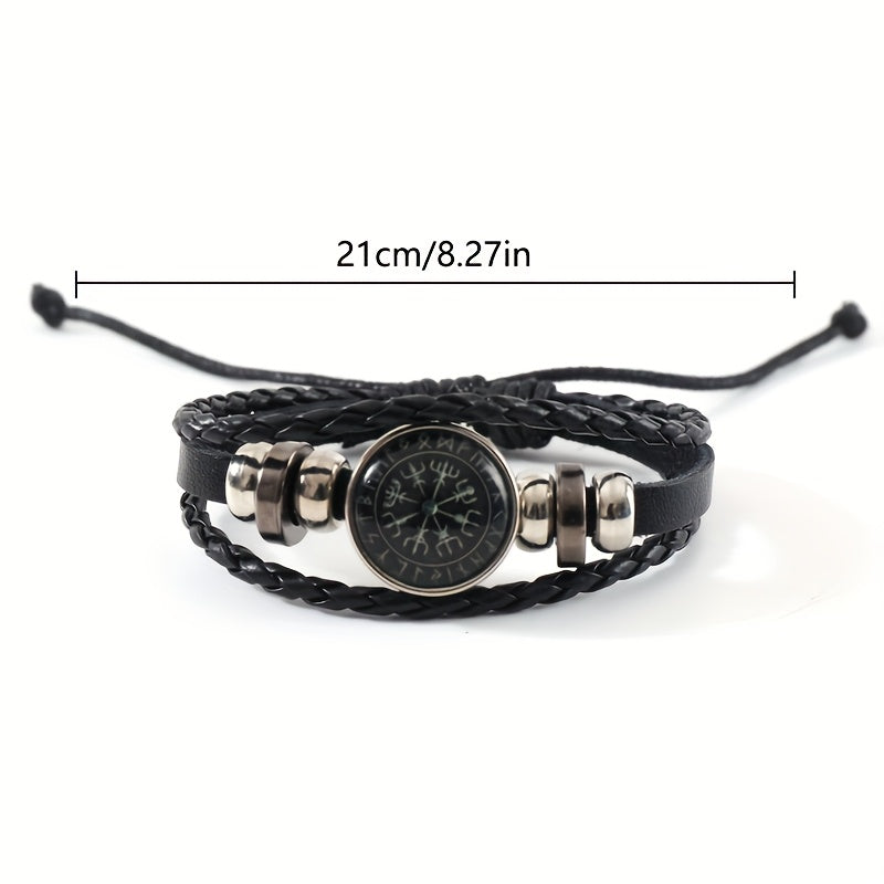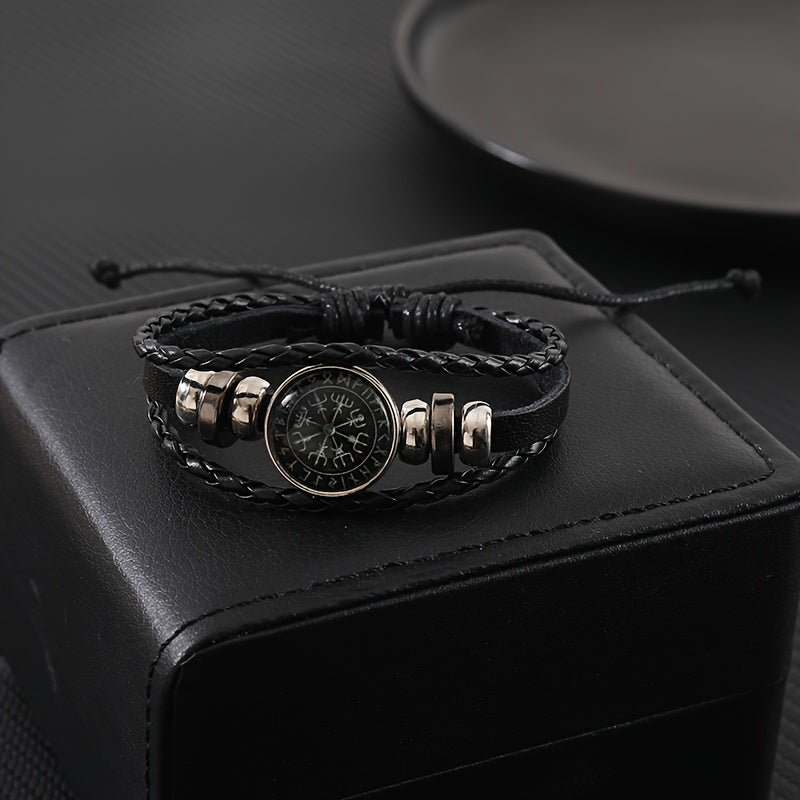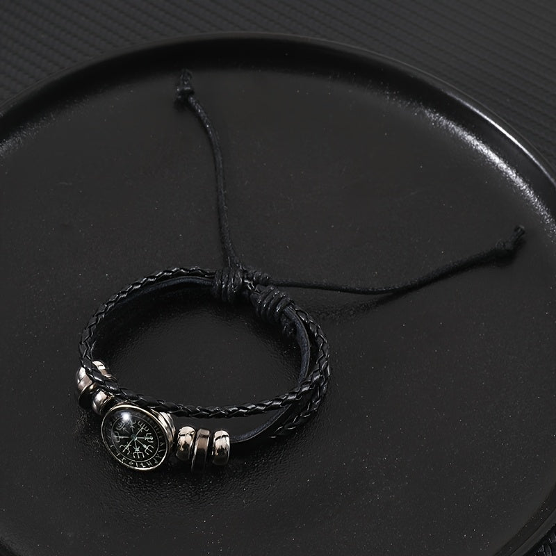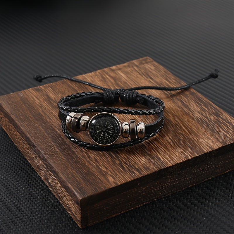 Men's Vintage Punk Style Beaded Bracelet with Compass Pattern & Leather Accents