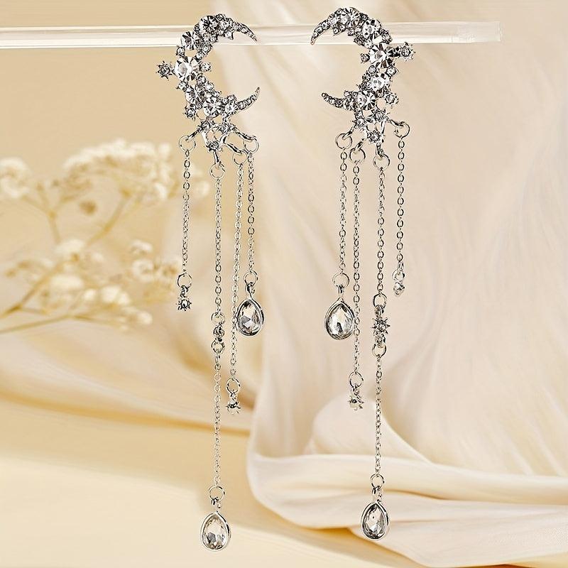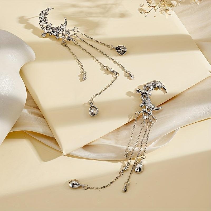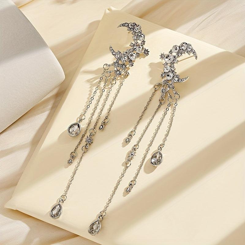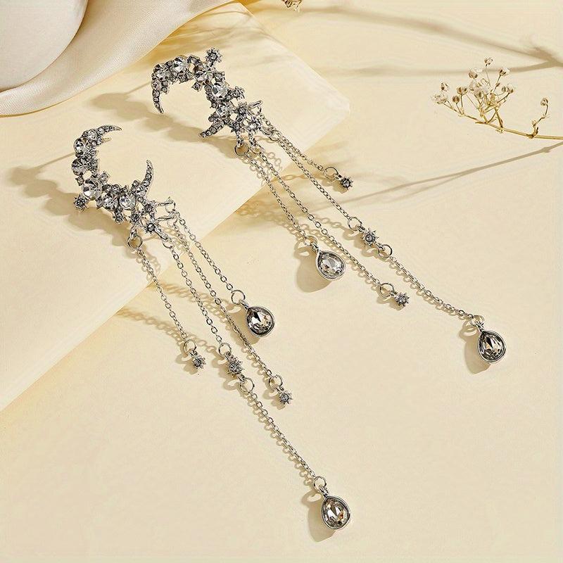 These elegant moon shaped dangle earrings feature rhinestone inlaid silvery design. Perfect accessory for weddings and parties.