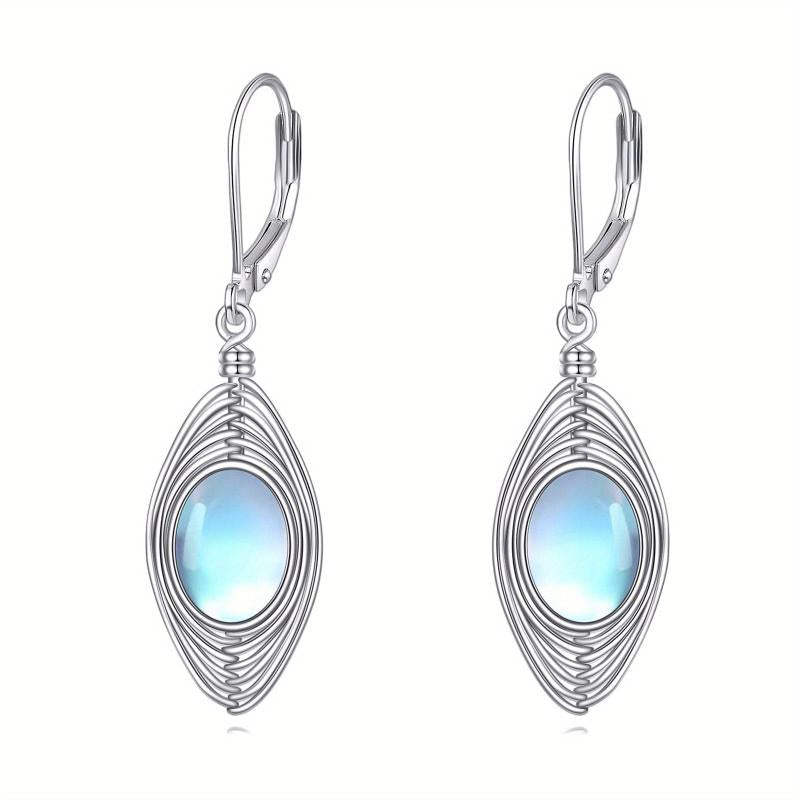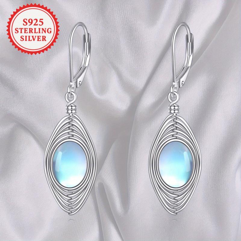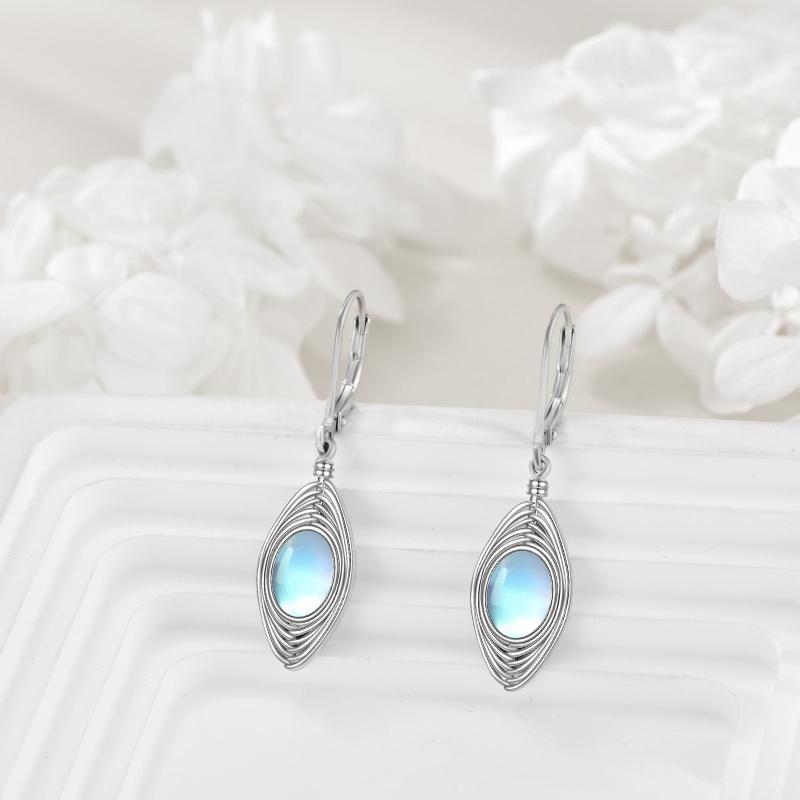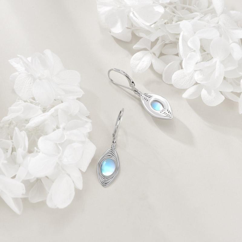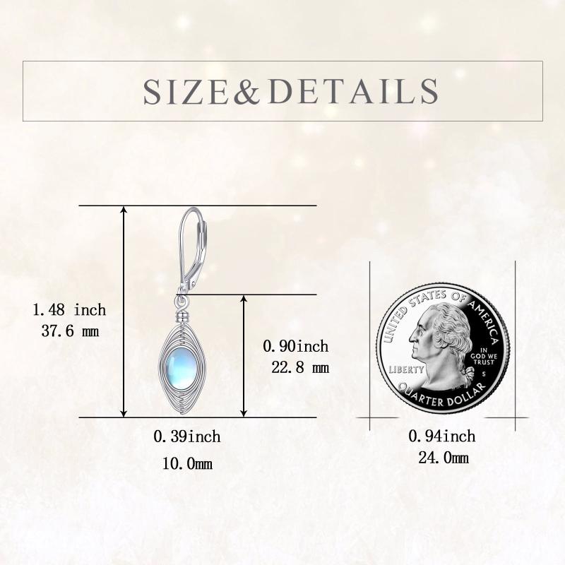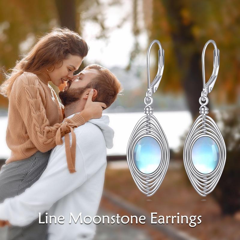 These exquisite dangle drop earrings feature synthetic moonstones set in 925 sterling silver leverback design. Perfect birthday gift for her.