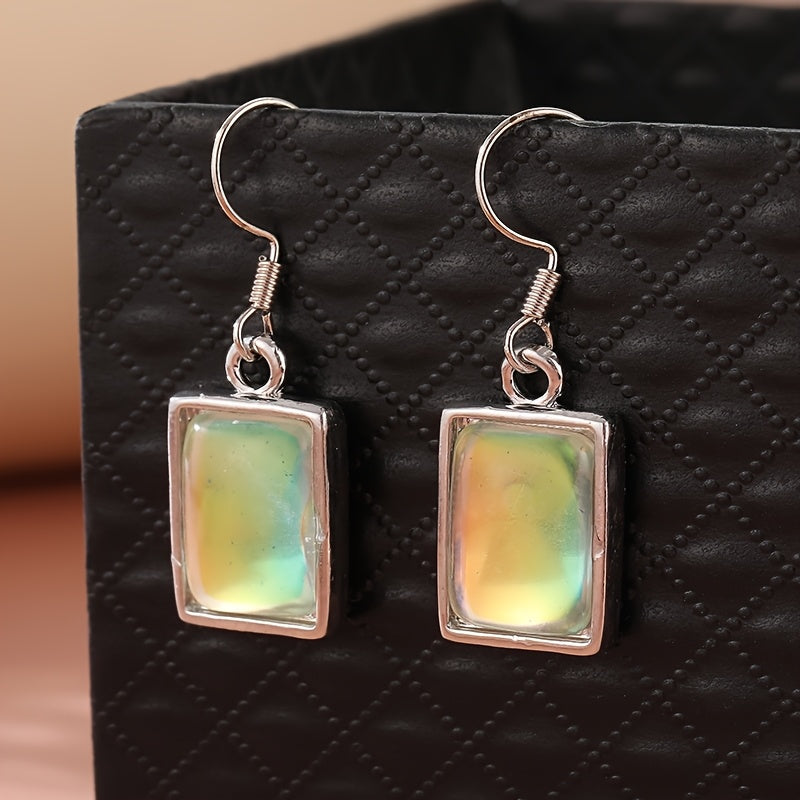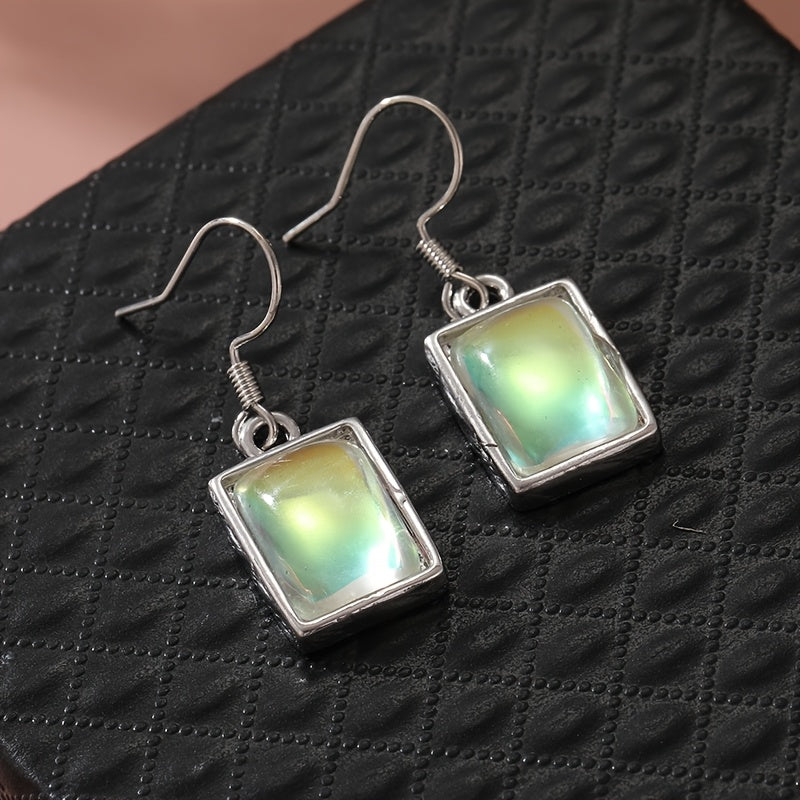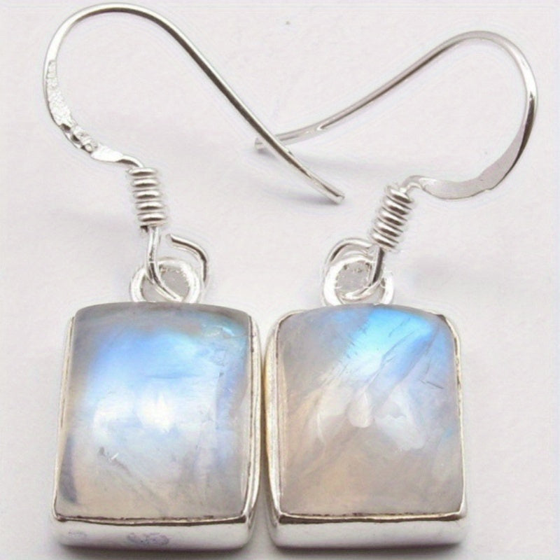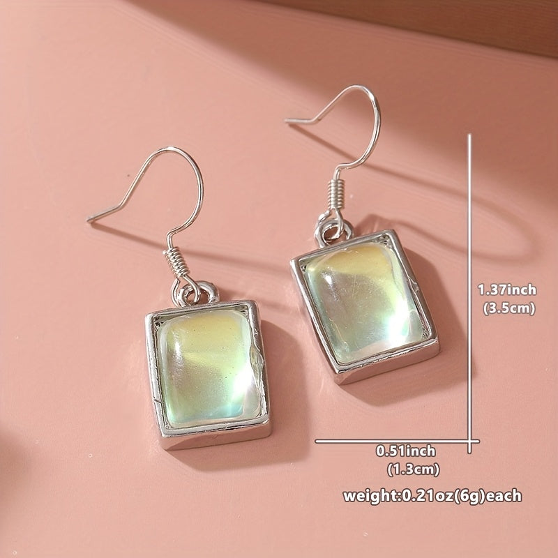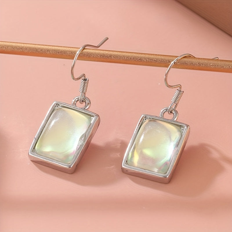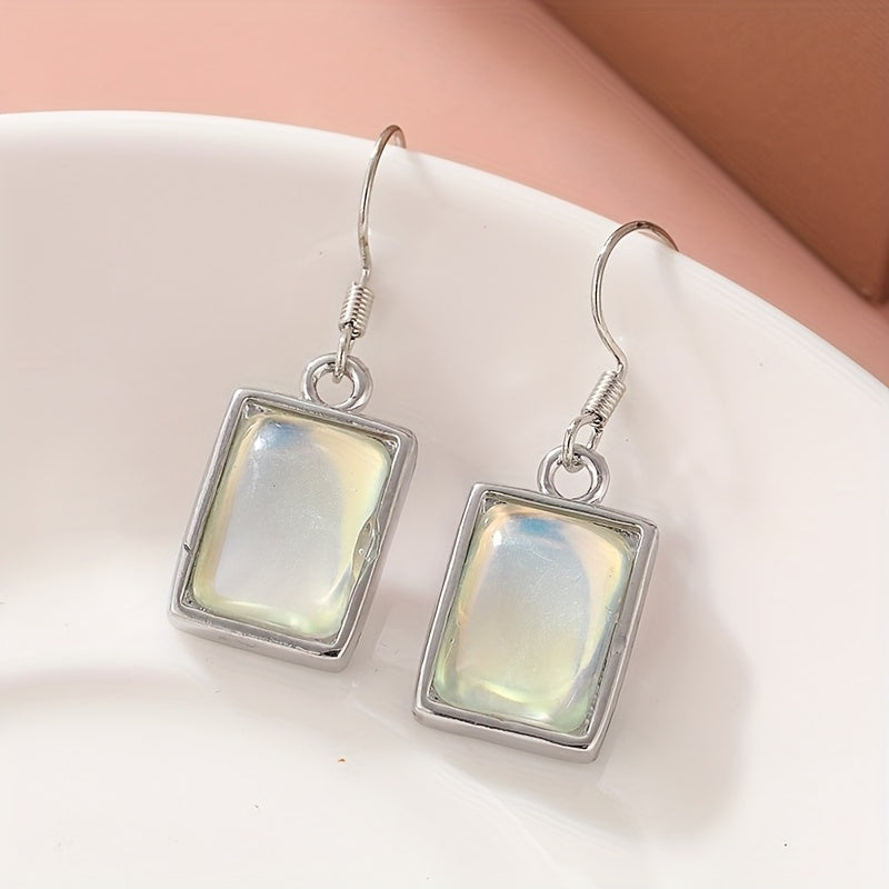 Square silvery earrings with synthetic moonstone pendants, ideal for casual attire and gifting. Perfect for everyday wear.