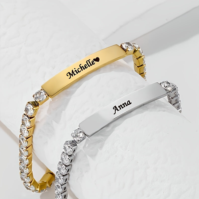 This custom engraved bracelet features a stunning diamond inlay on durable titanium steel. Make a statement with a personalized touch.